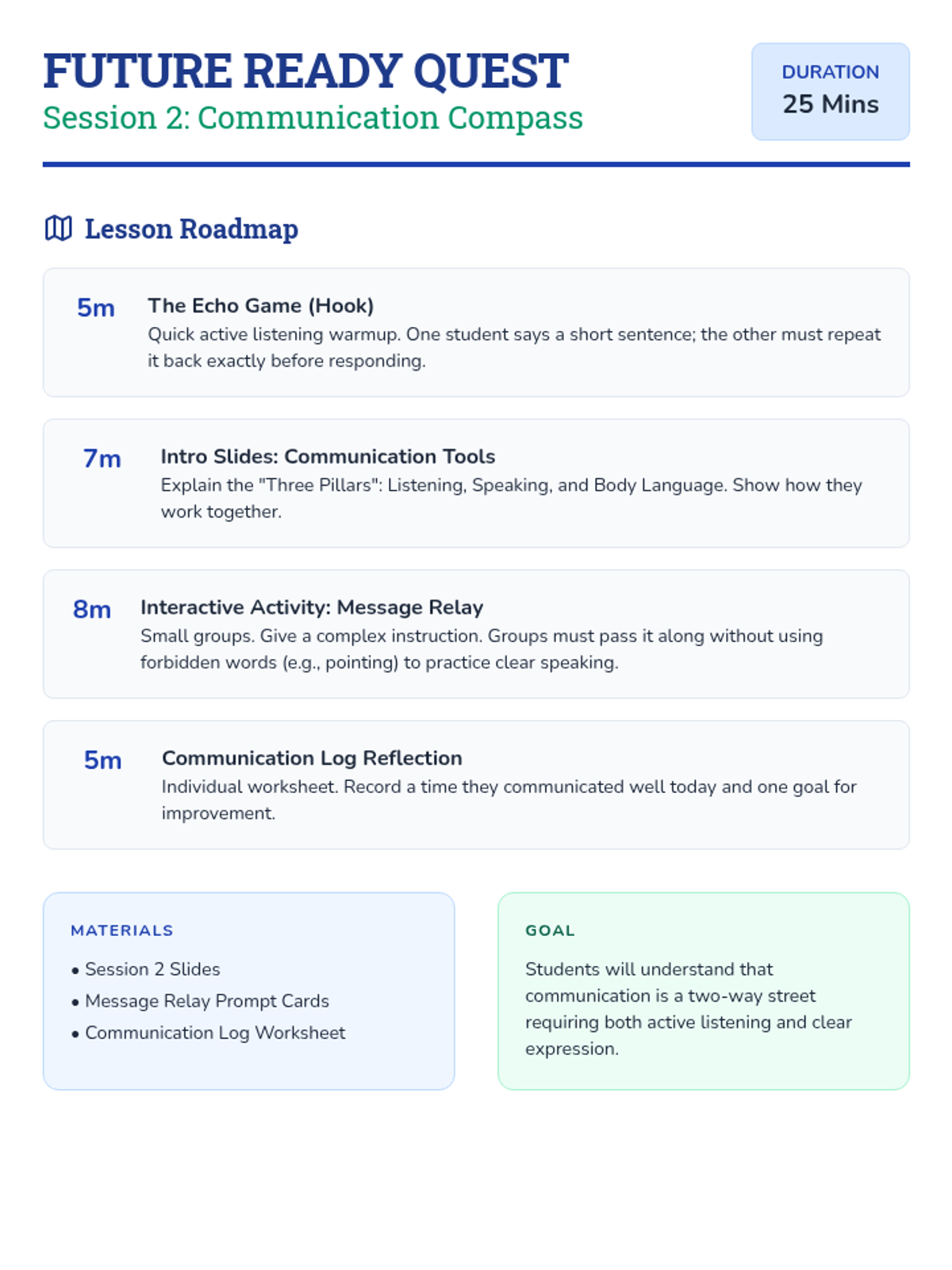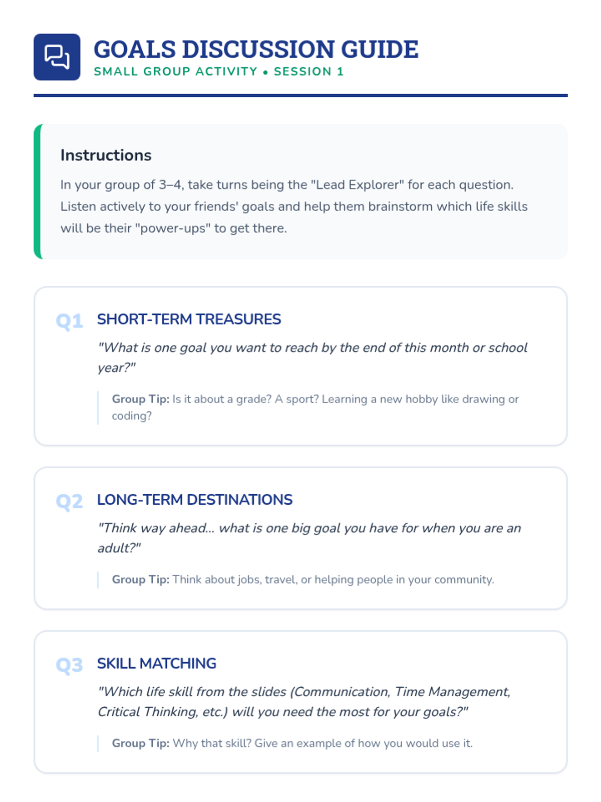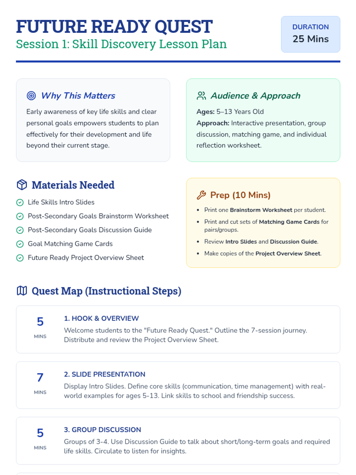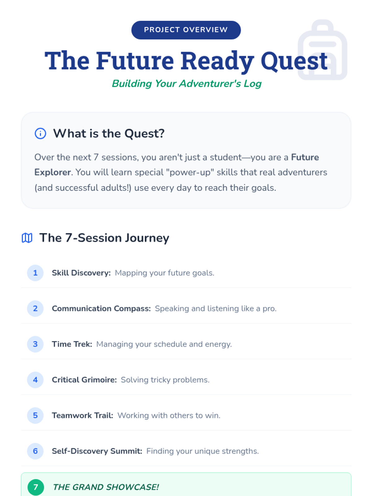 A 7-session adventure-themed series for students aged 5-13 to explore essential life skills like communication, time management, and self-awareness to prepare for future transitions.