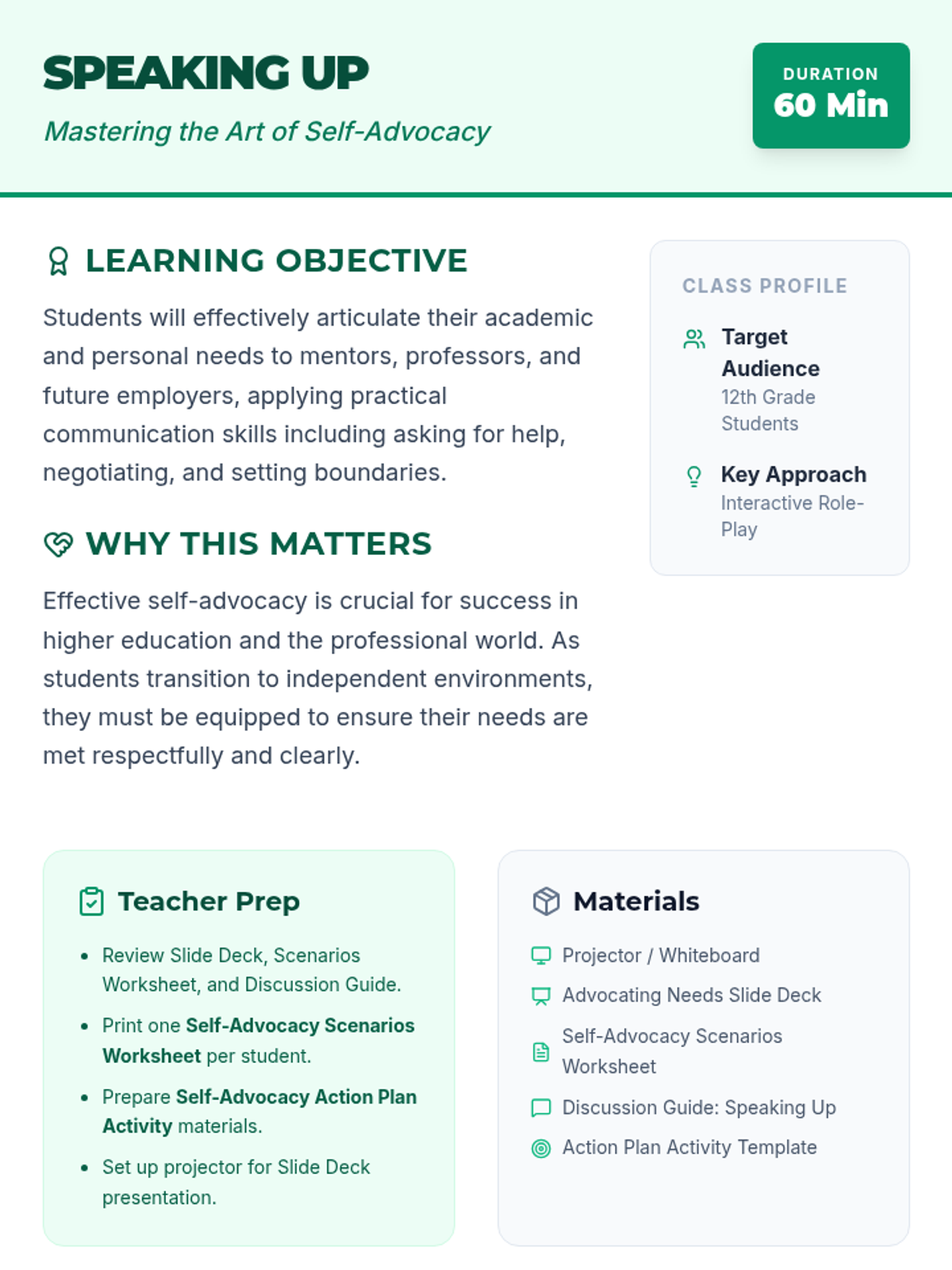 A comprehensive sequence designed to prepare high school students for their digital and professional futures, covering online presence management and essential self-advocacy skills.