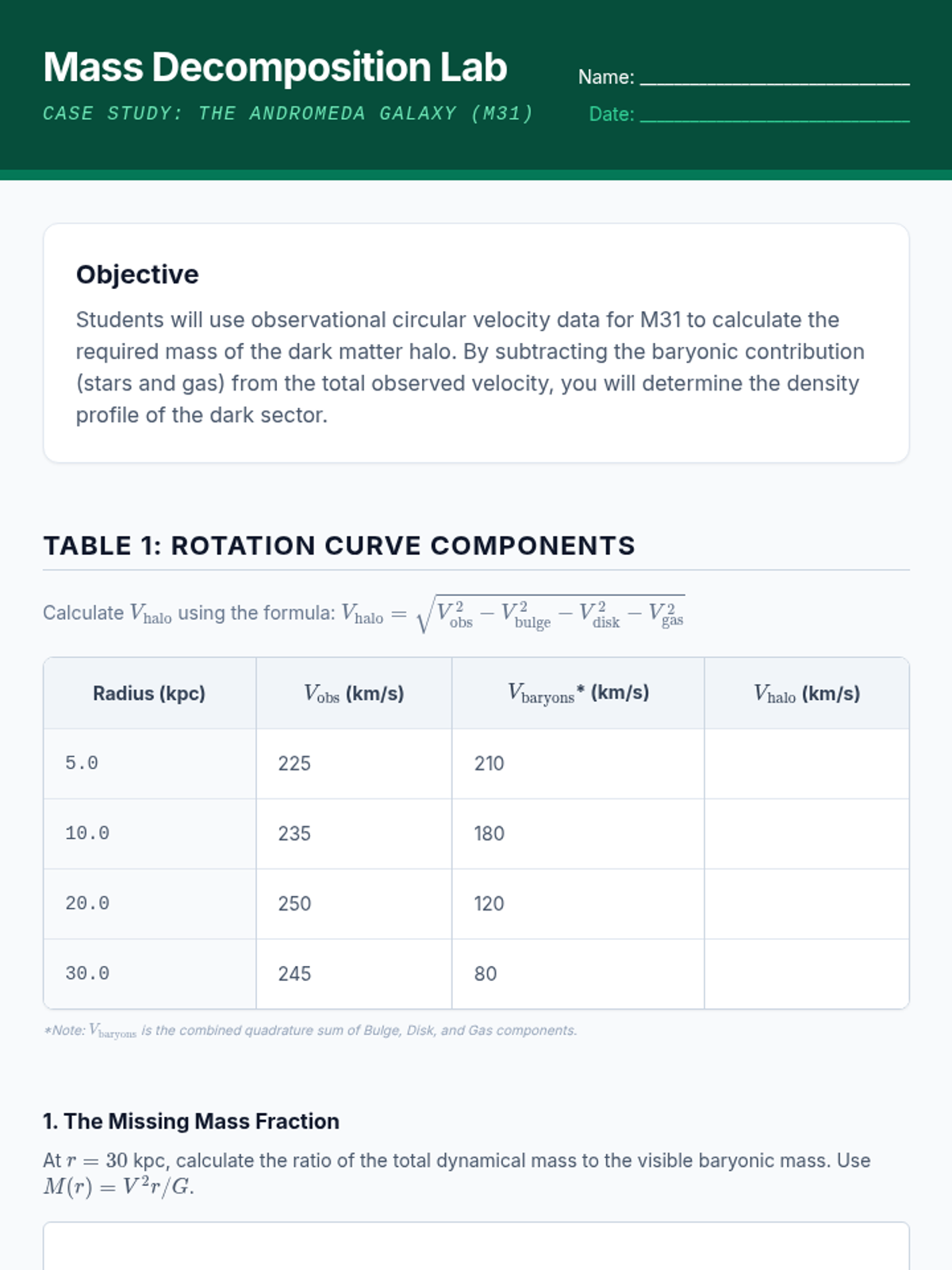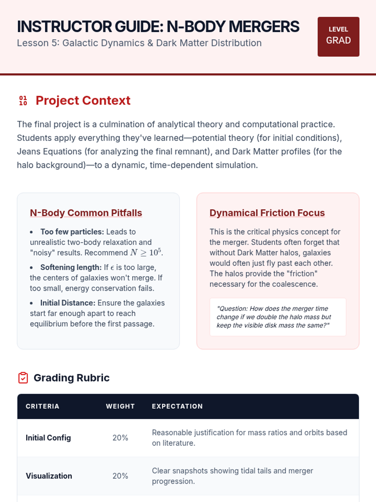 A graduate-level sequence exploring gravitational dynamics, the Collisionless Boltzmann Equation, and the role of dark matter in galactic evolution, culminating in N-body merger simulations.