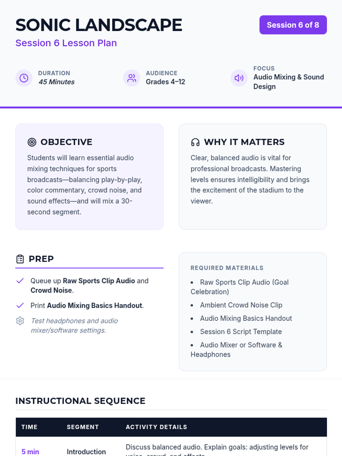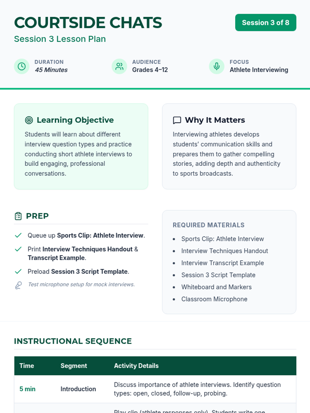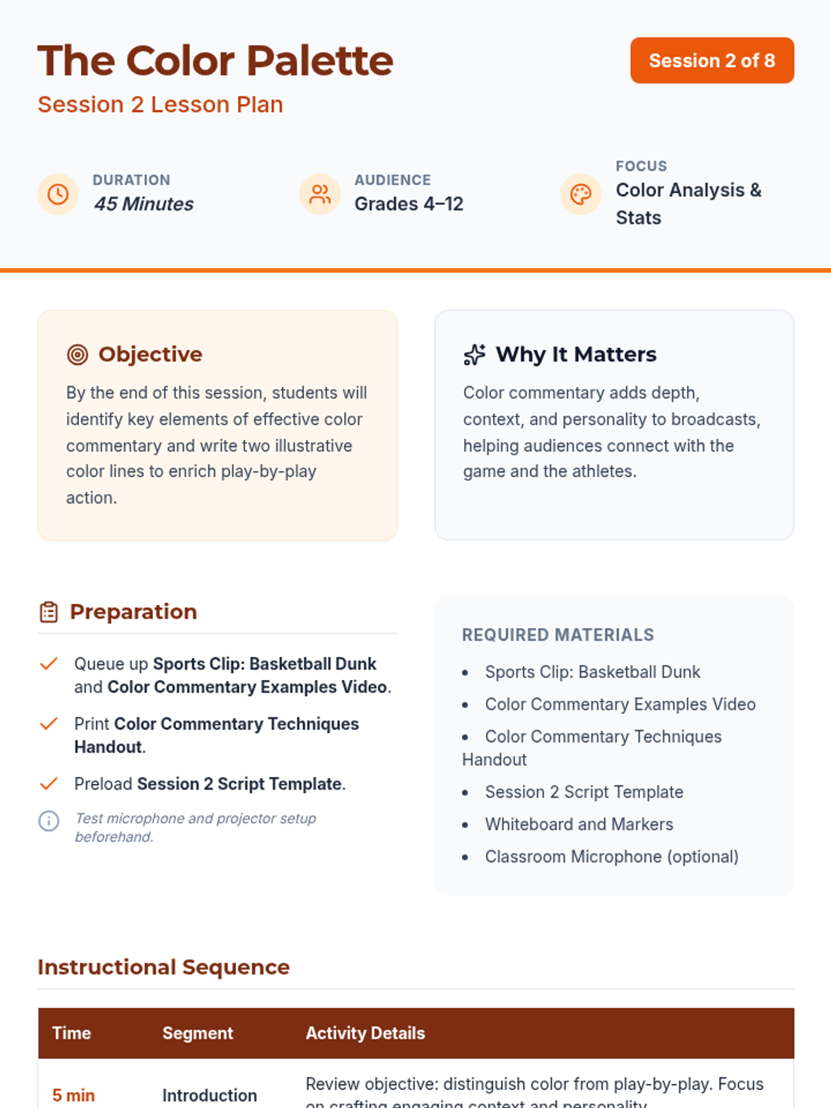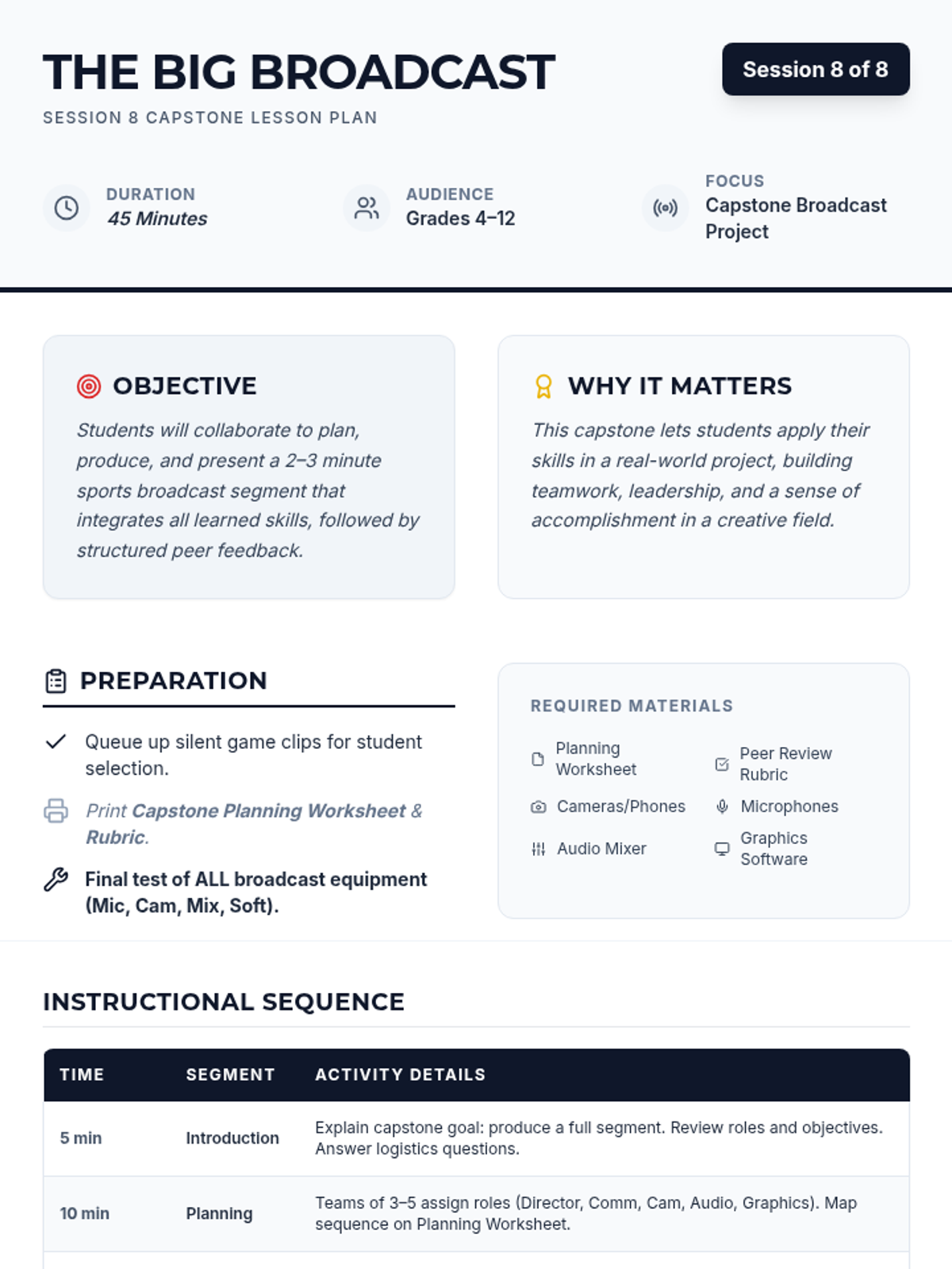 An 8-session sports broadcasting course for grades 4–12, covering play-by-play, color commentary, interviewing, camera work, audio mixing, and live production directing. Students progress from foundational vocal skills to a complete capstone broadcast project.