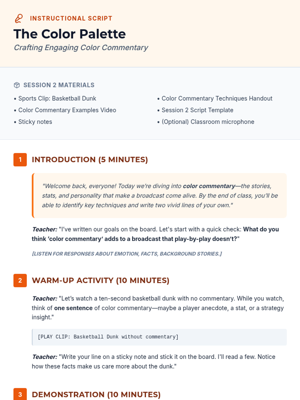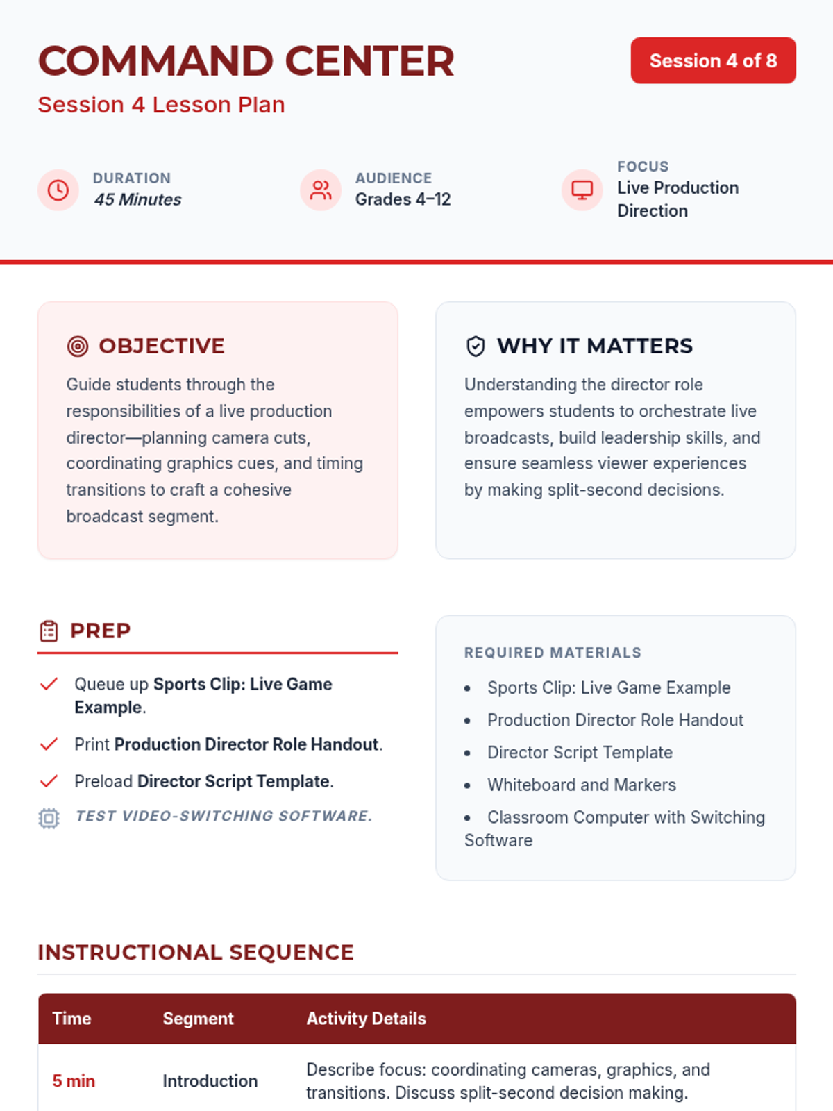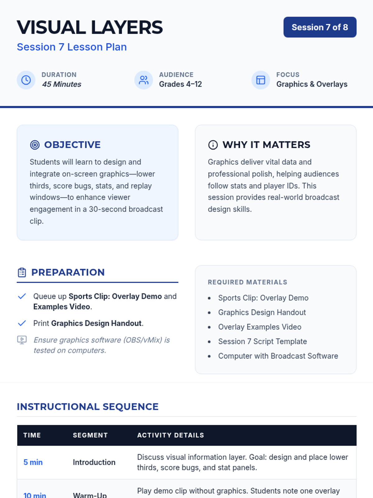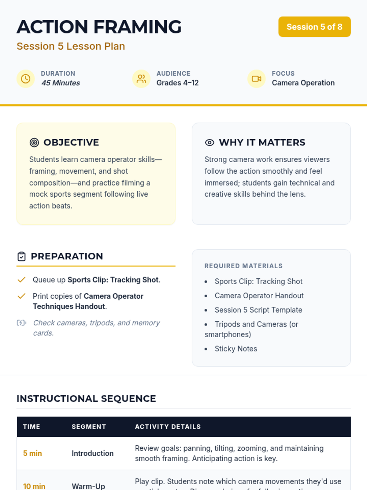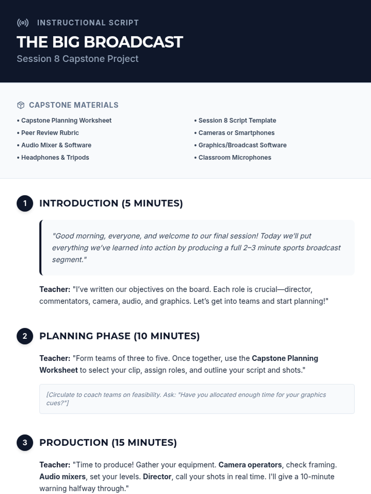 An 8-session sports broadcasting course for grades 4–12, covering play-by-play, color commentary, interviewing, camera work, audio mixing, and live production directing. Students progress from foundational vocal skills to a complete capstone broadcast project.