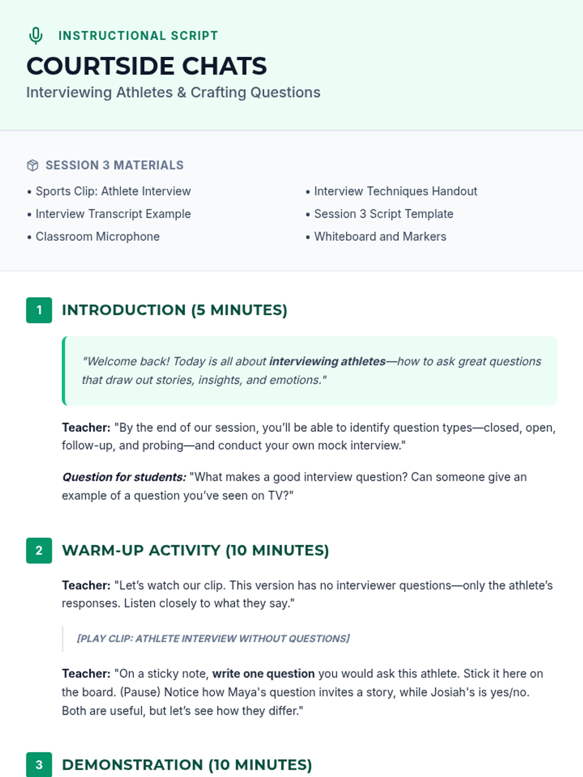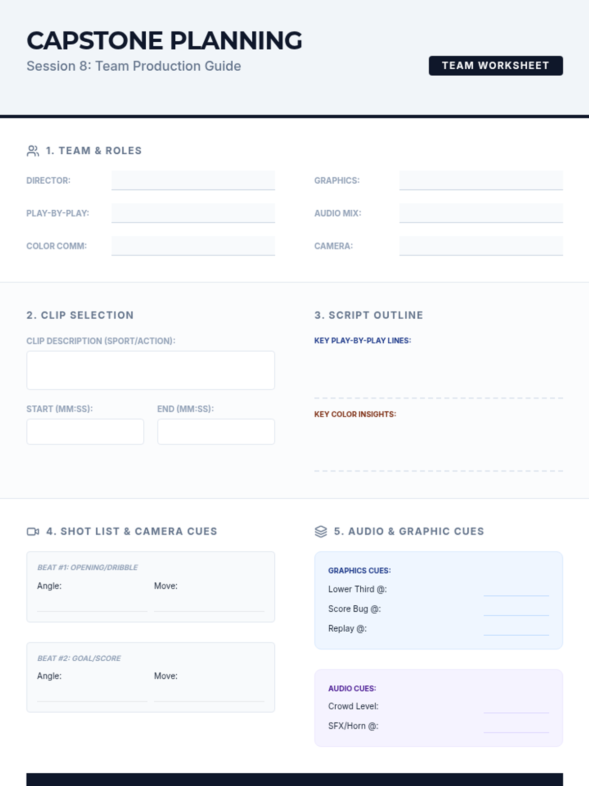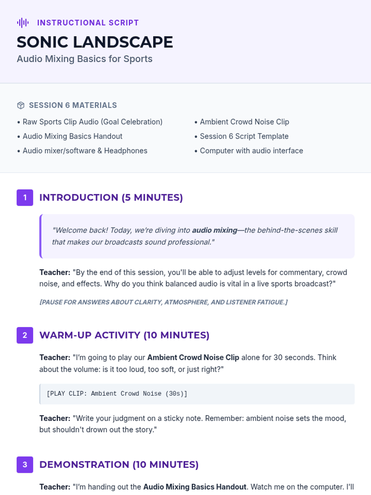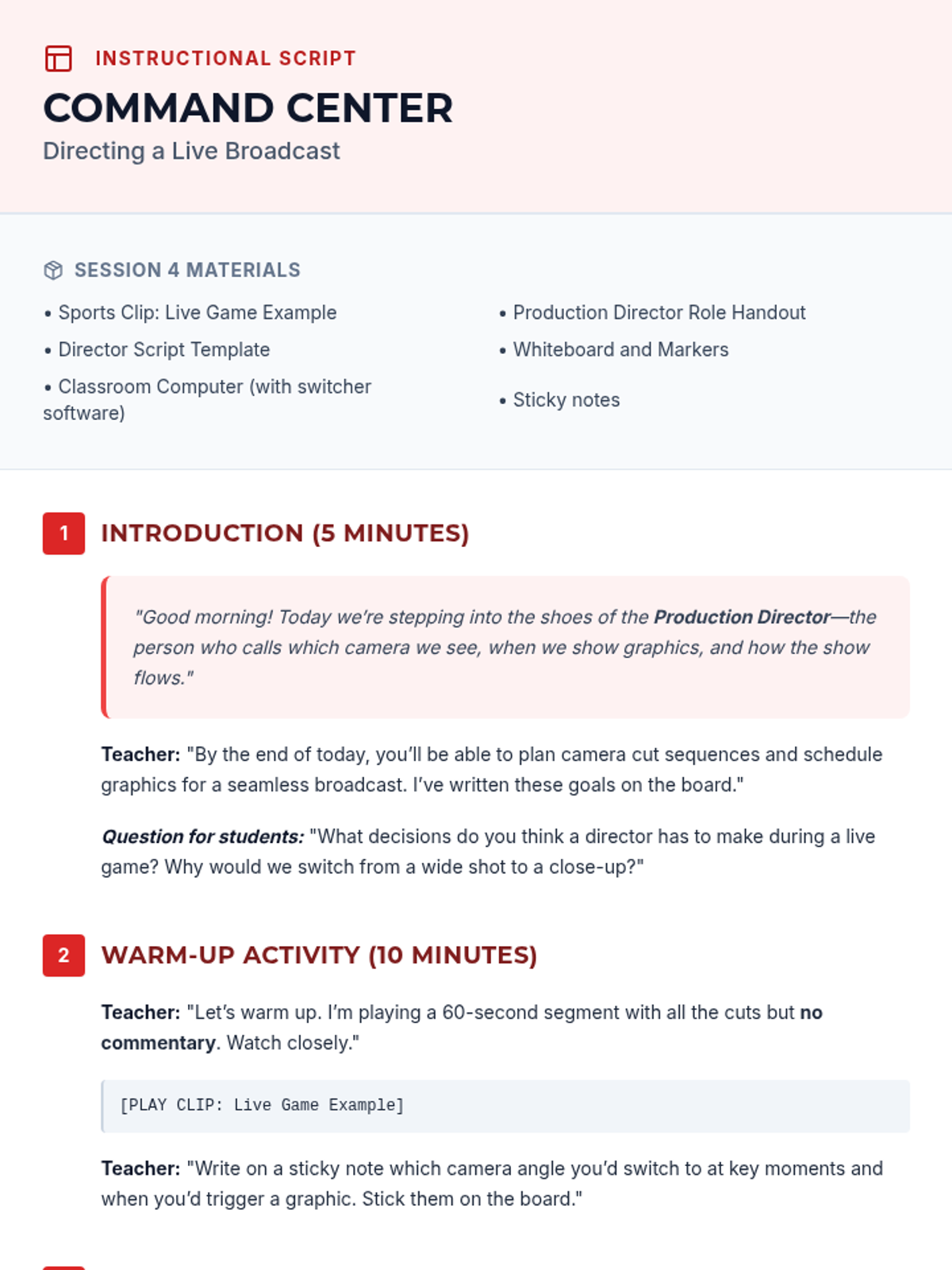 An 8-session sports broadcasting course for grades 4–12, covering play-by-play, color commentary, interviewing, camera work, audio mixing, and live production directing. Students progress from foundational vocal skills to a complete capstone broadcast project.