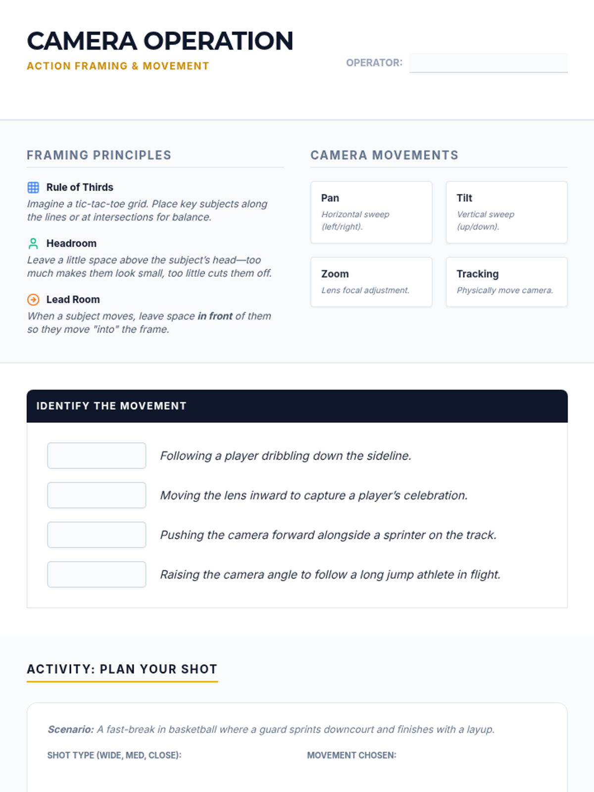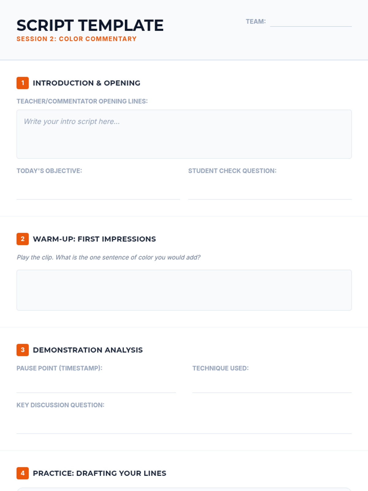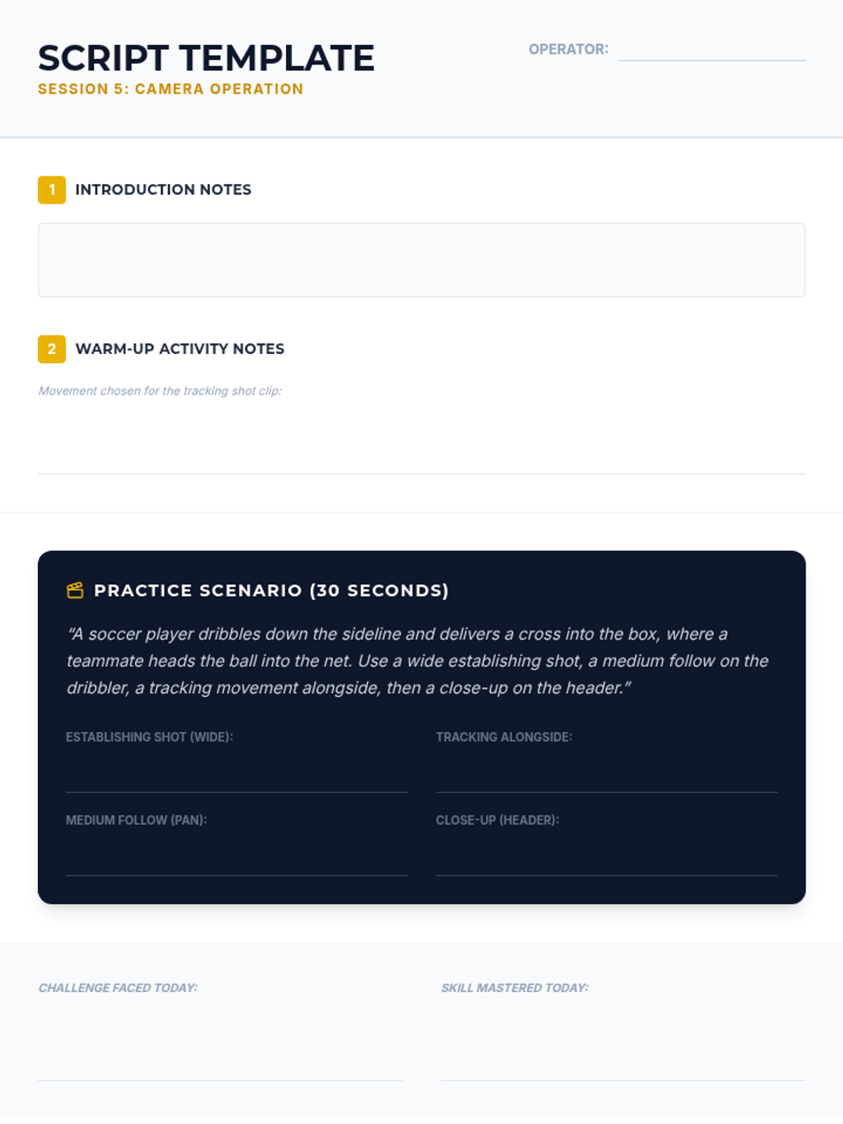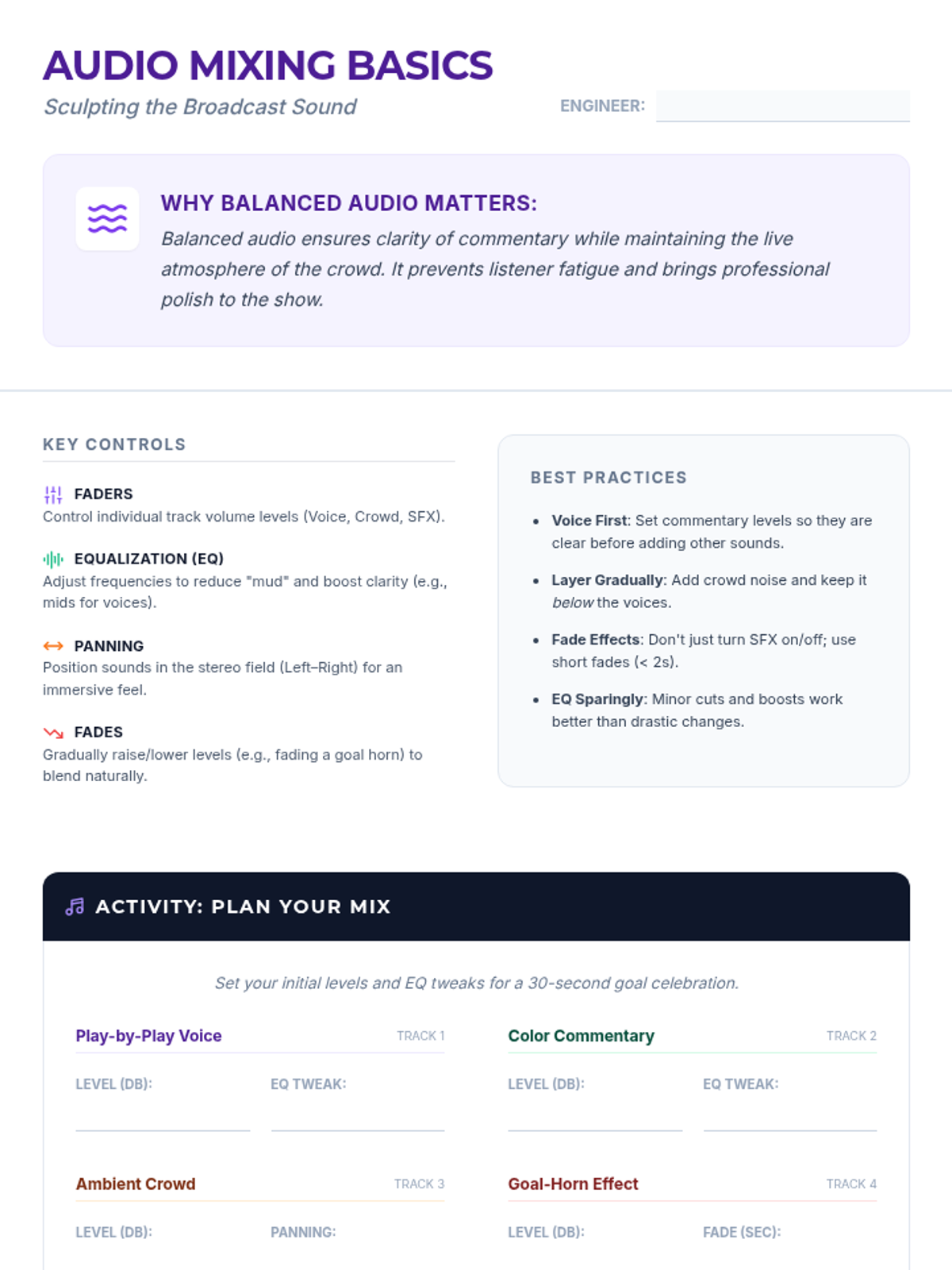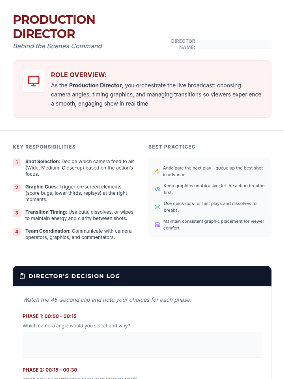An 8-session sports broadcasting course for grades 4–12, covering play-by-play, color commentary, interviewing, camera work, audio mixing, and live production directing. Students progress from foundational vocal skills to a complete capstone broadcast project.