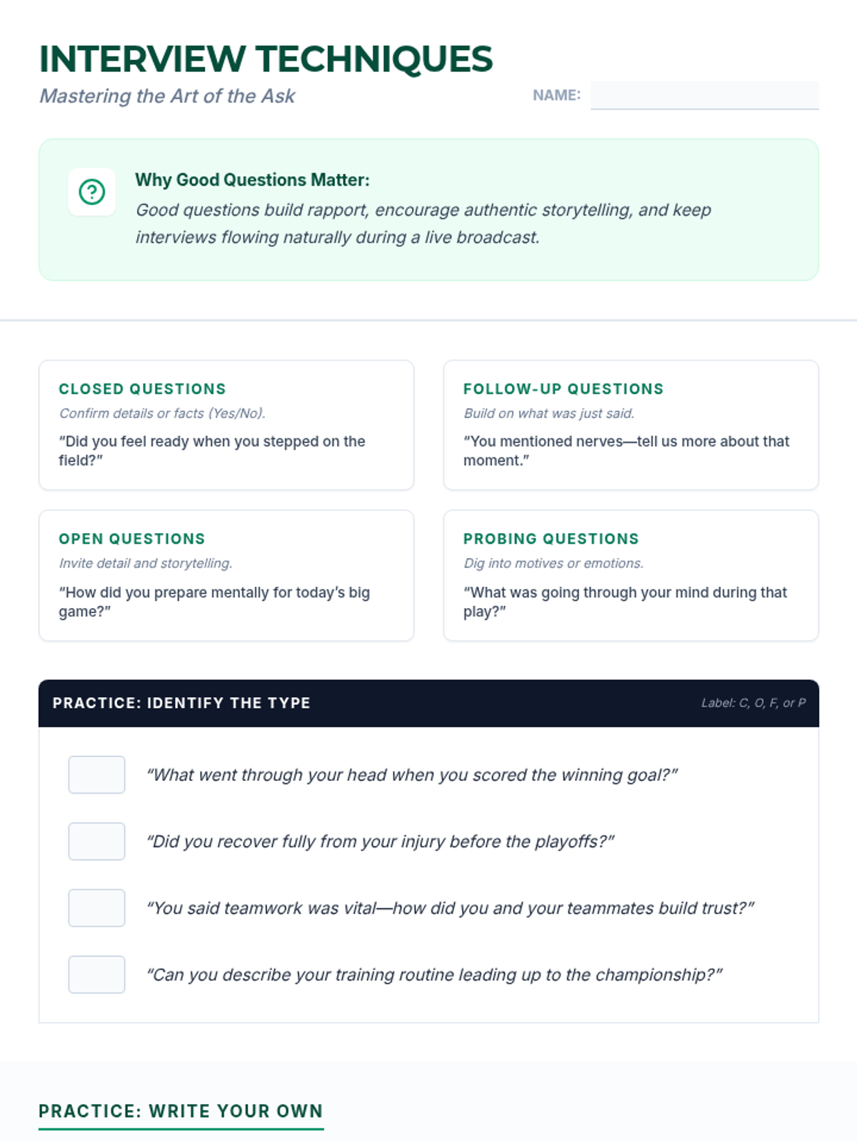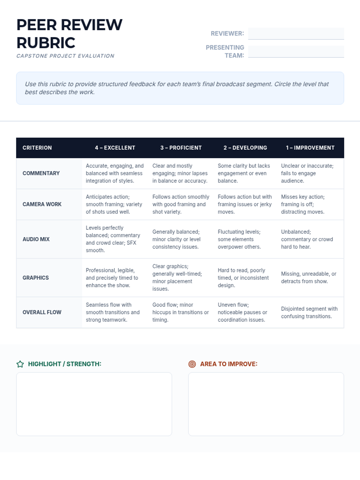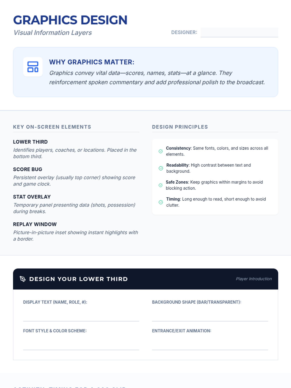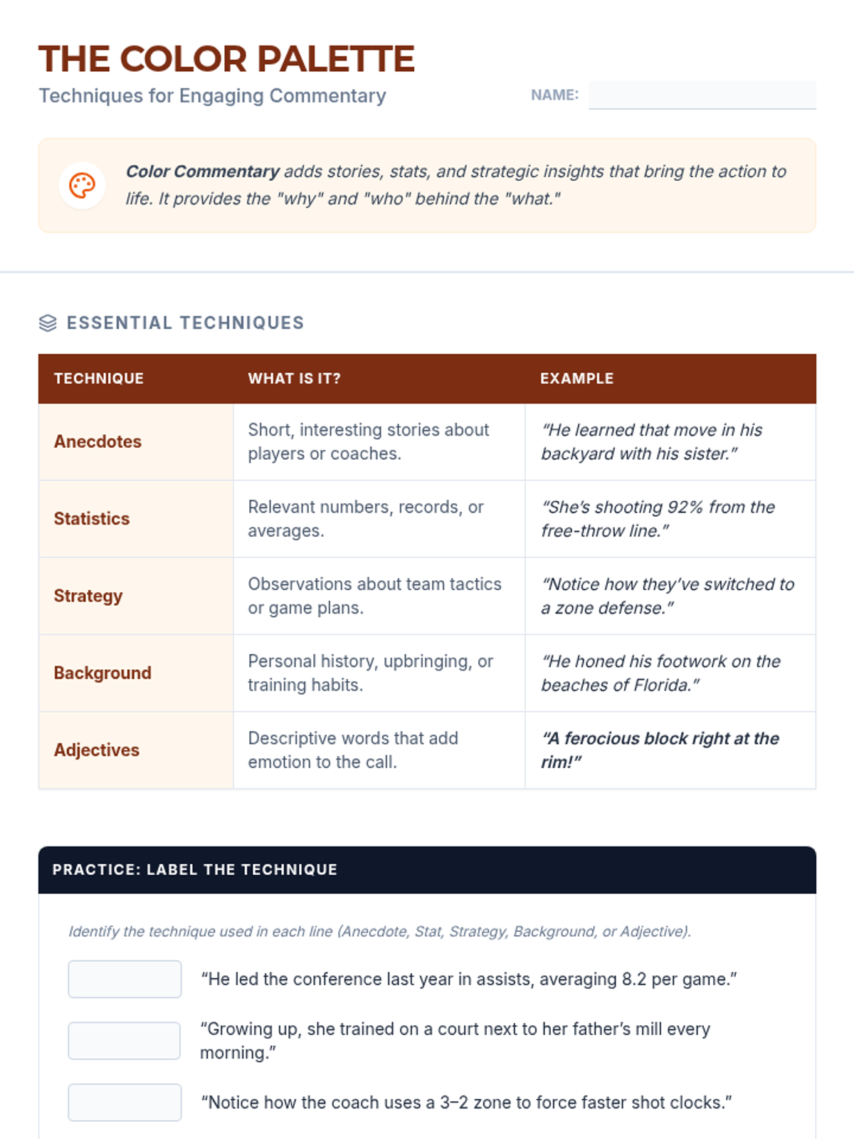 An 8-session sports broadcasting course for grades 4–12, covering play-by-play, color commentary, interviewing, camera work, audio mixing, and live production directing. Students progress from foundational vocal skills to a complete capstone broadcast project.