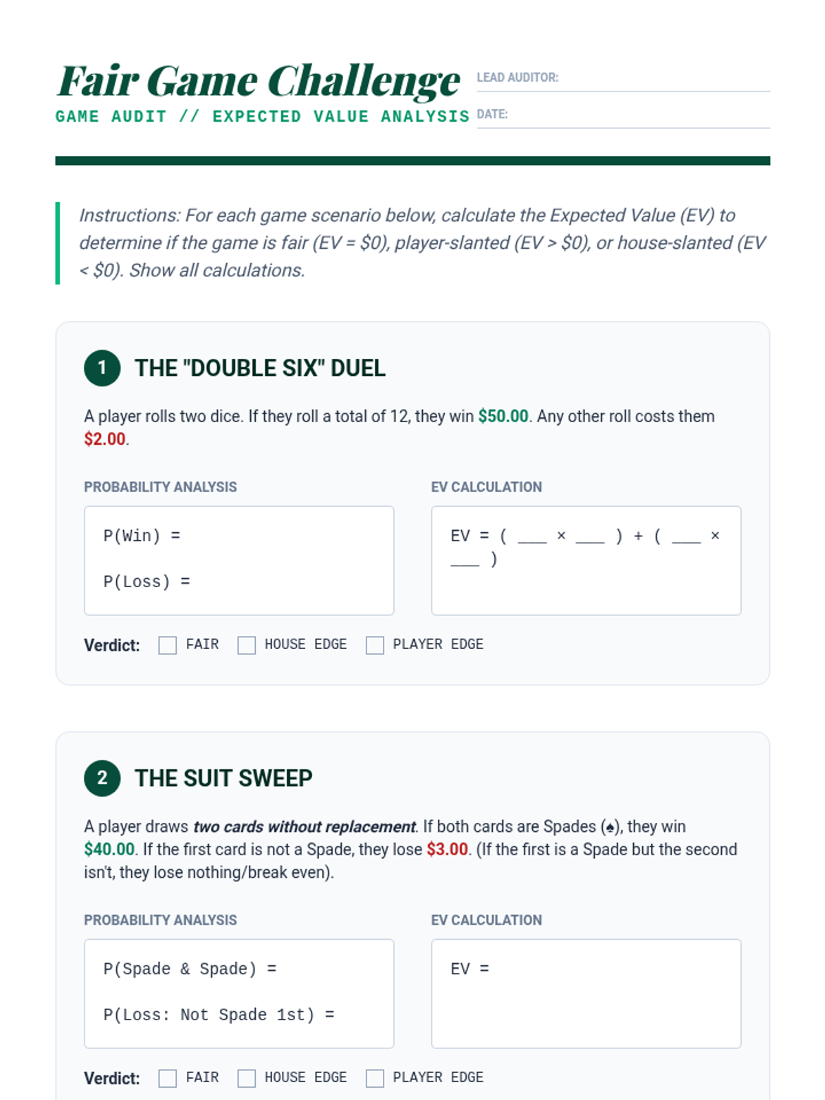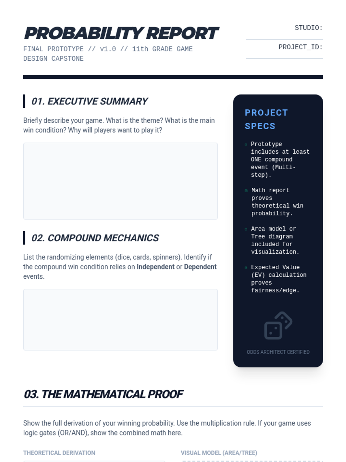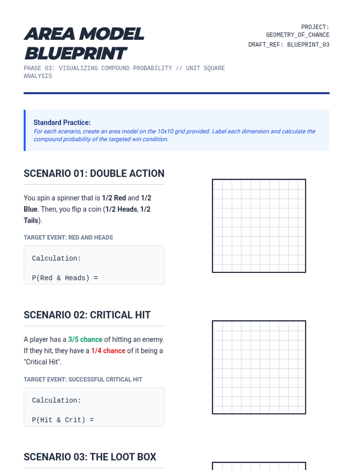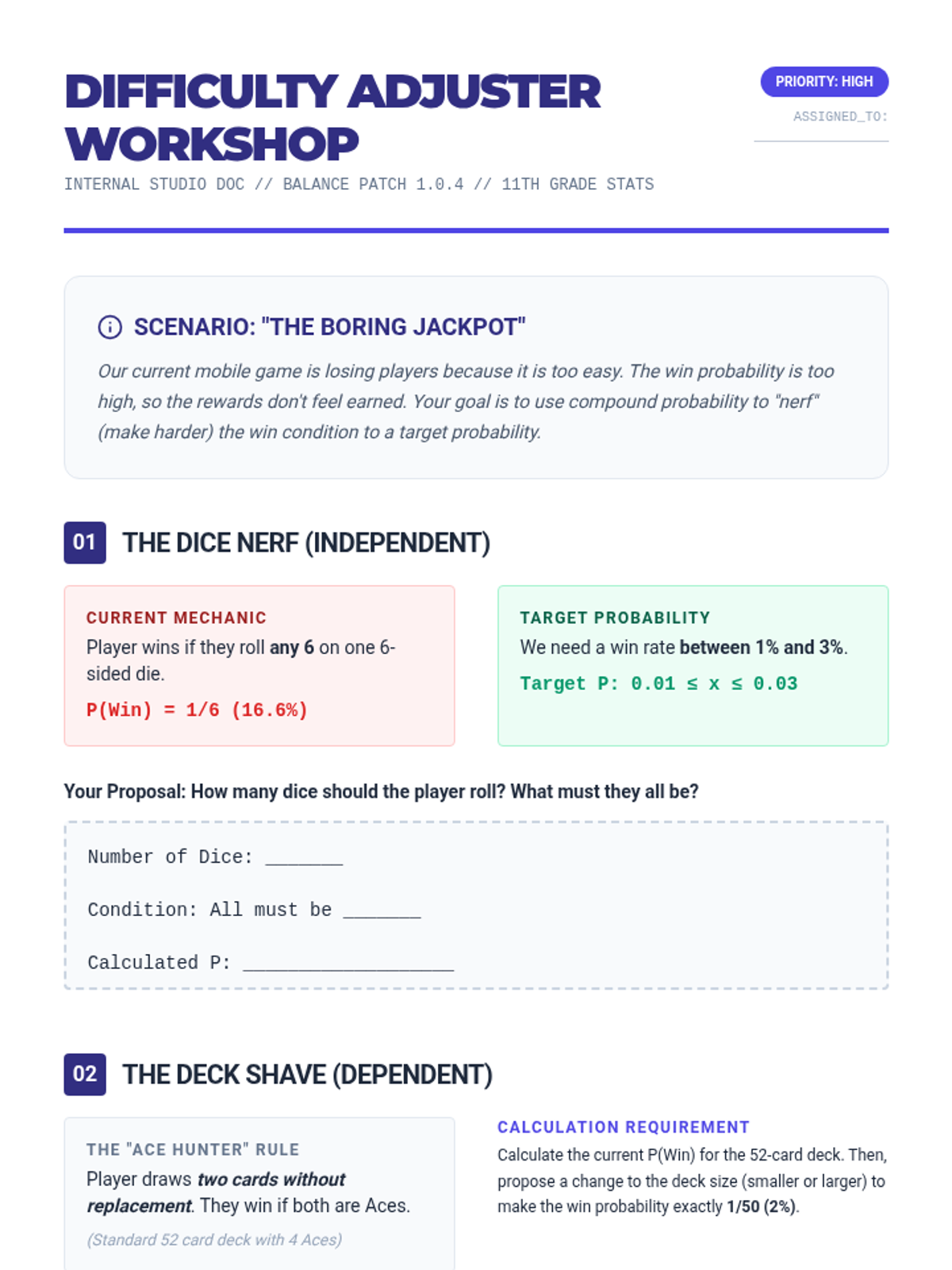 This 11th-grade sequence explores compound probability through the lens of game design and analysis. Students move from analyzing existing games of chance to engineering their own balanced systems using the multiplication rule, expected value, and area models.