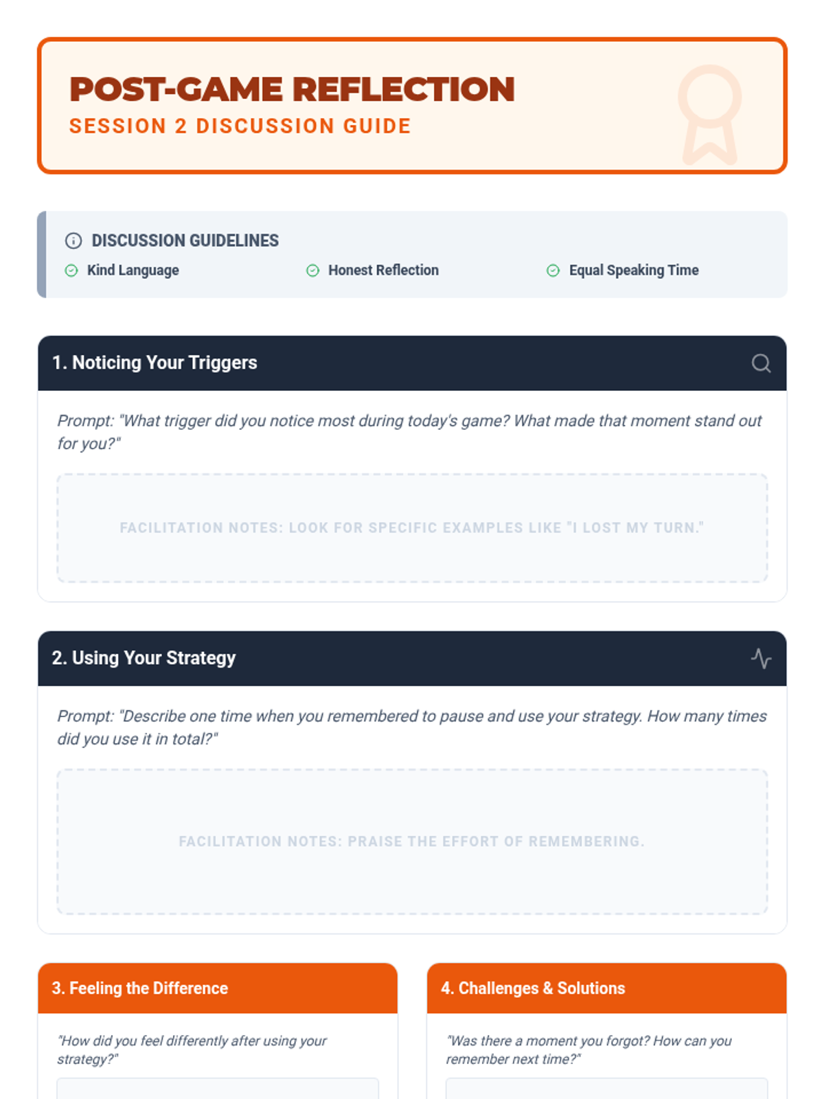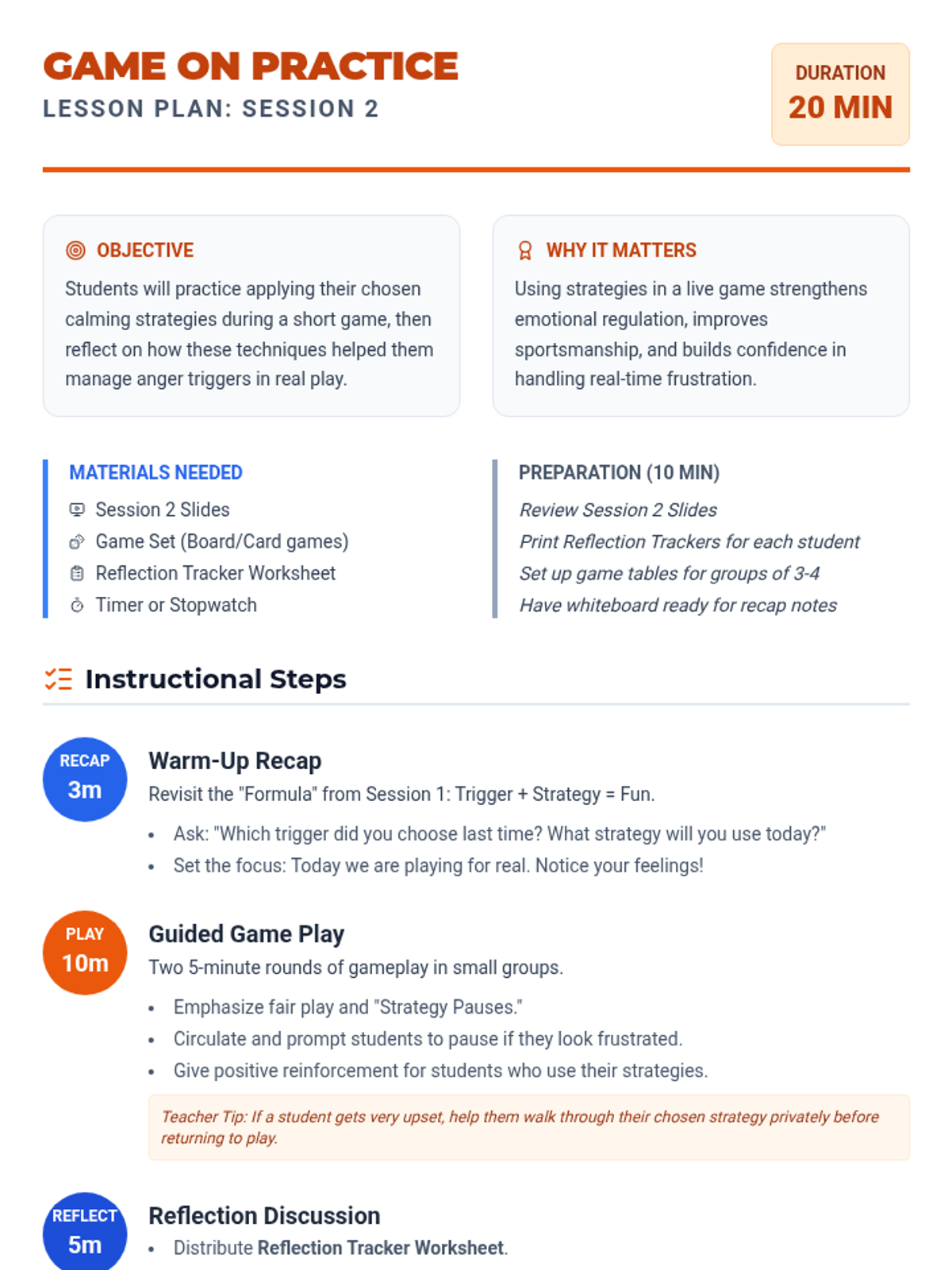 A two-session social-emotional learning sequence for 3rd grade boys to manage anger and frustration during competitive play. Students identify triggers and practice calming strategies through interactive discussion and guided gameplay.