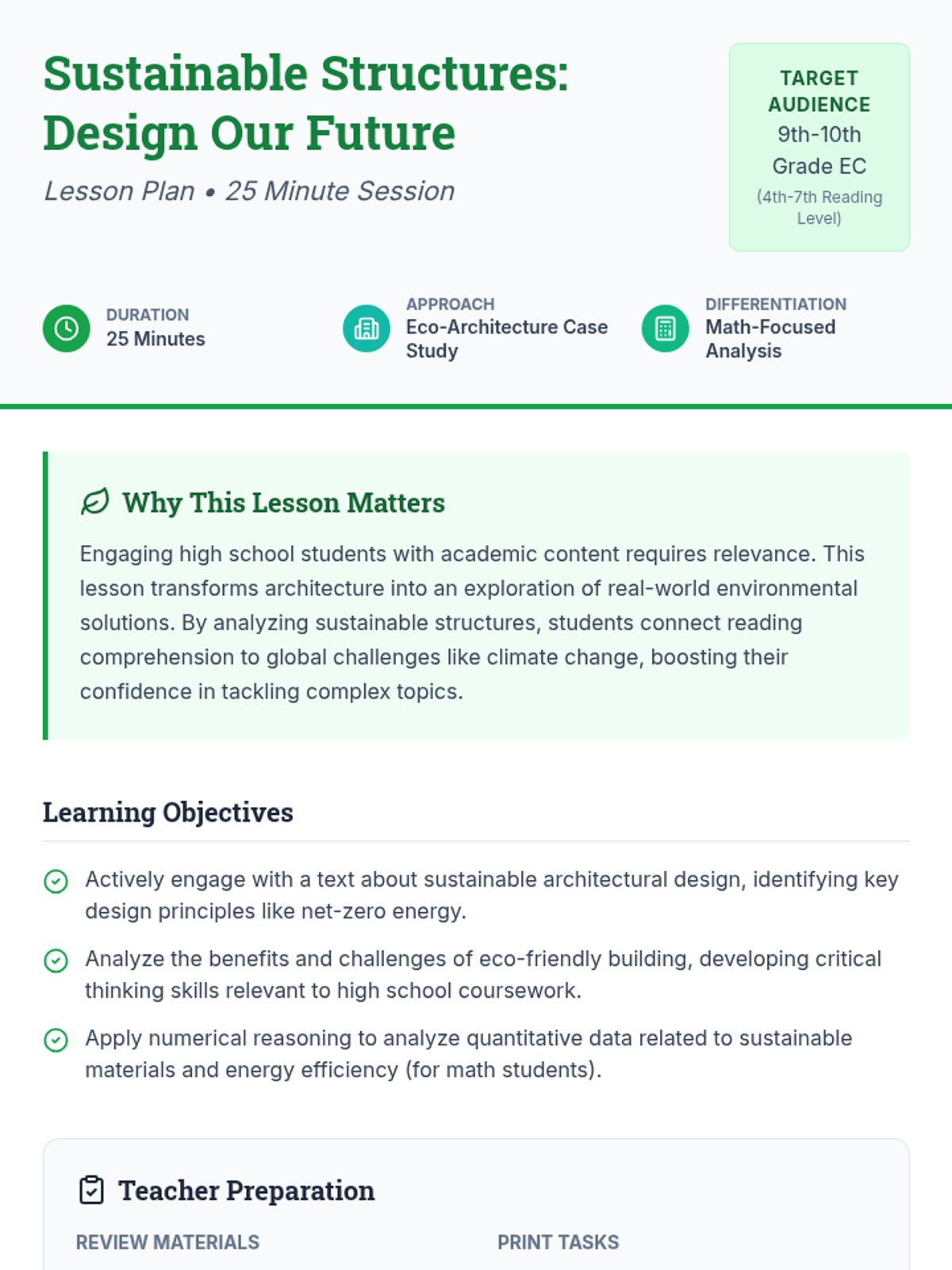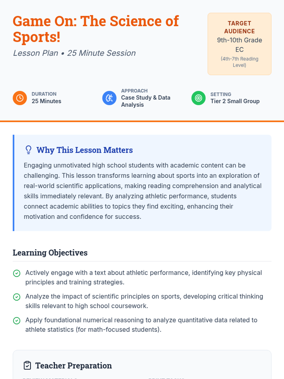A series of high-engagement lessons for 9th-10th grade students that explore scientific principles through sports, sustainable architecture, and forensic investigation. Designed for Tier 2 small group intervention, these lessons bridge the gap between low reading levels and high-interest high school concepts.