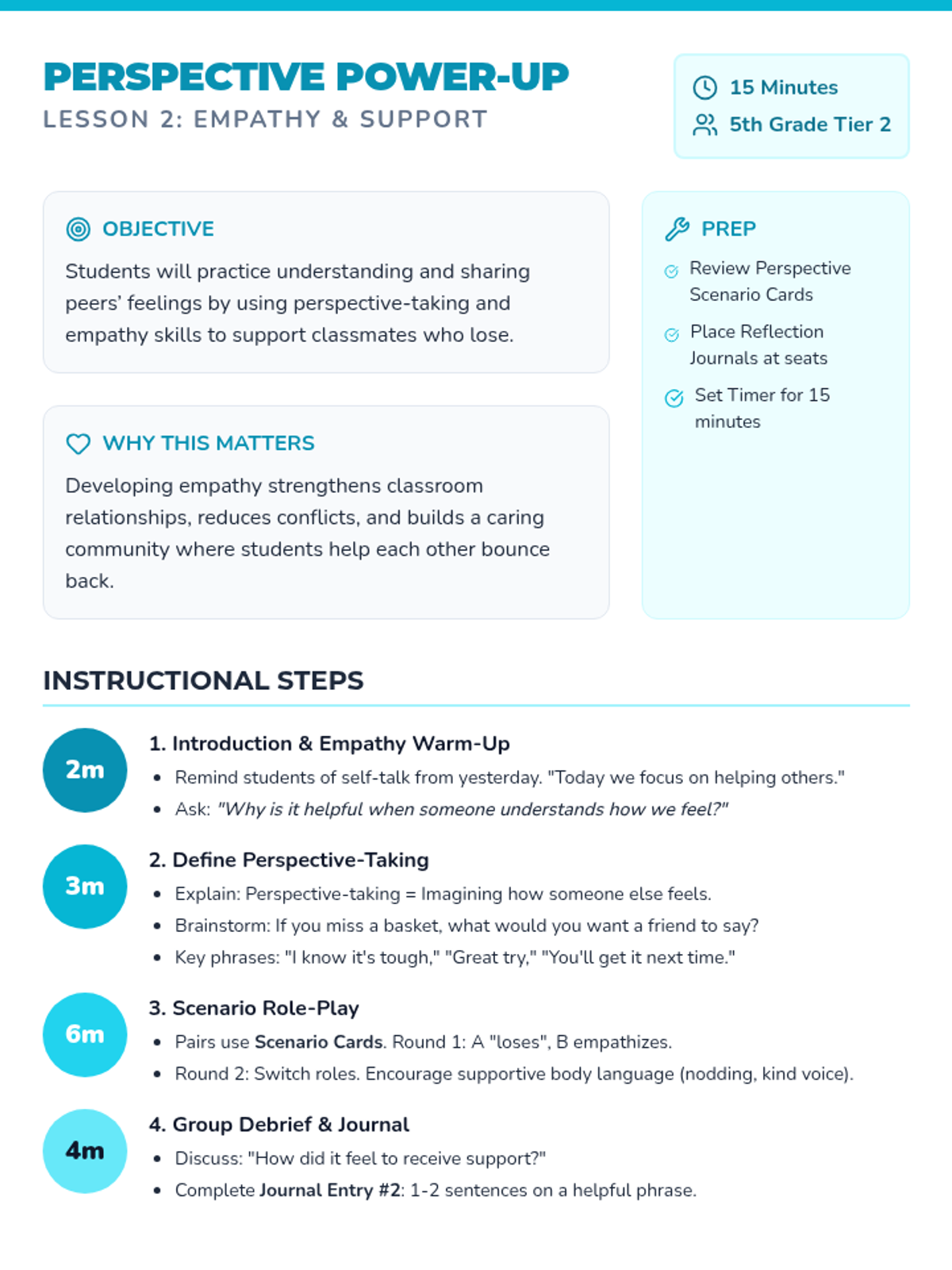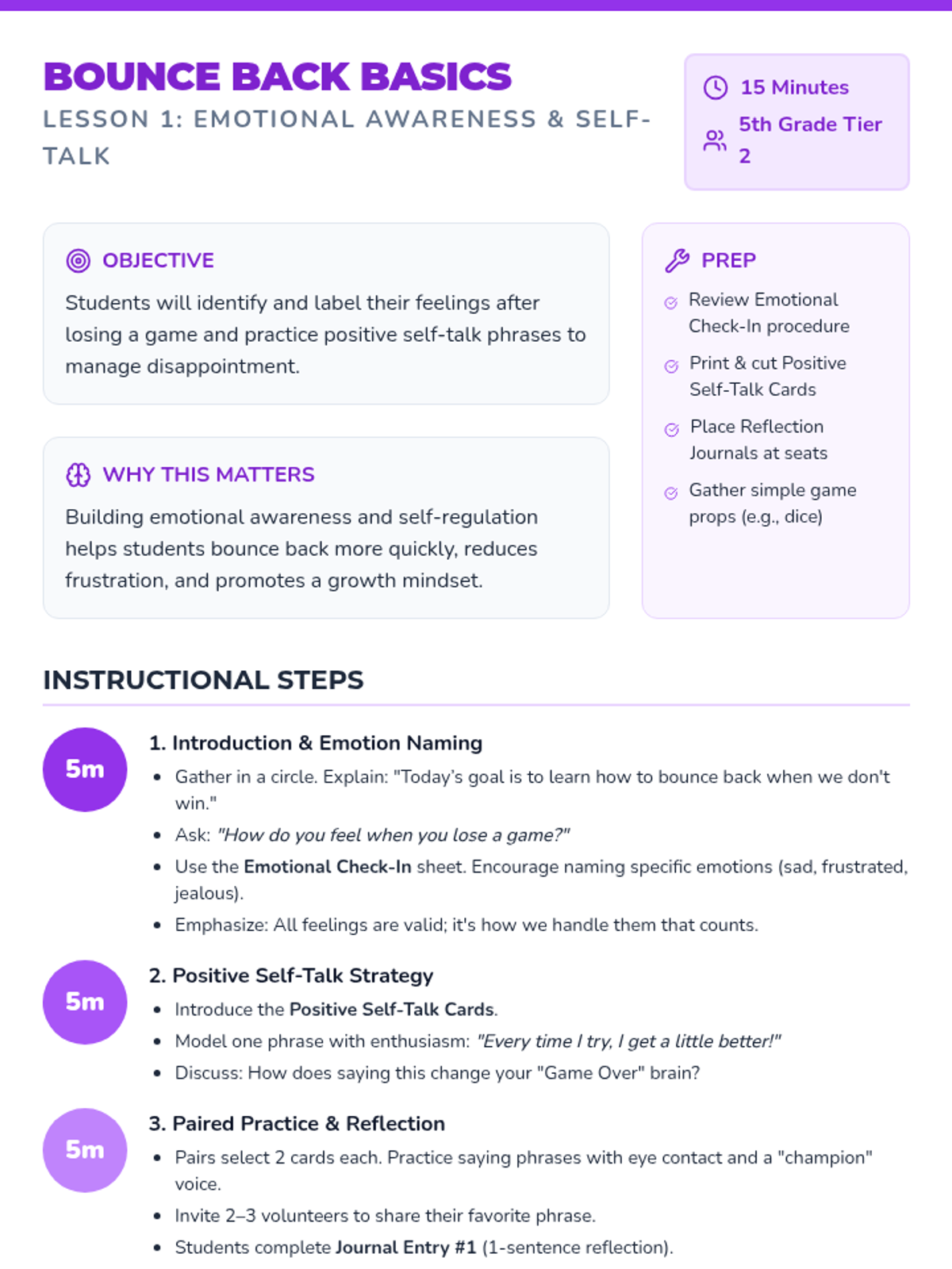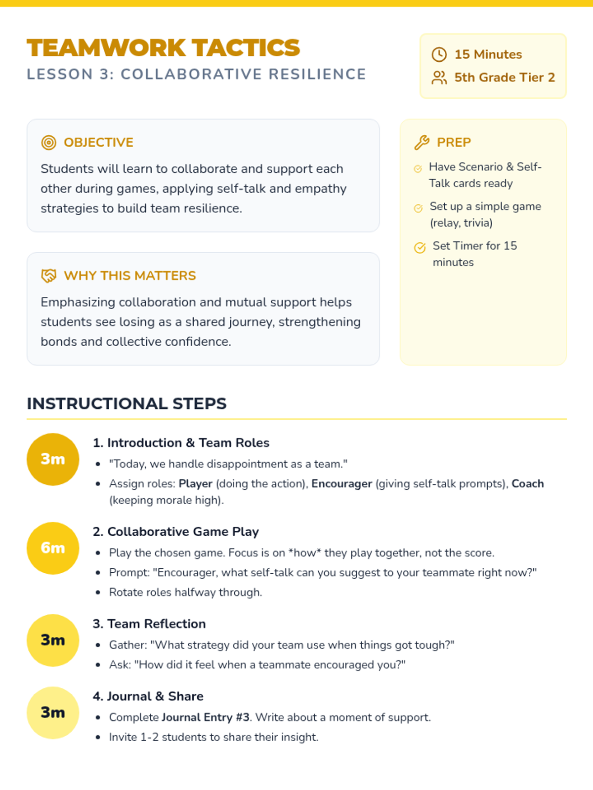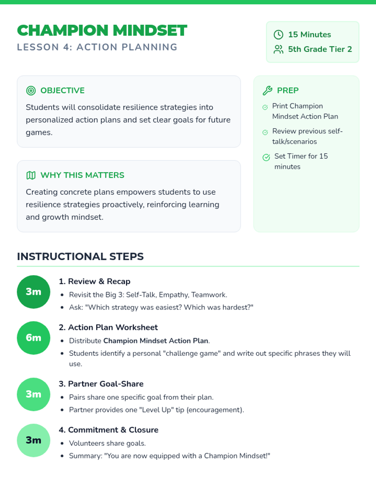 A 4-part Tier 2 intervention sequence for 5th graders focused on emotional regulation, sportsmanship, and resilience when facing disappointment in competitive games. Students learn positive self-talk, empathy, and collaborative strategies to 'bounce back' from losses.