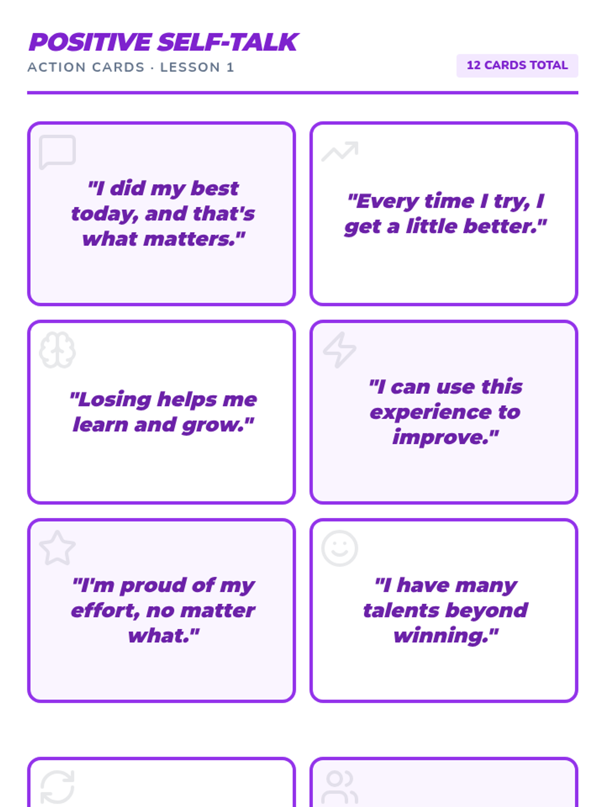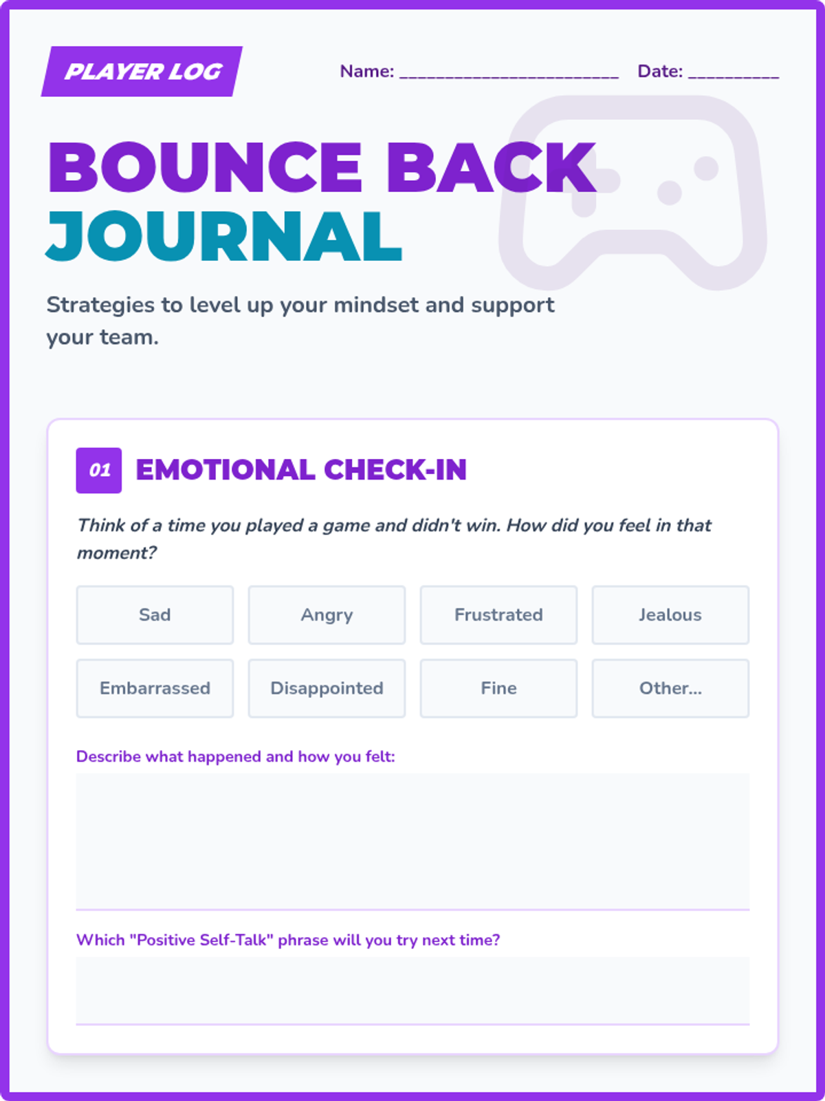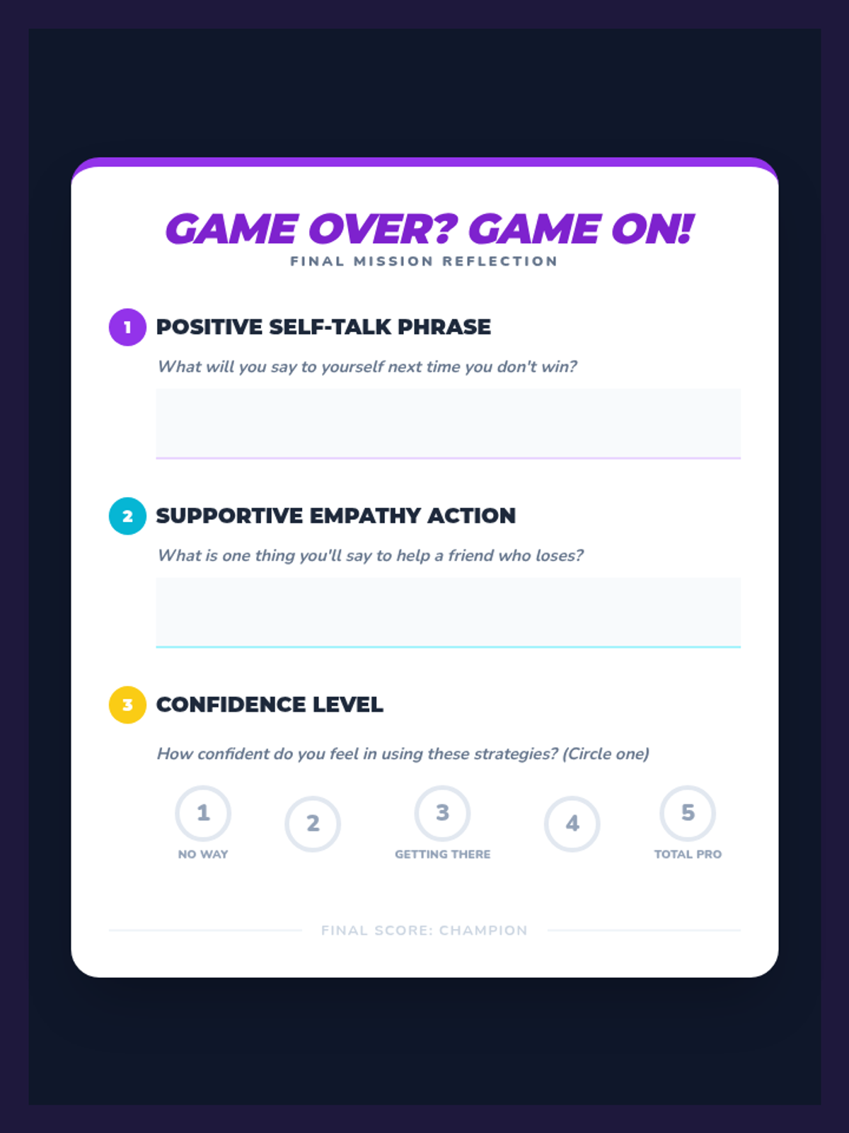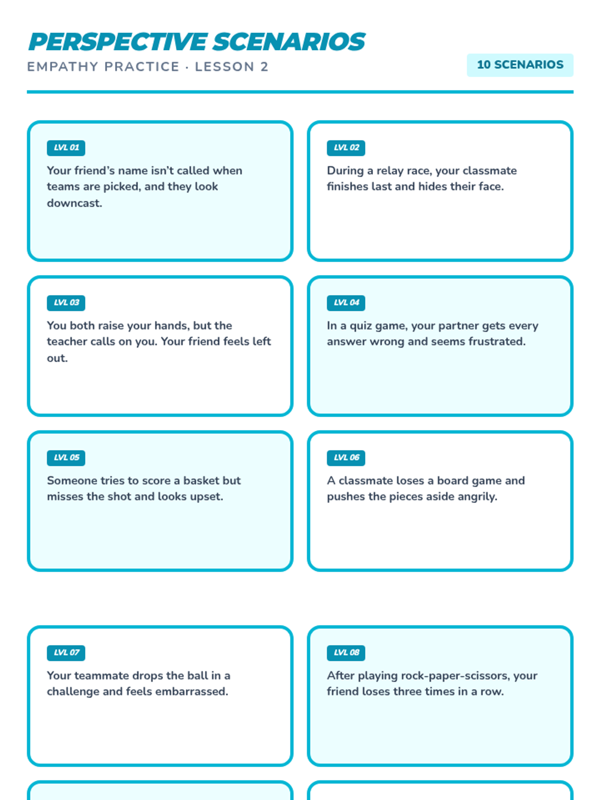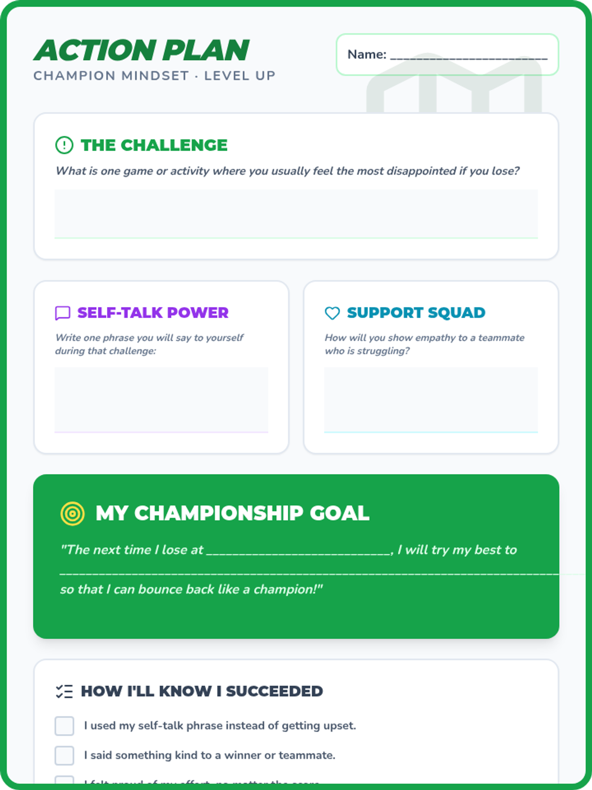 A 4-part Tier 2 intervention sequence for 5th graders focused on emotional regulation, sportsmanship, and resilience when facing disappointment in competitive games. Students learn positive self-talk, empathy, and collaborative strategies to 'bounce back' from losses.