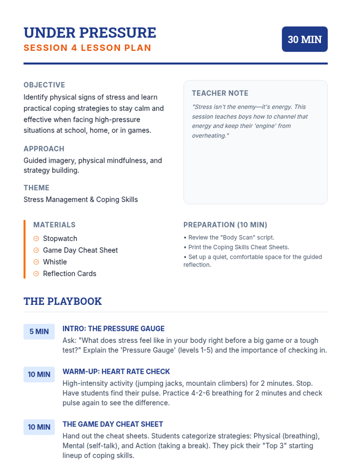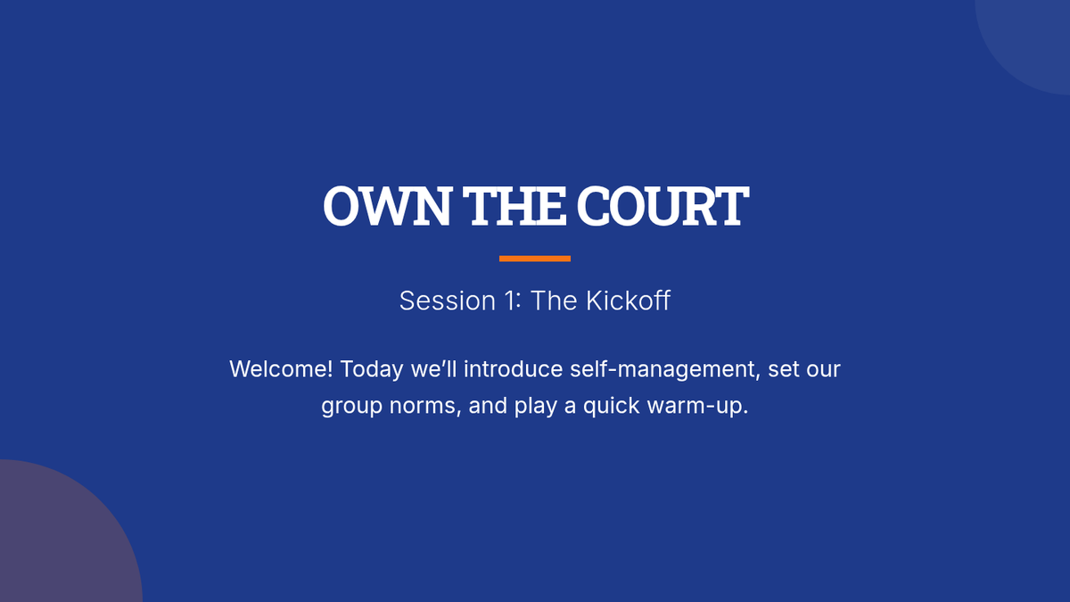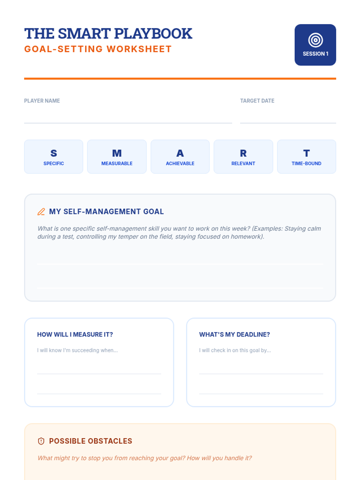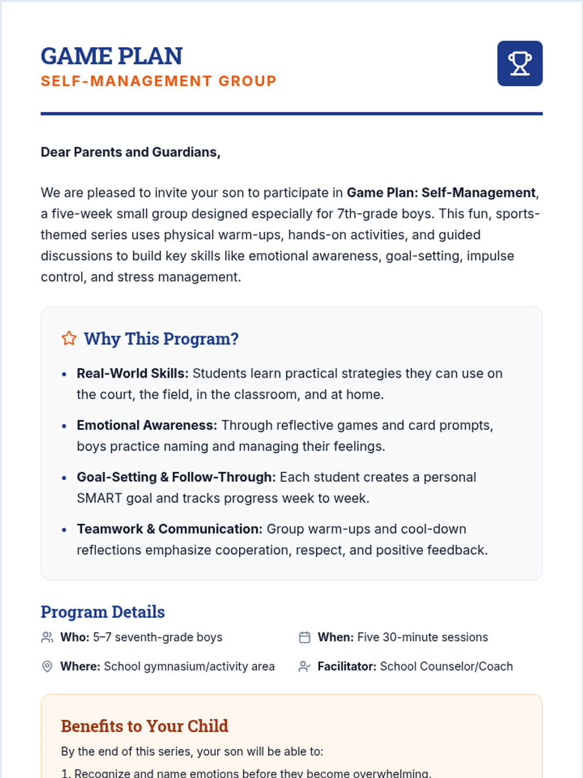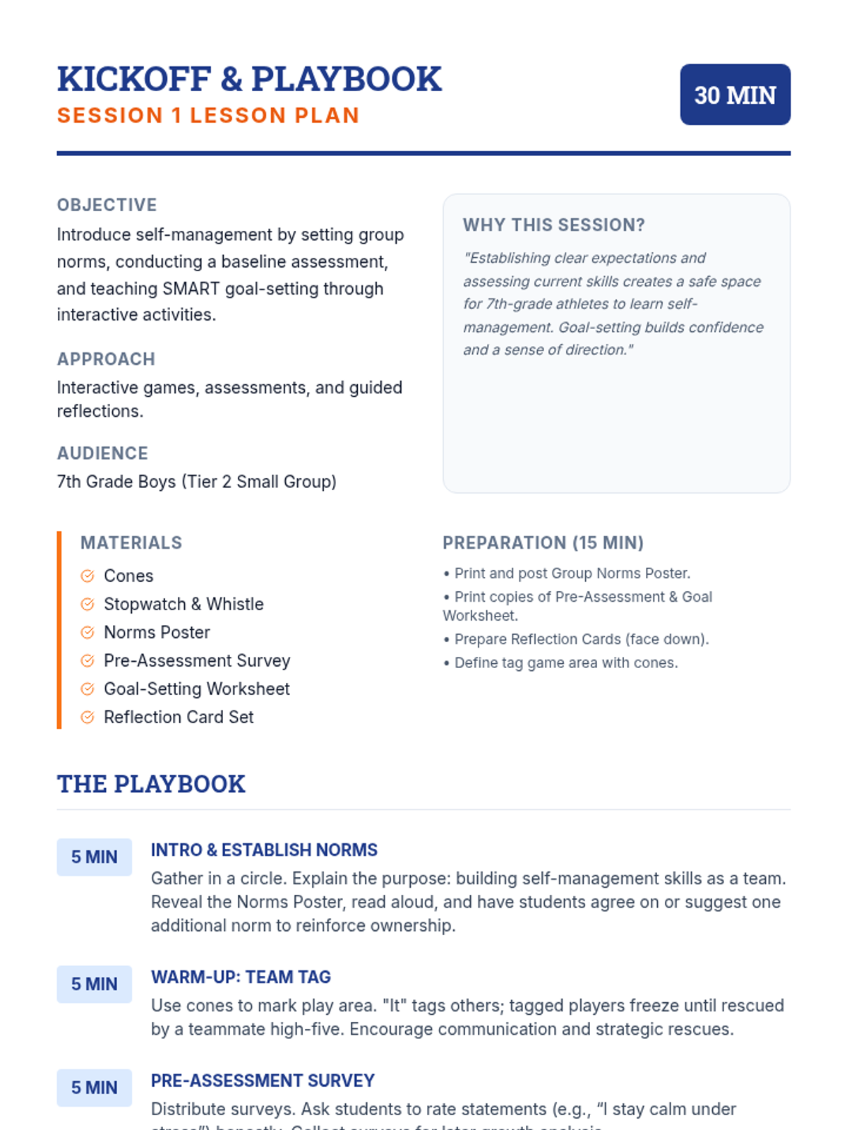 A 5-session small group for 7th-grade boys focused on building self-management skills through sports-themed activities, goal-setting, and emotional regulation strategies.