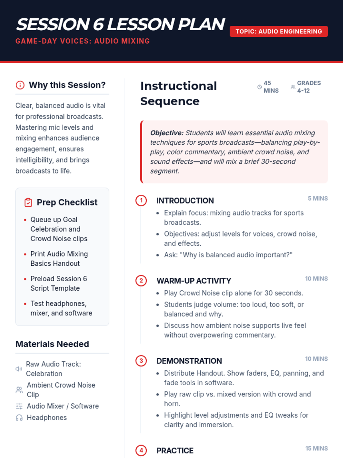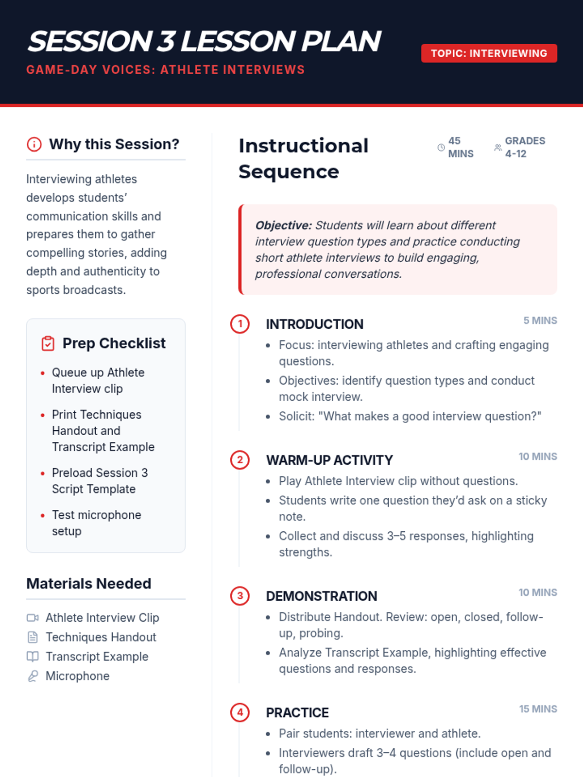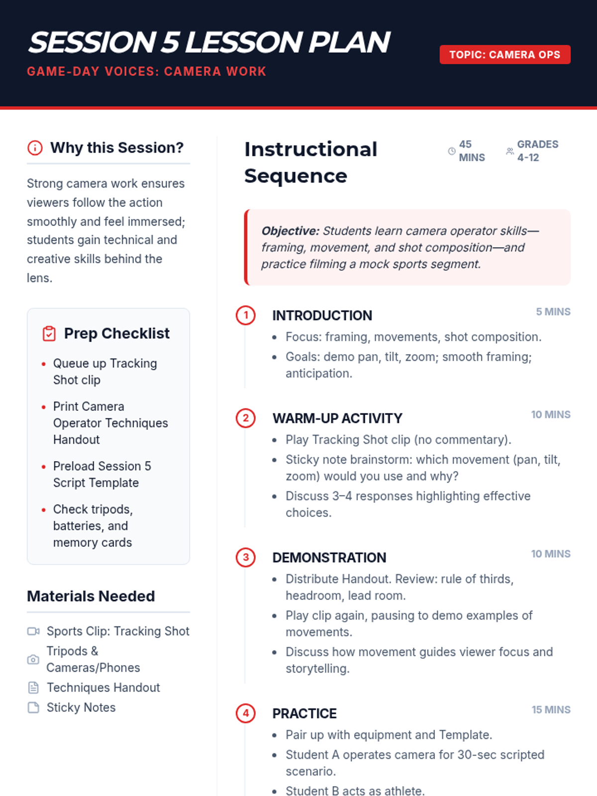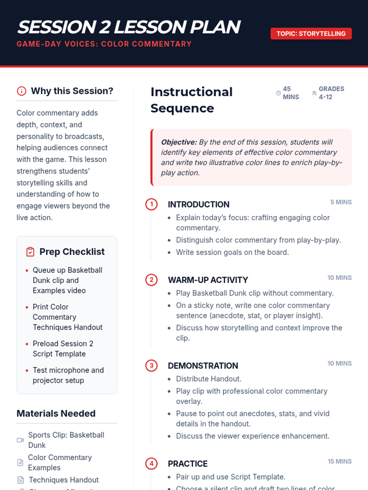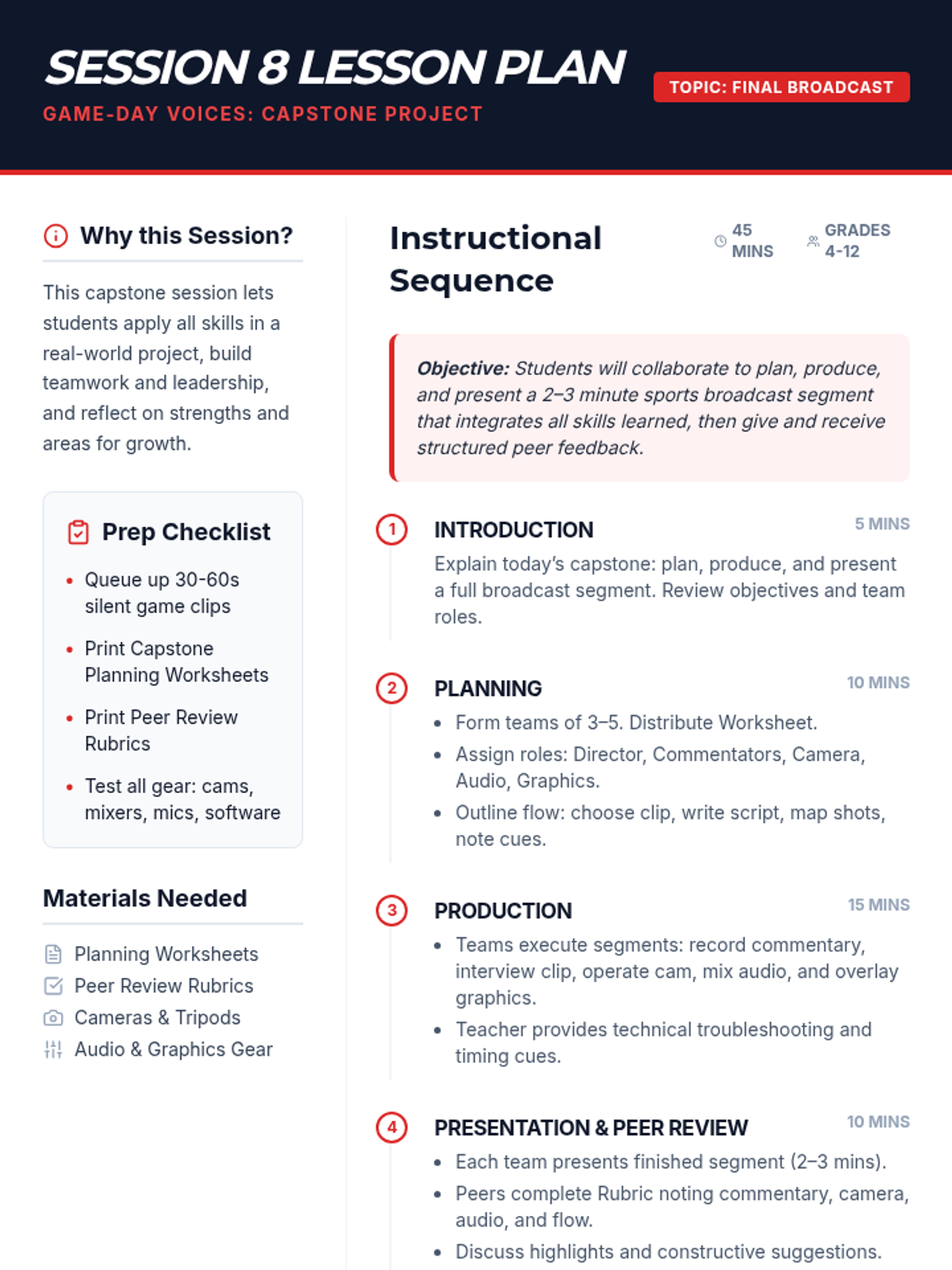 An 8-session sports broadcasting course for grades 4–12, students will learn the fundamentals of play-by-play commentary, color analysis, interviewing, and production skills. Each 45-minute session builds real-world broadcasting abilities, teamwork, and confidence both in the studio and at live events.