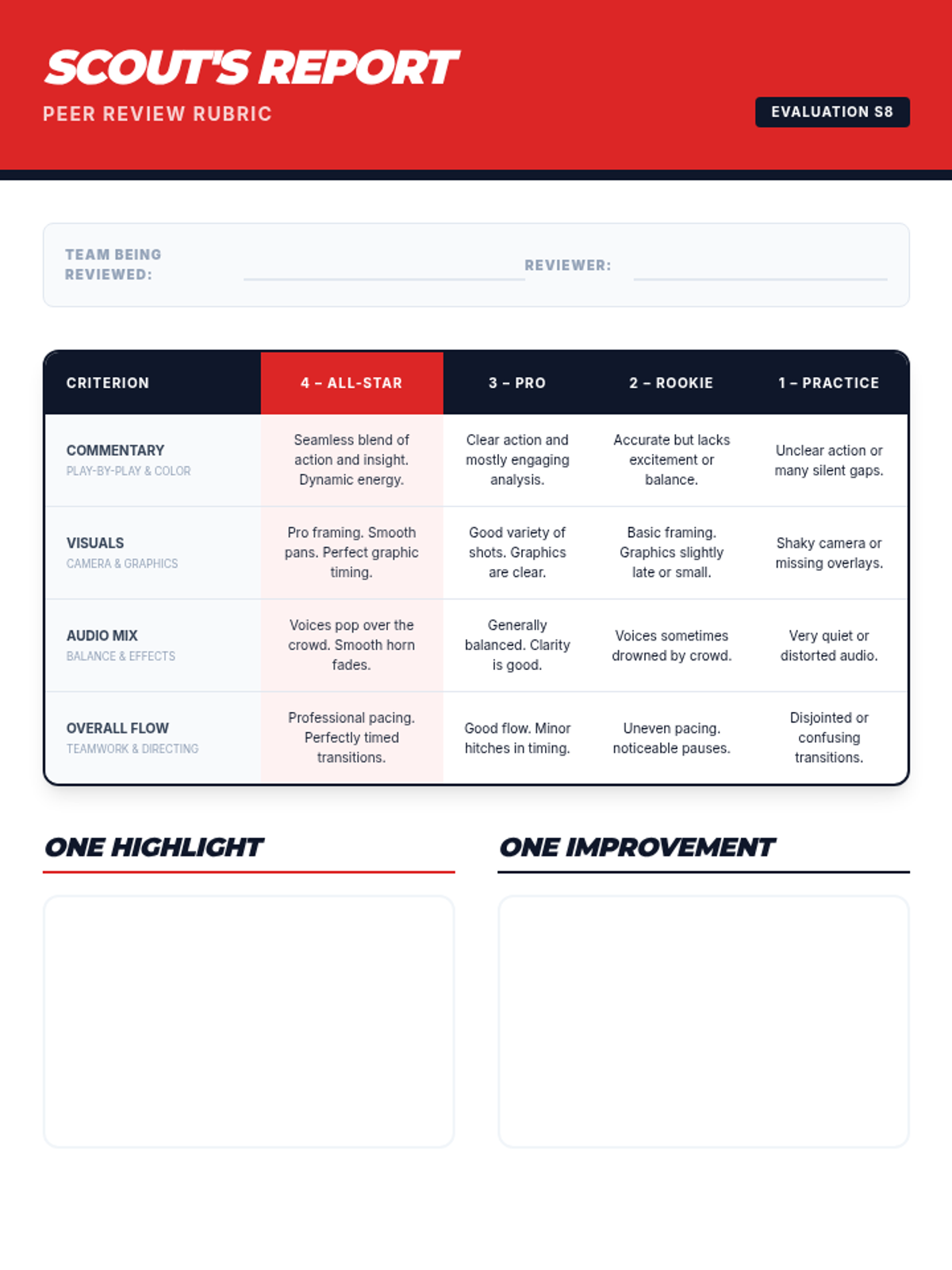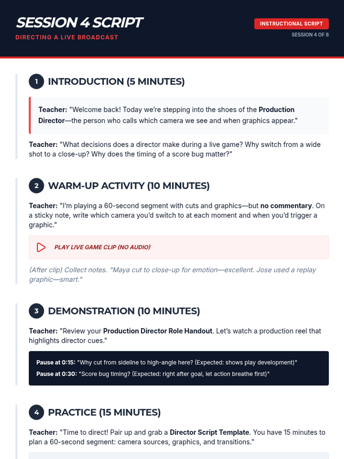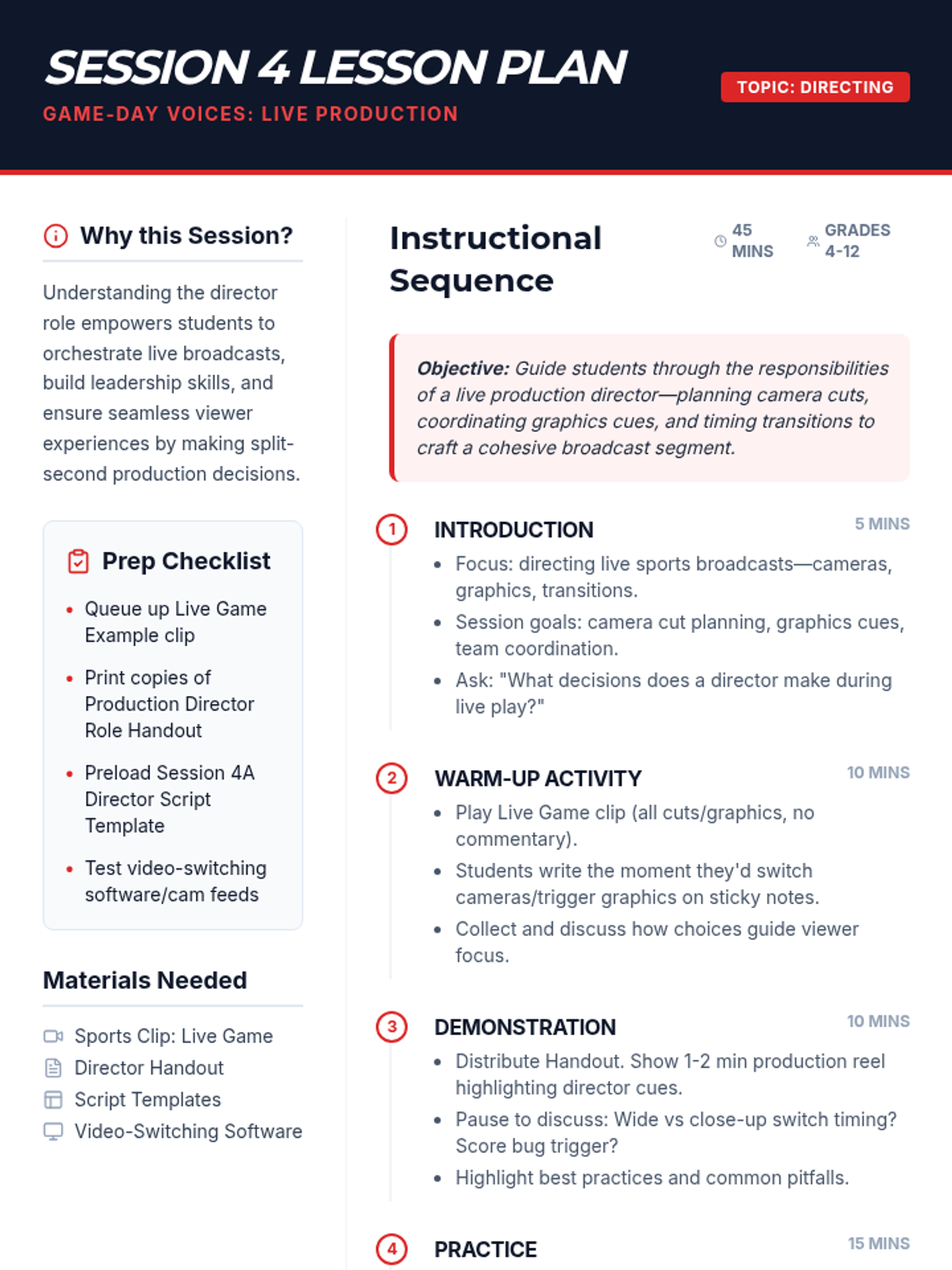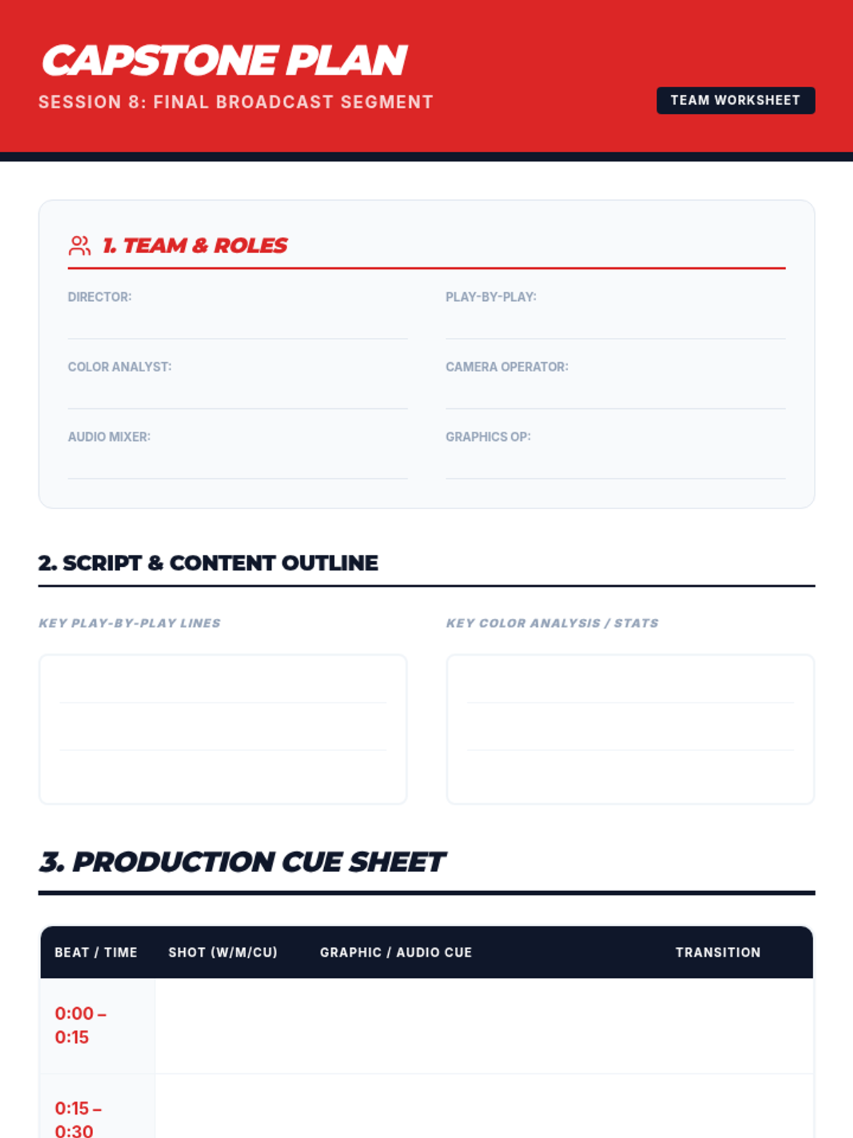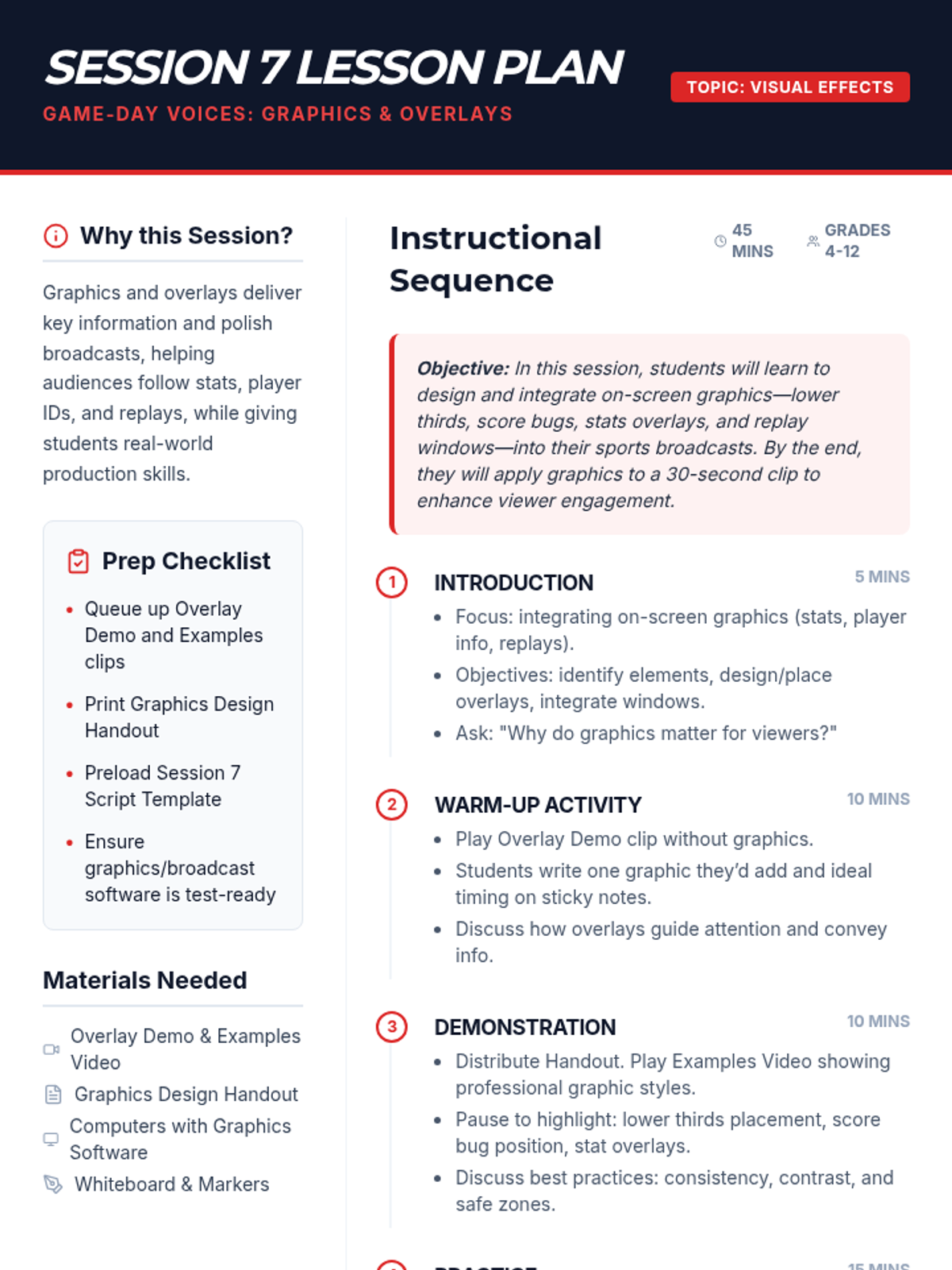 An 8-session sports broadcasting course for grades 4–12, students will learn the fundamentals of play-by-play commentary, color analysis, interviewing, and production skills. Each 45-minute session builds real-world broadcasting abilities, teamwork, and confidence both in the studio and at live events.