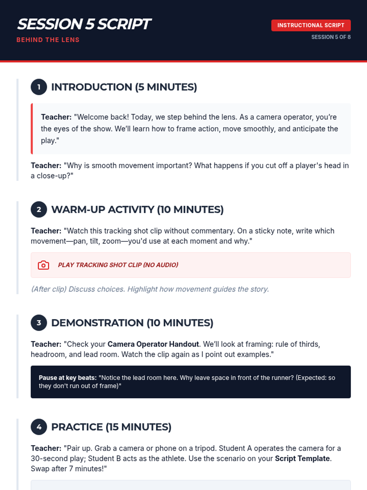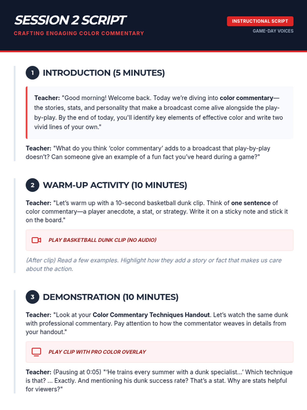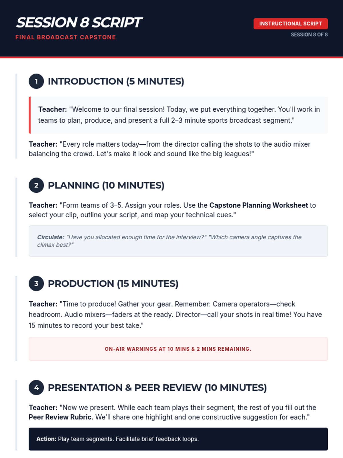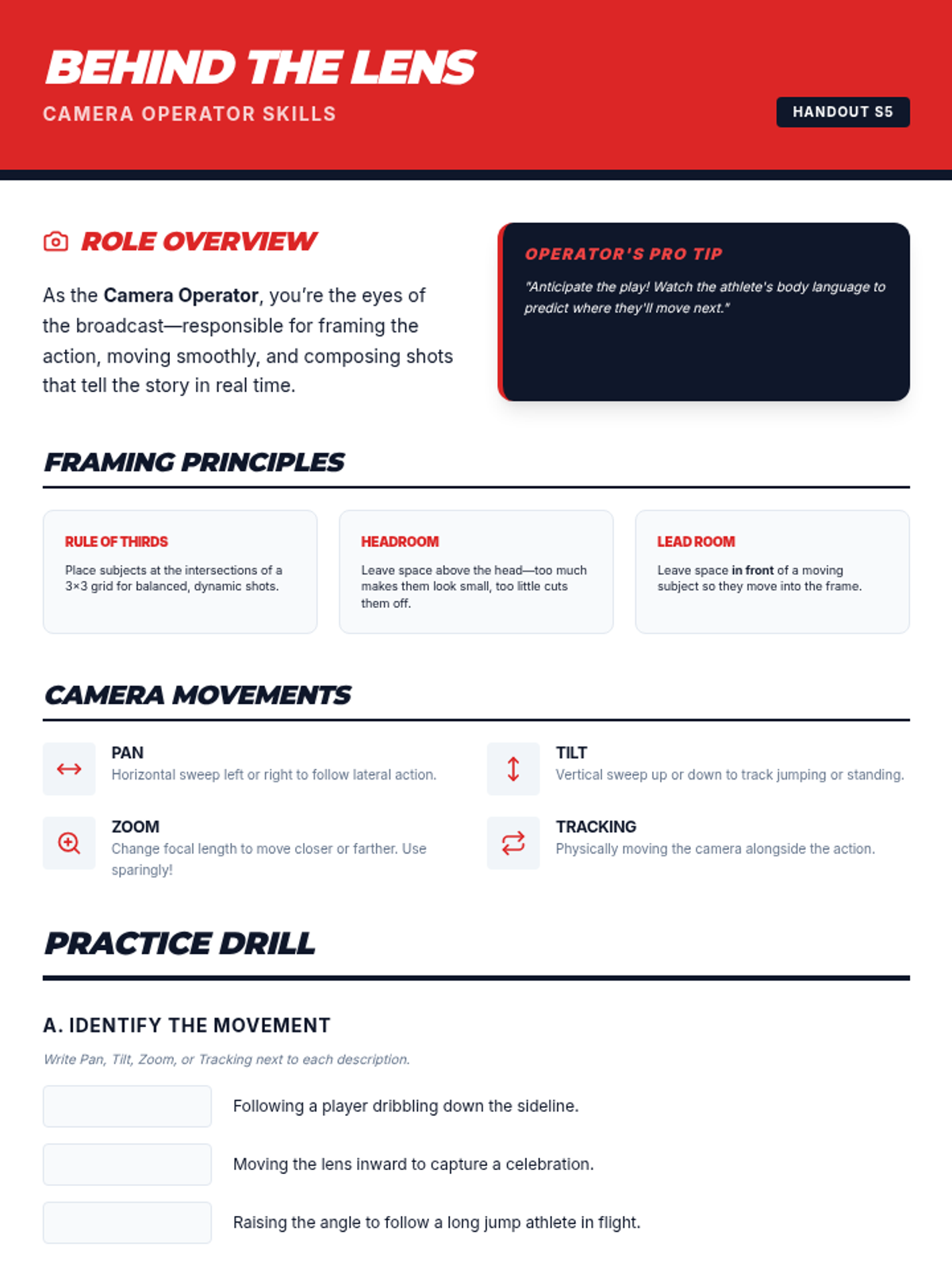 An 8-session sports broadcasting course for grades 4–12, students will learn the fundamentals of play-by-play commentary, color analysis, interviewing, and production skills. Each 45-minute session builds real-world broadcasting abilities, teamwork, and confidence both in the studio and at live events.