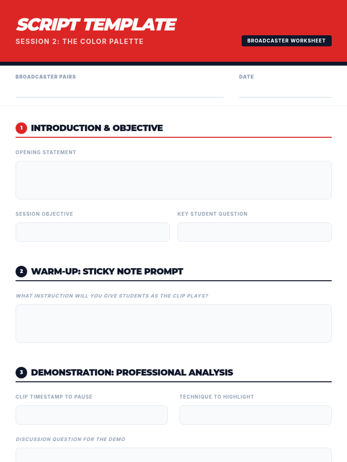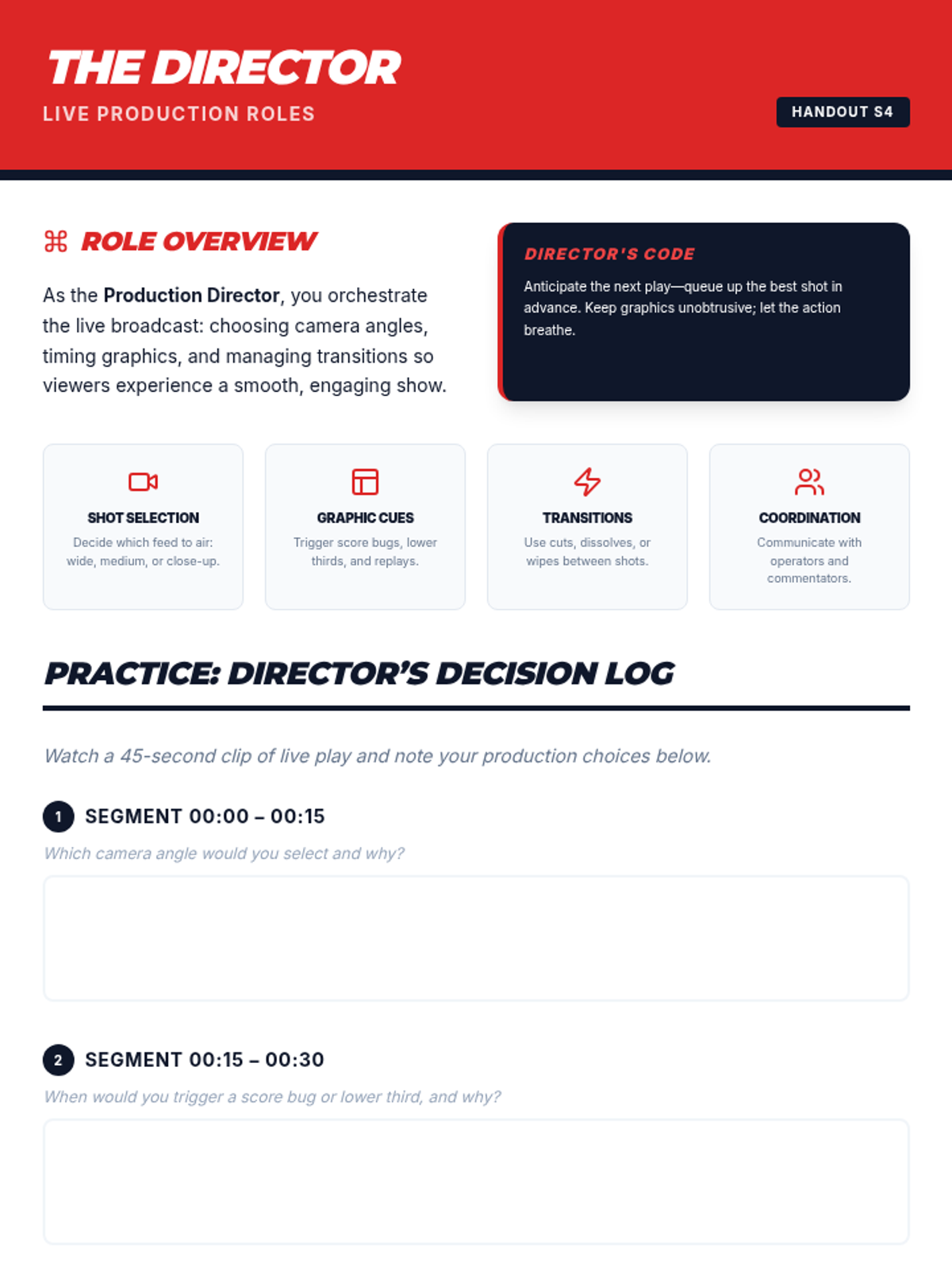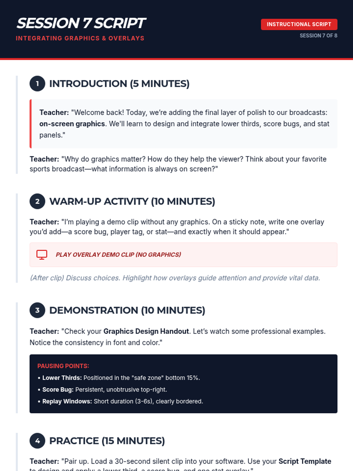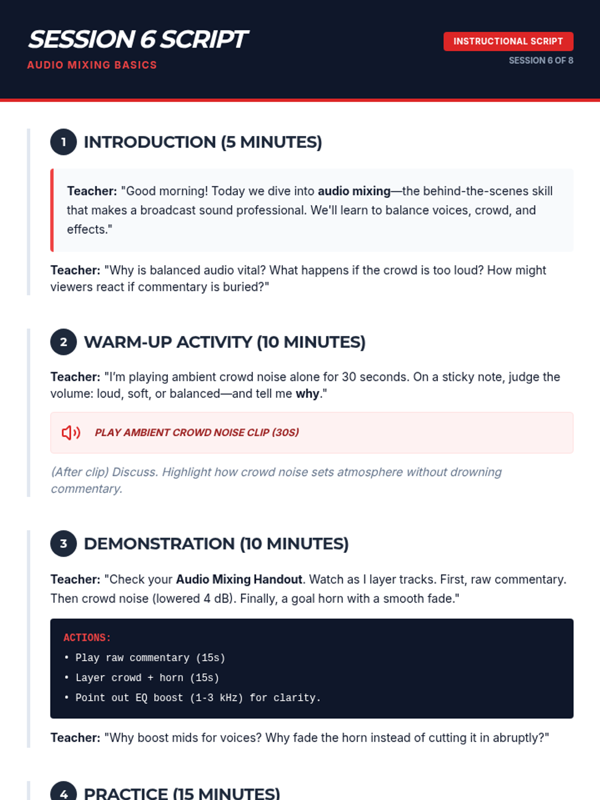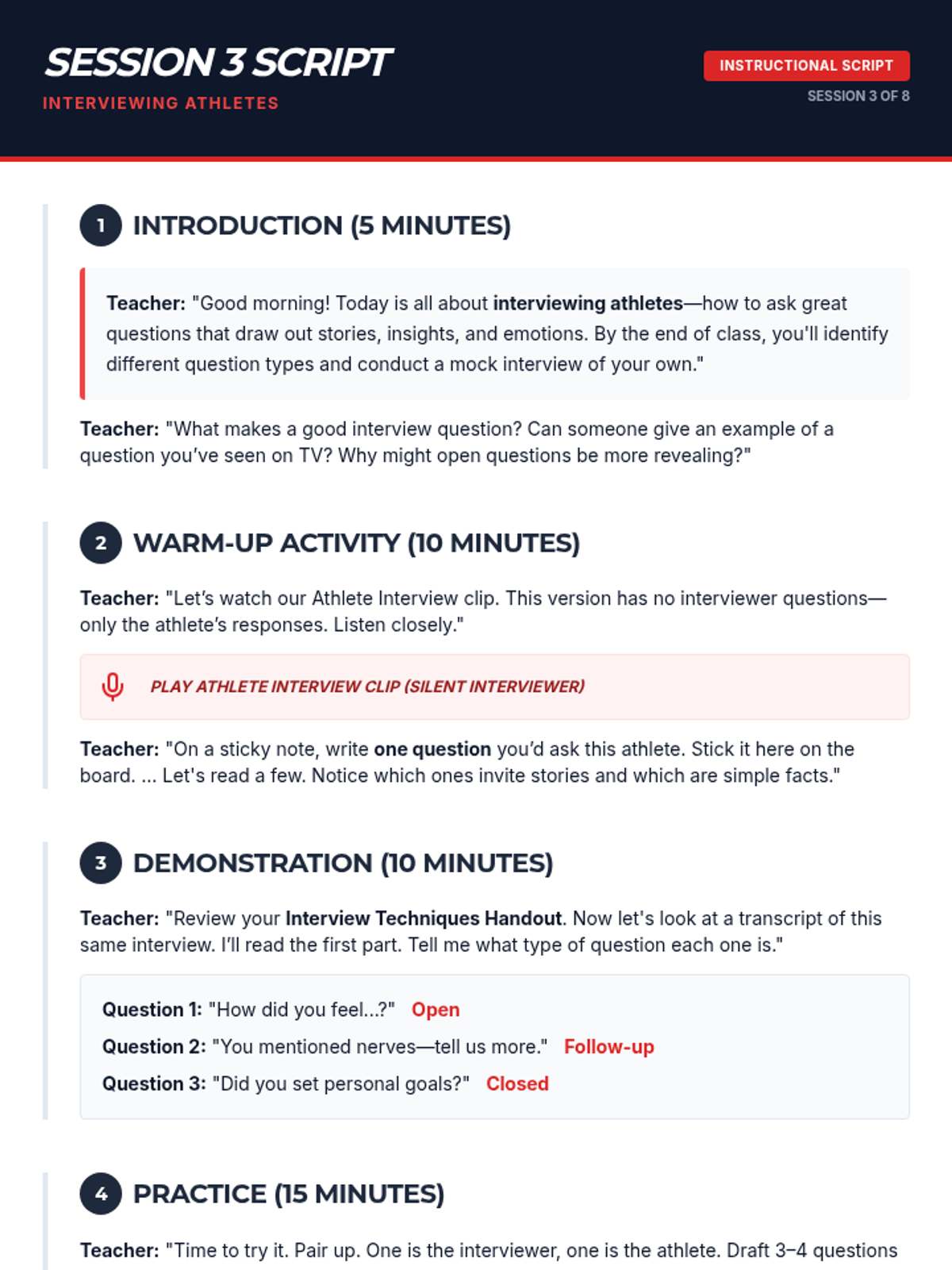 An 8-session sports broadcasting course for grades 4–12, students will learn the fundamentals of play-by-play commentary, color analysis, interviewing, and production skills. Each 45-minute session builds real-world broadcasting abilities, teamwork, and confidence both in the studio and at live events.