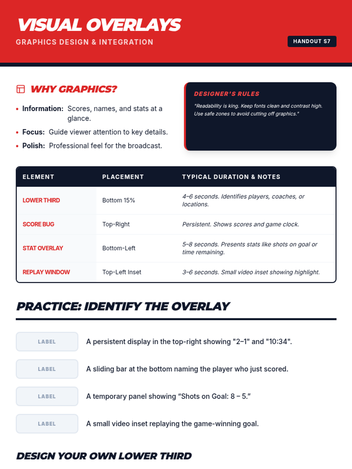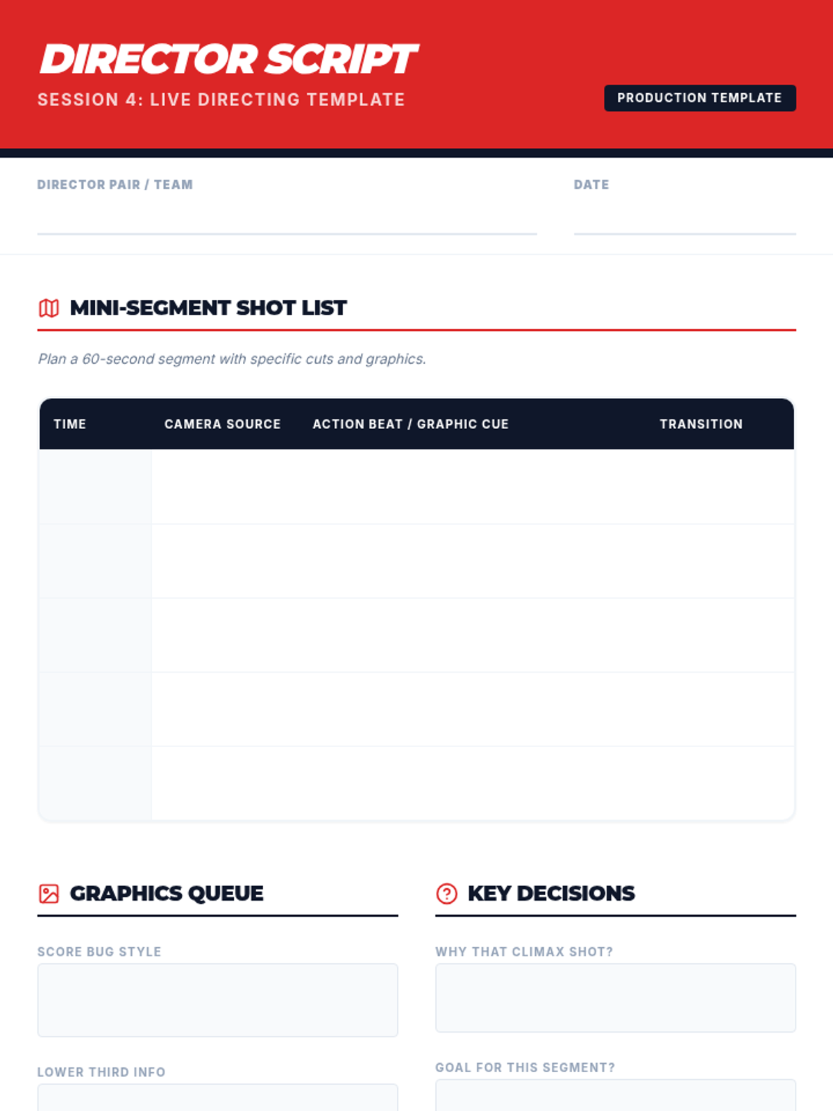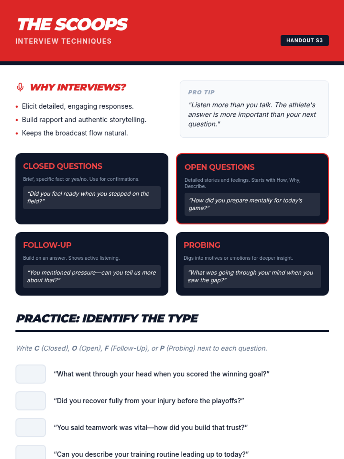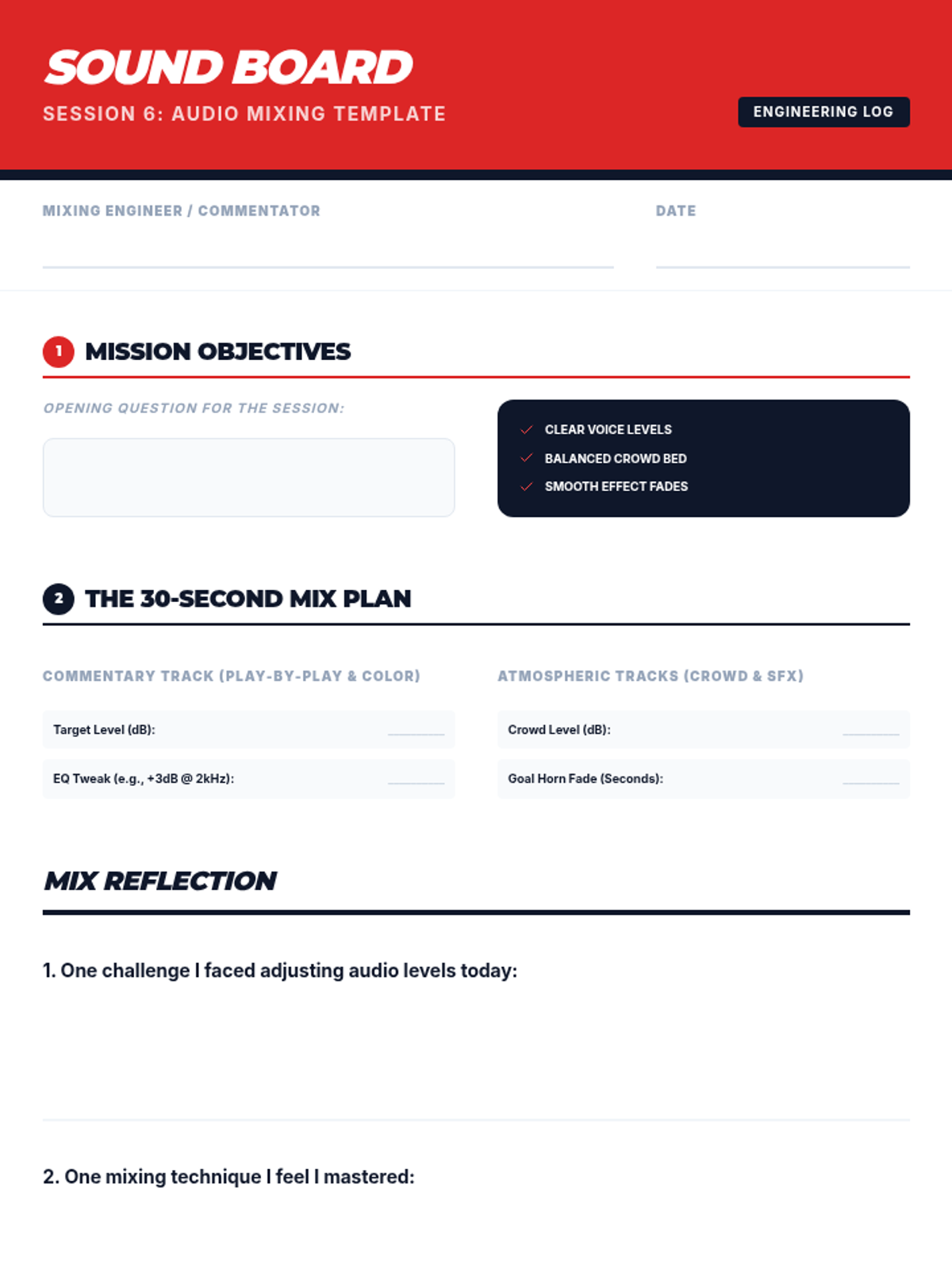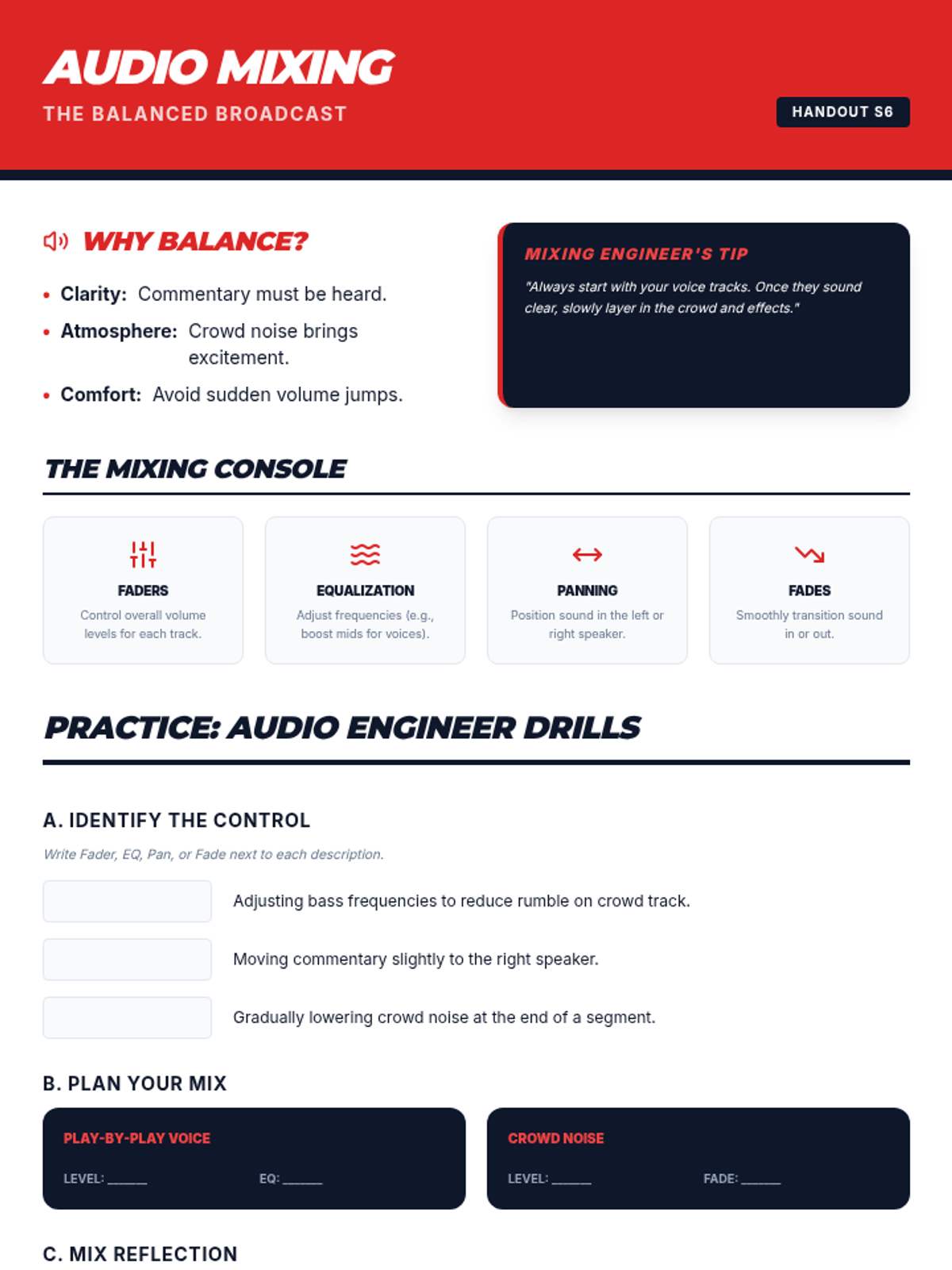 An 8-session sports broadcasting course for grades 4–12, students will learn the fundamentals of play-by-play commentary, color analysis, interviewing, and production skills. Each 45-minute session builds real-world broadcasting abilities, teamwork, and confidence both in the studio and at live events.