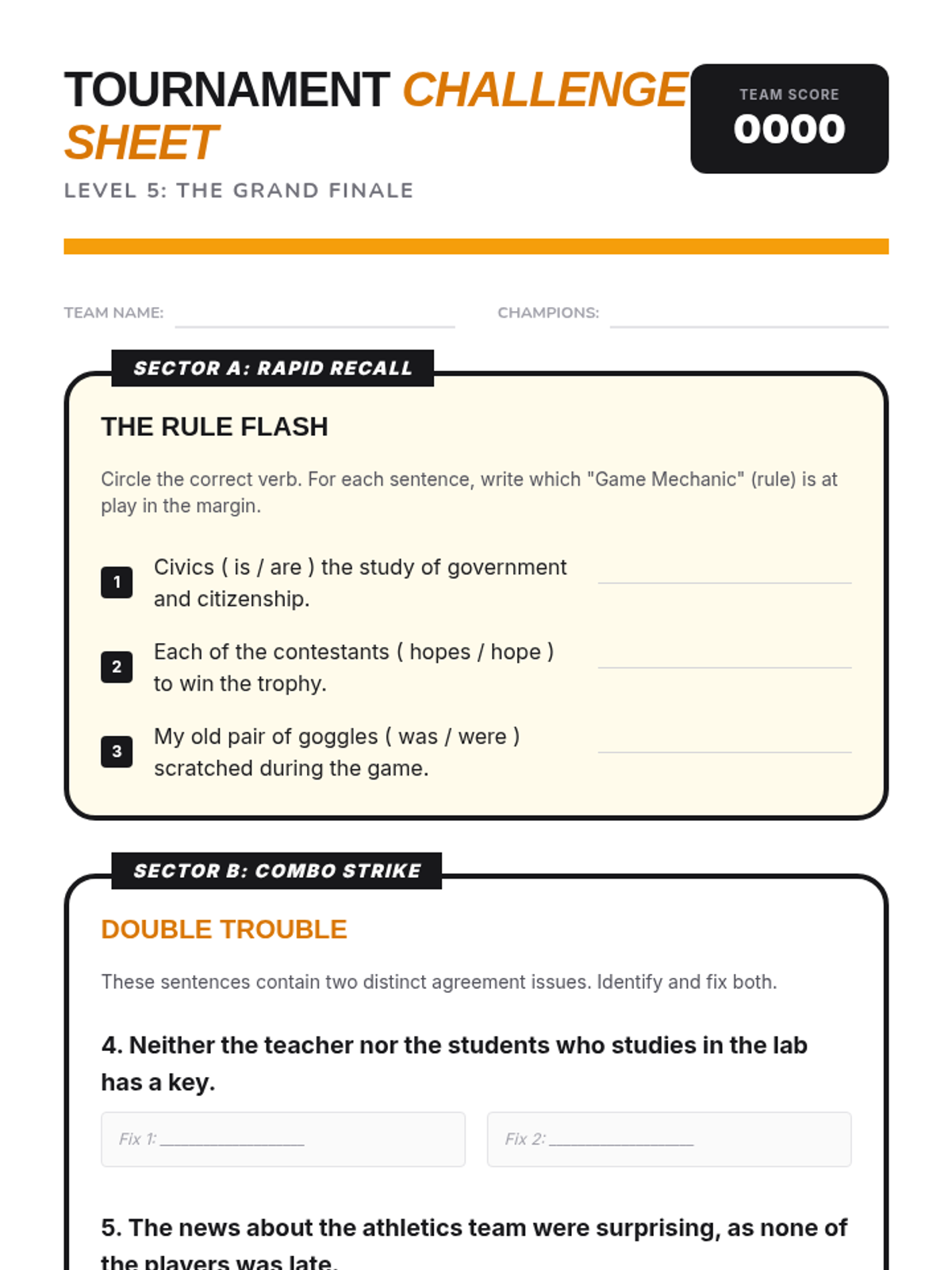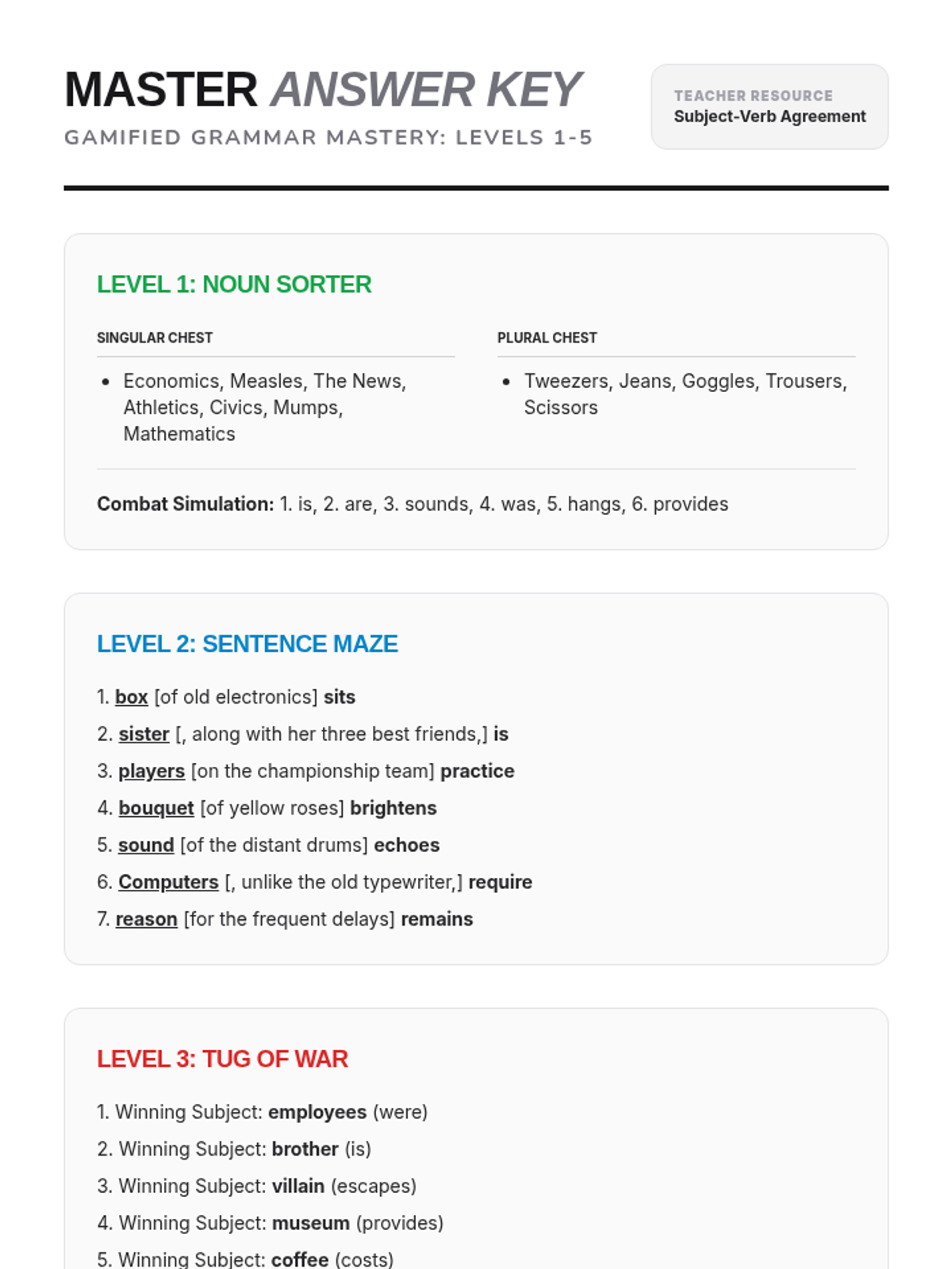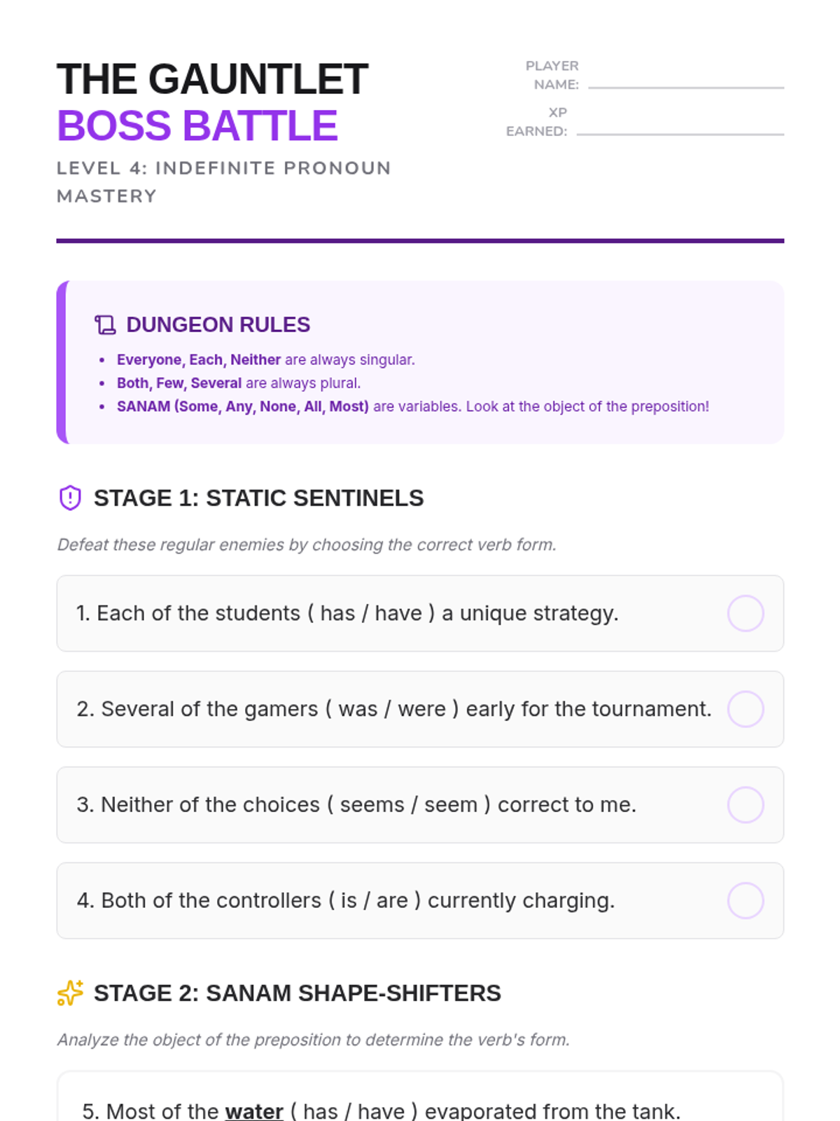 A high-energy, gamified sequence focused on mastering subject-verb agreement. Students treat grammar rules as game mechanics, progressing through levels of increasing complexity from irregular nouns to the 'SANAM' rule.