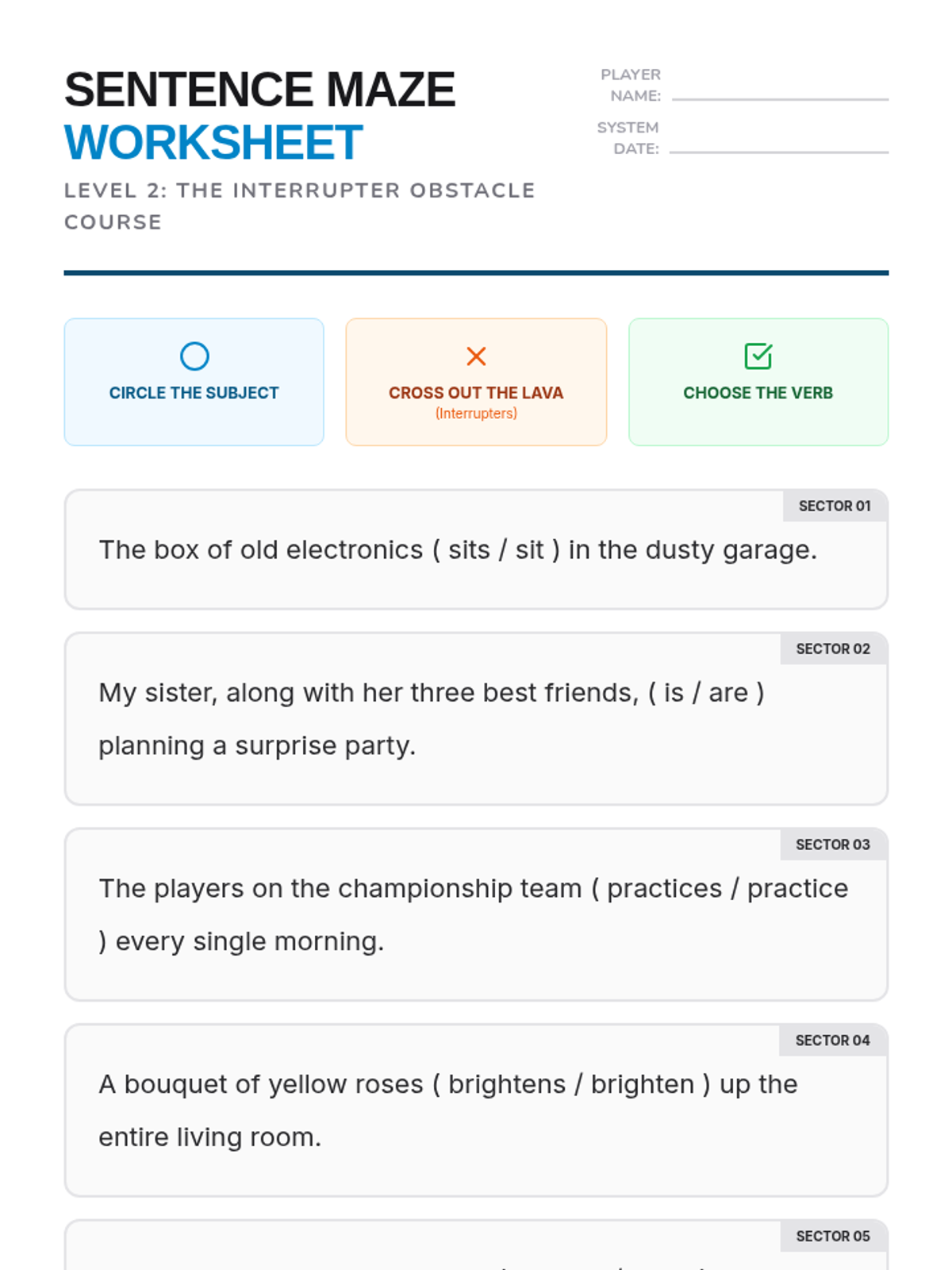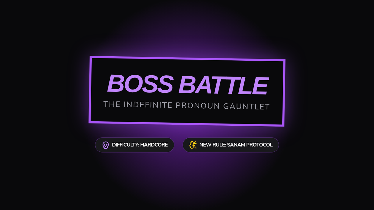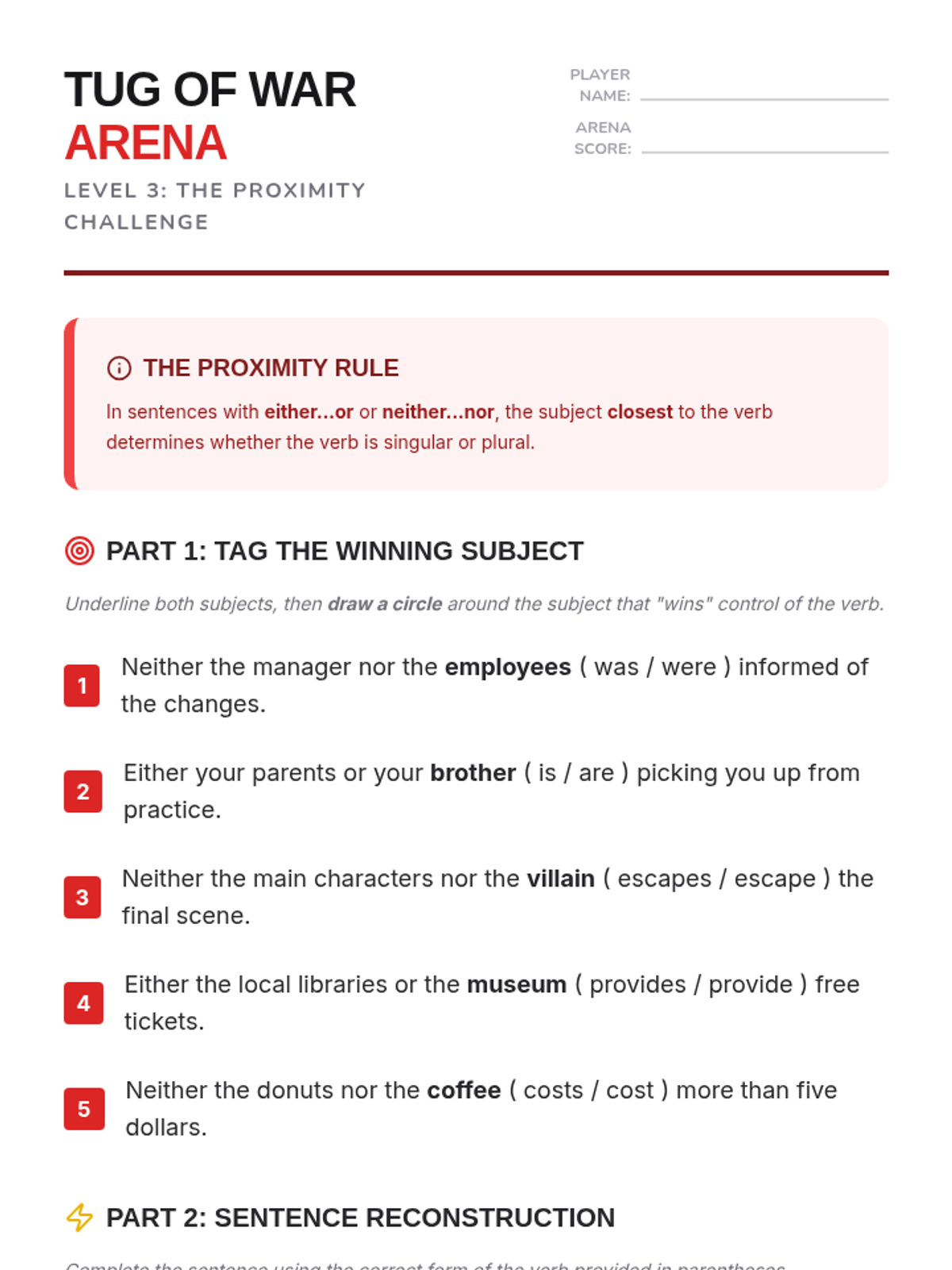 A high-energy, gamified sequence focused on mastering subject-verb agreement. Students treat grammar rules as game mechanics, progressing through levels of increasing complexity from irregular nouns to the 'SANAM' rule.