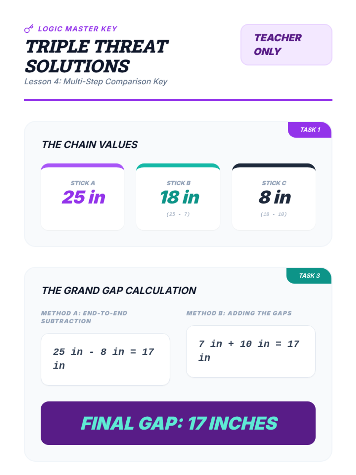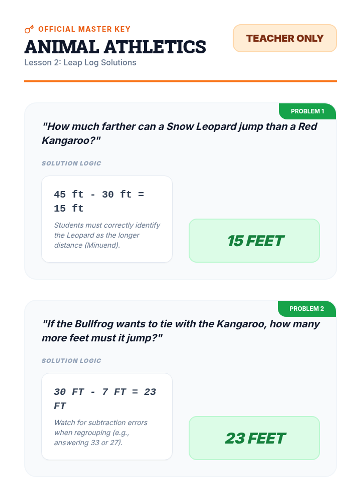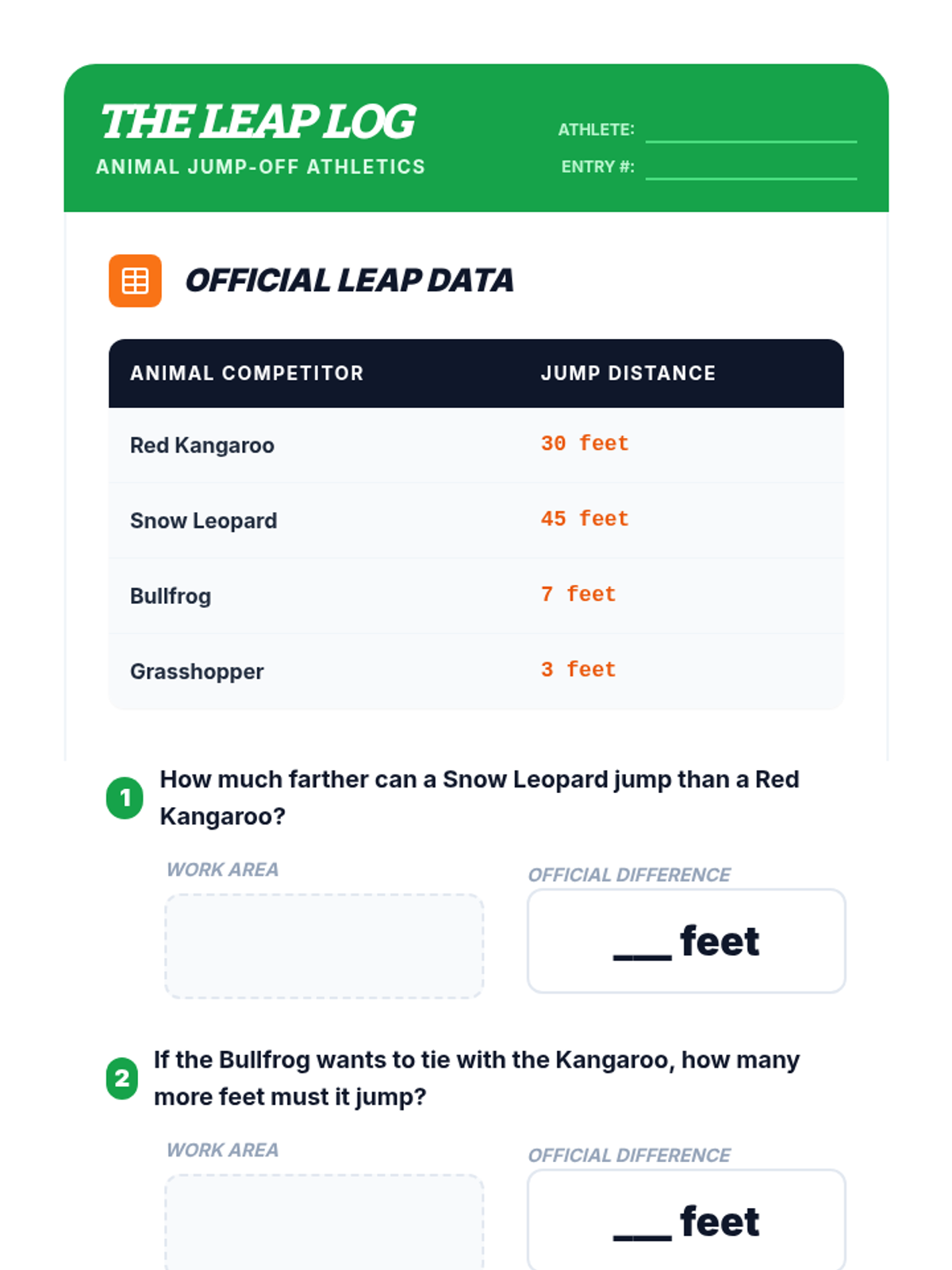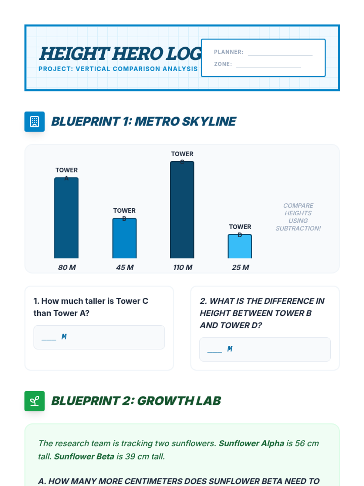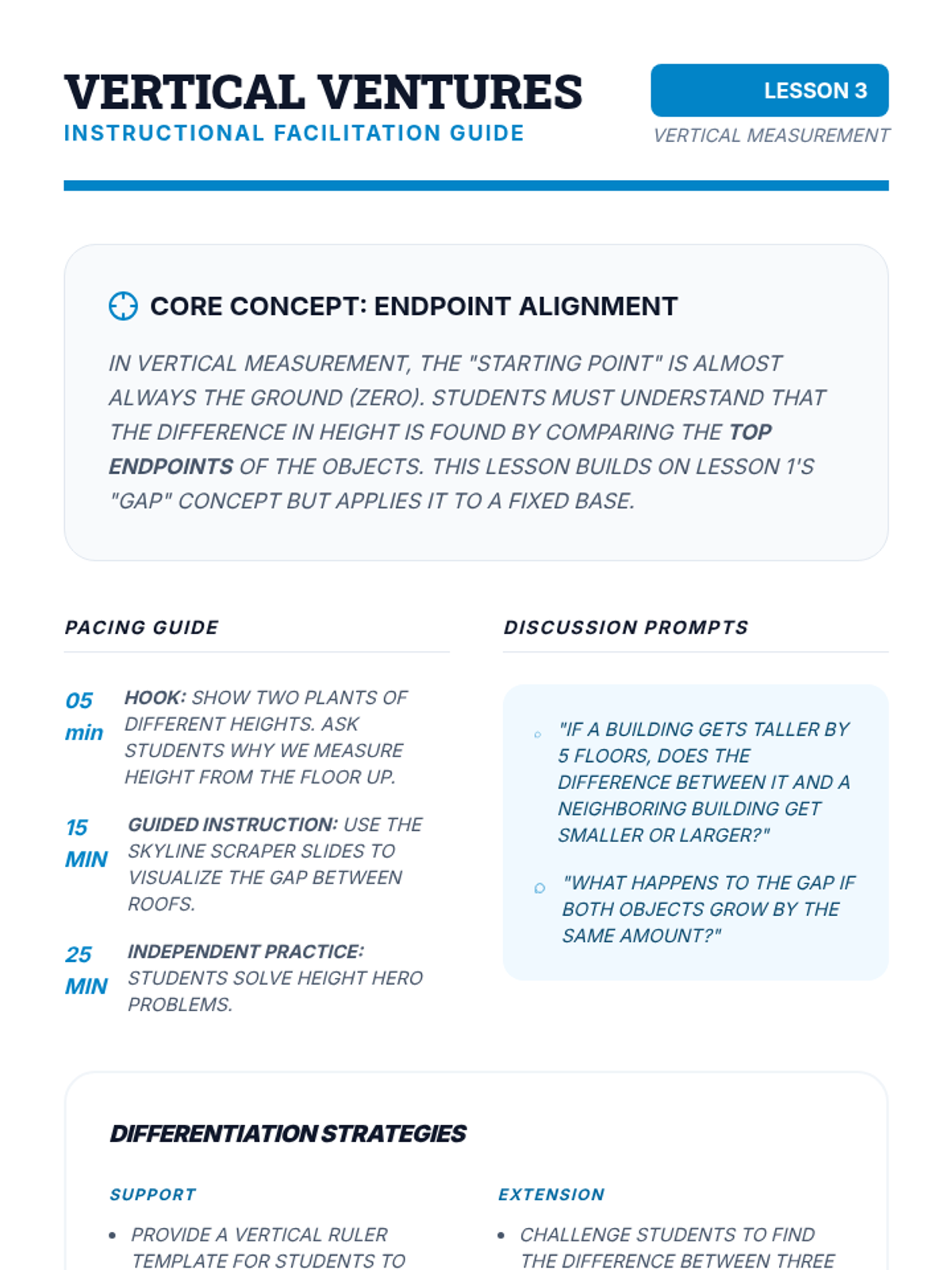 A 5-lesson math sequence for 3rd graders focusing on the relationship between addition/subtraction and length. Students explore 'difference' through animal jumps, vertical height comparisons, and multi-step data analysis.