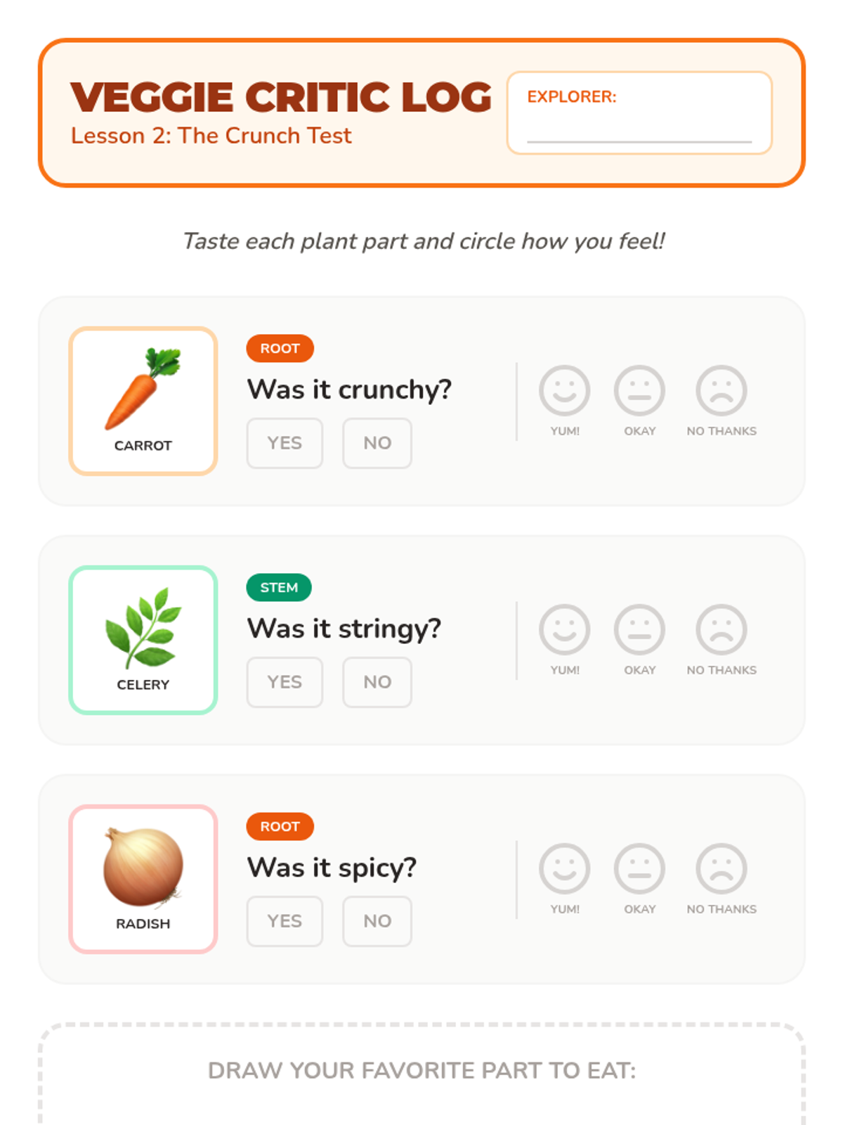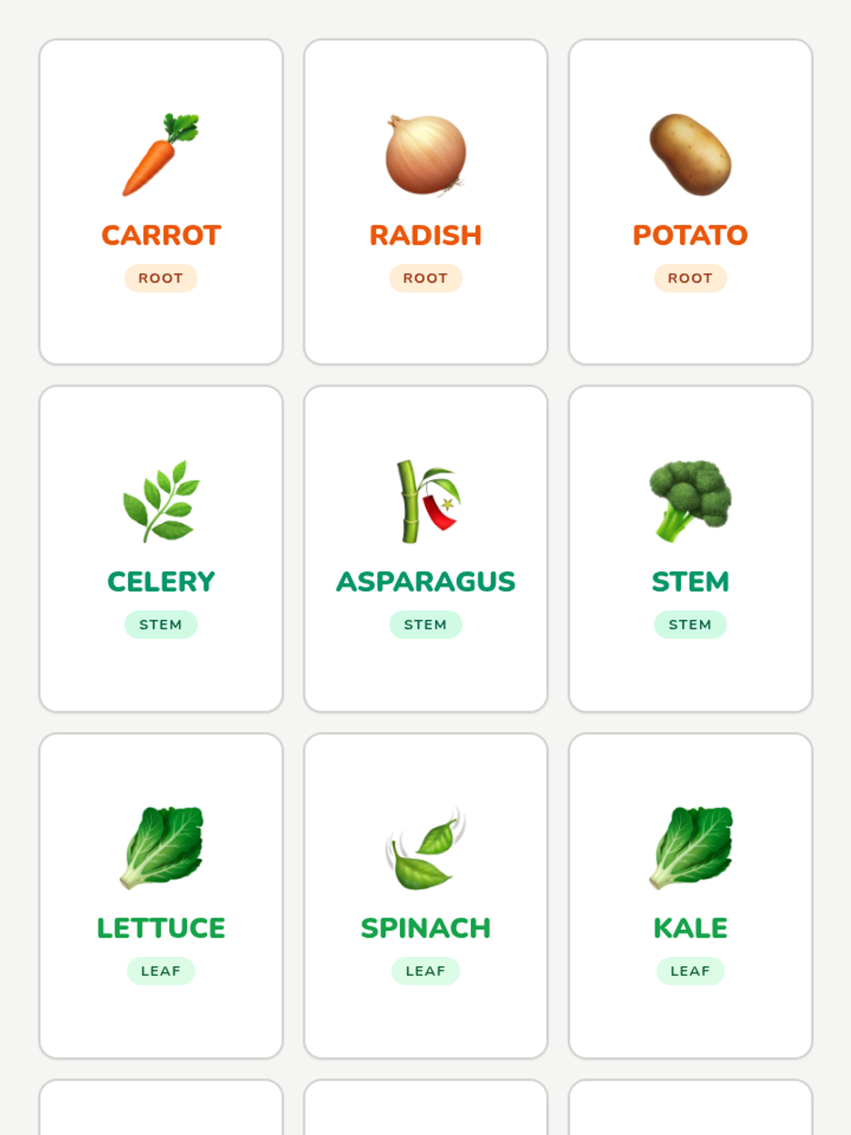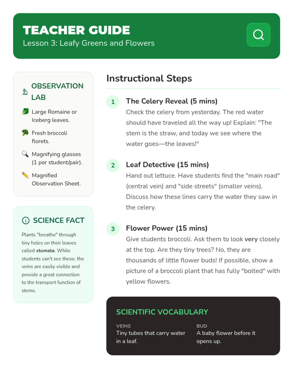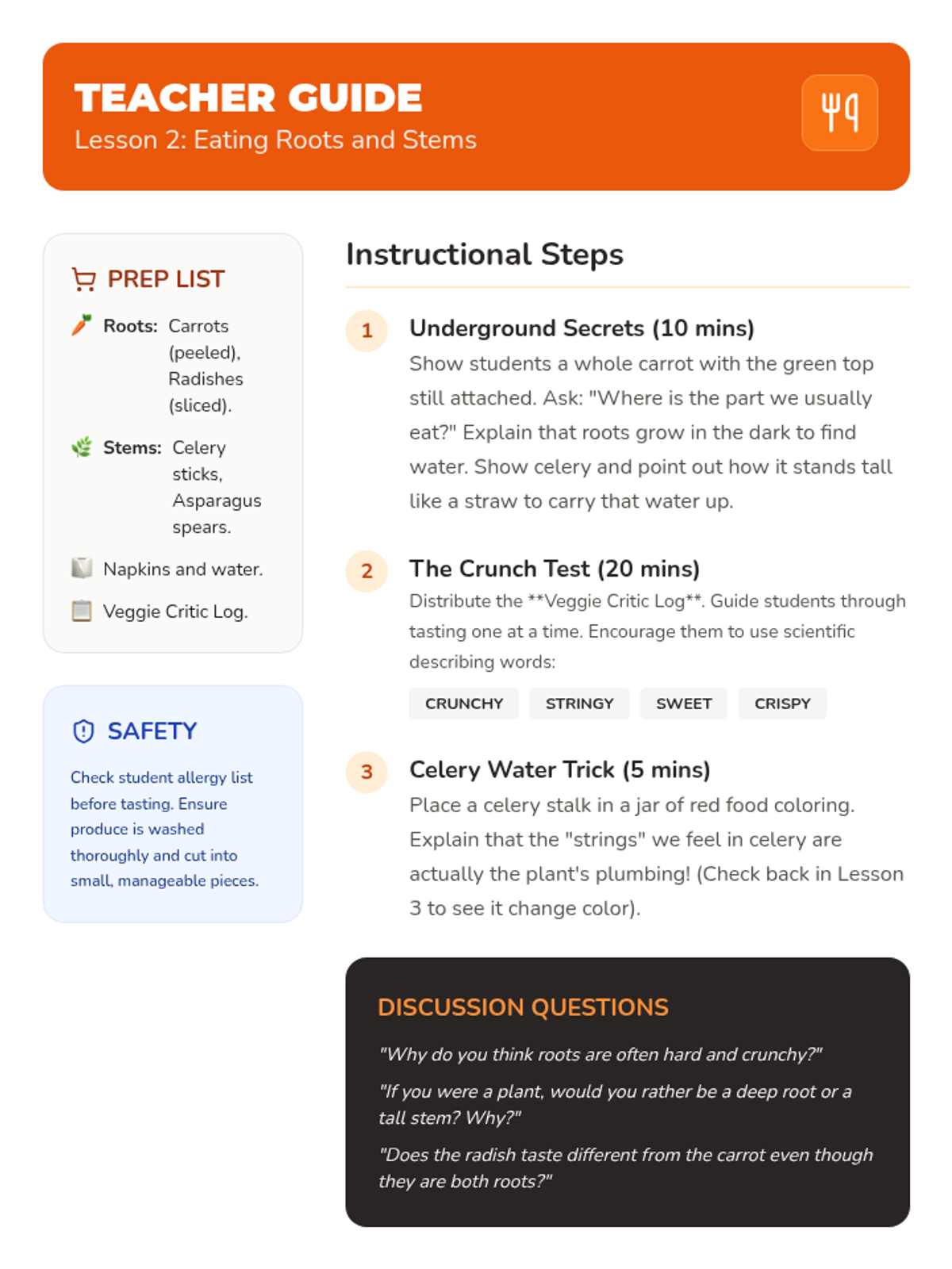 A Kindergarten science sequence where students explore plant diversity through the lens of agriculture and nutrition, identifying which parts of plants we eat (roots, stems, leaves, flowers, fruits, and seeds).