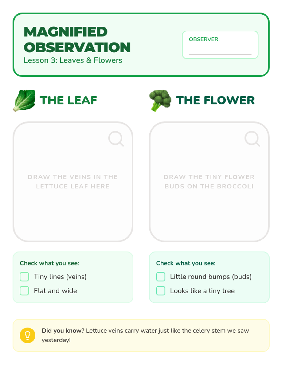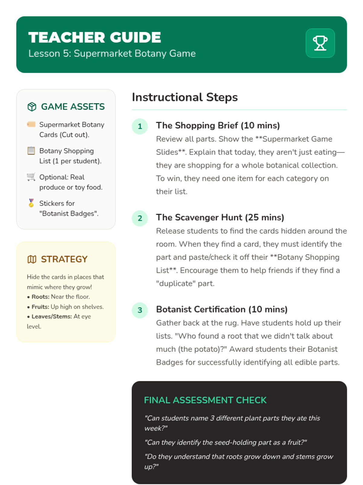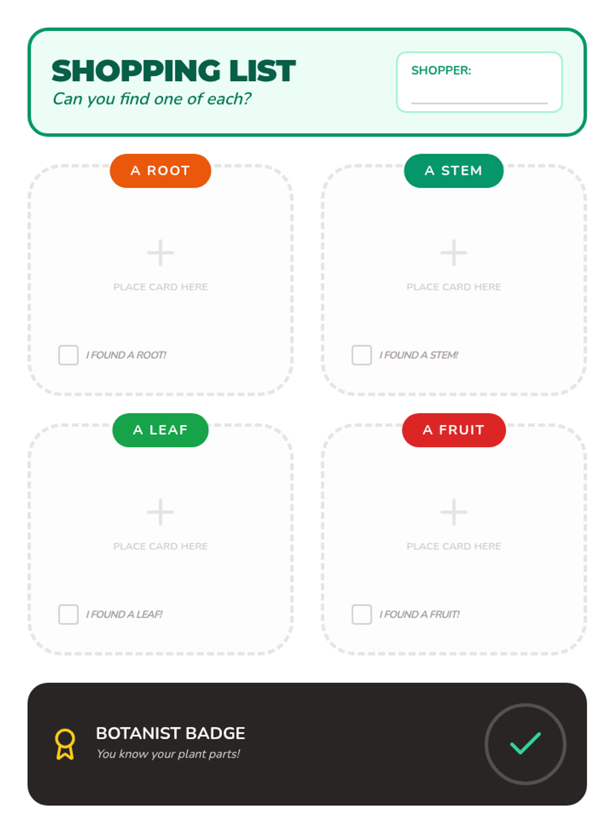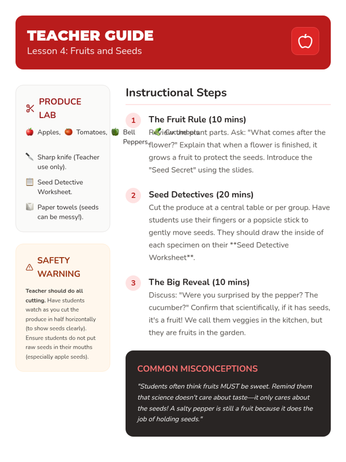 A Kindergarten science sequence where students explore plant diversity through the lens of agriculture and nutrition, identifying which parts of plants we eat (roots, stems, leaves, flowers, fruits, and seeds).