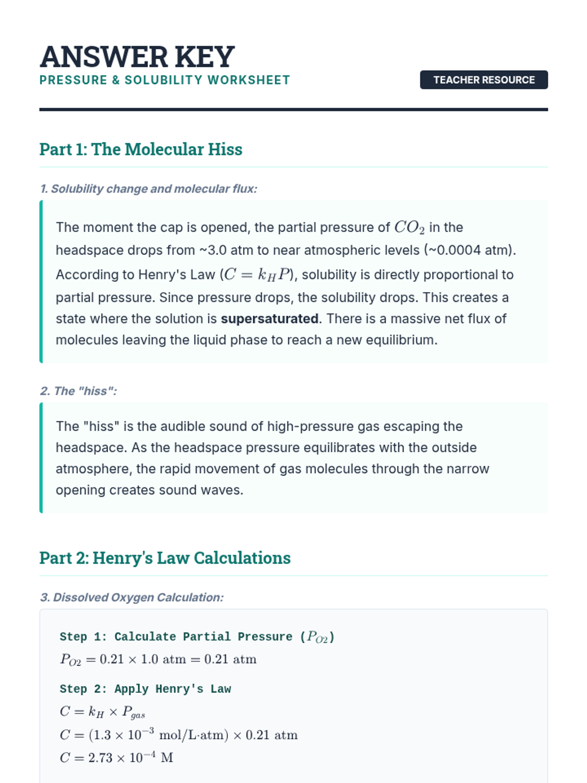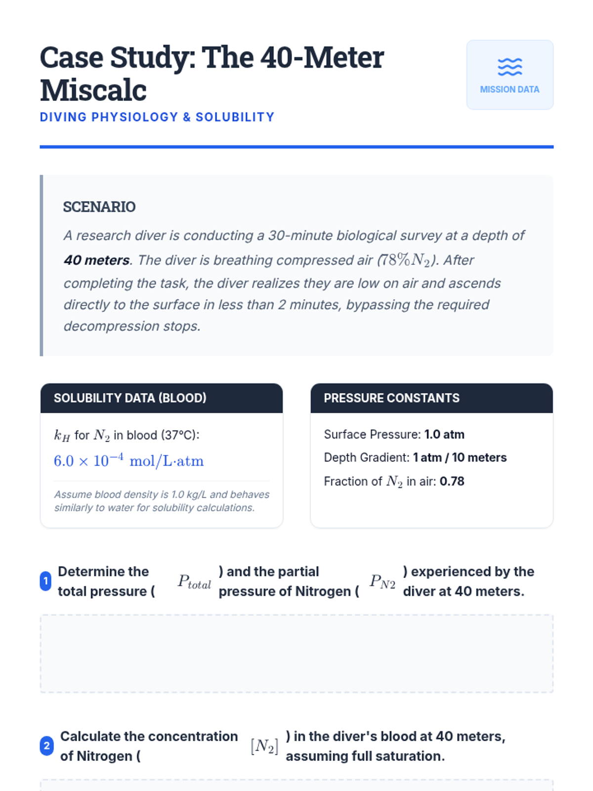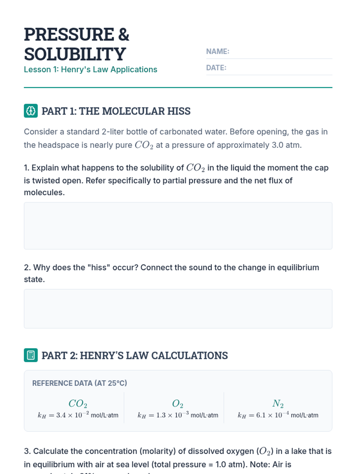 This undergraduate chemistry sequence explores the principles of gas solubility, specifically Henry's Law, and applies them to physiological, environmental, and industrial contexts. Students move from theoretical calculations to analyzing real-world systems like decompression sickness, thermal pollution, and ocean acidification.