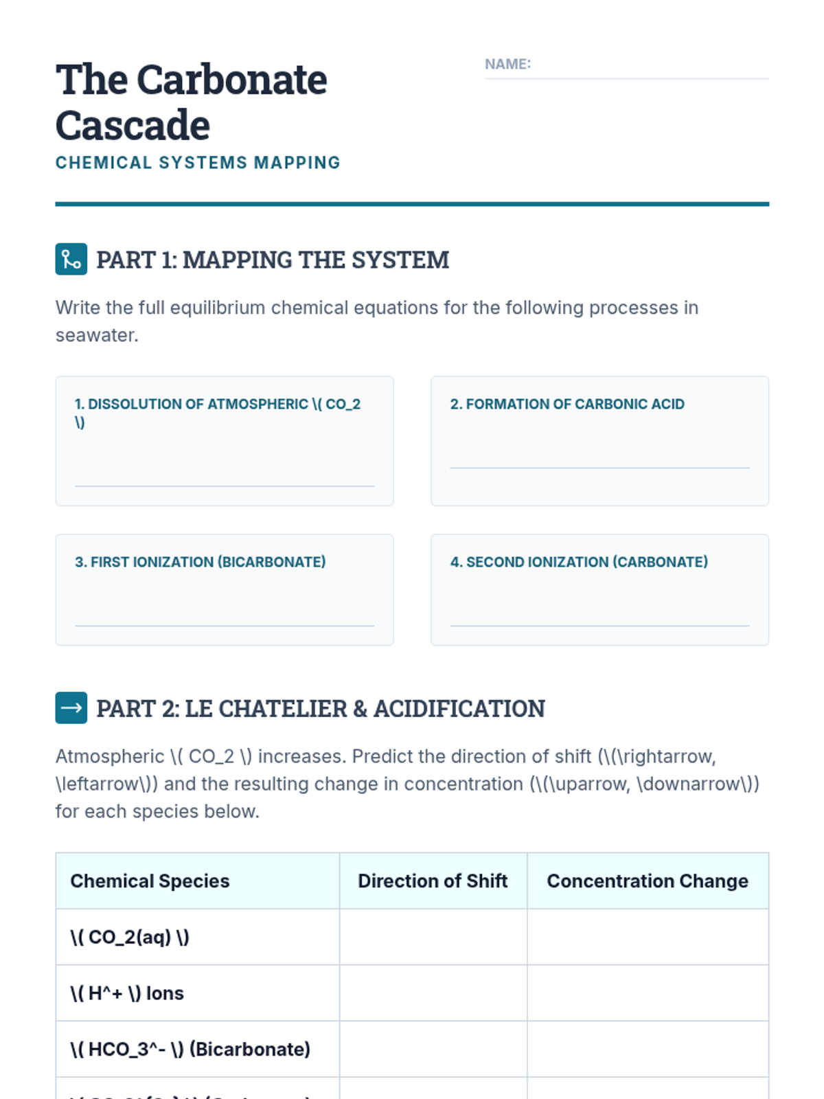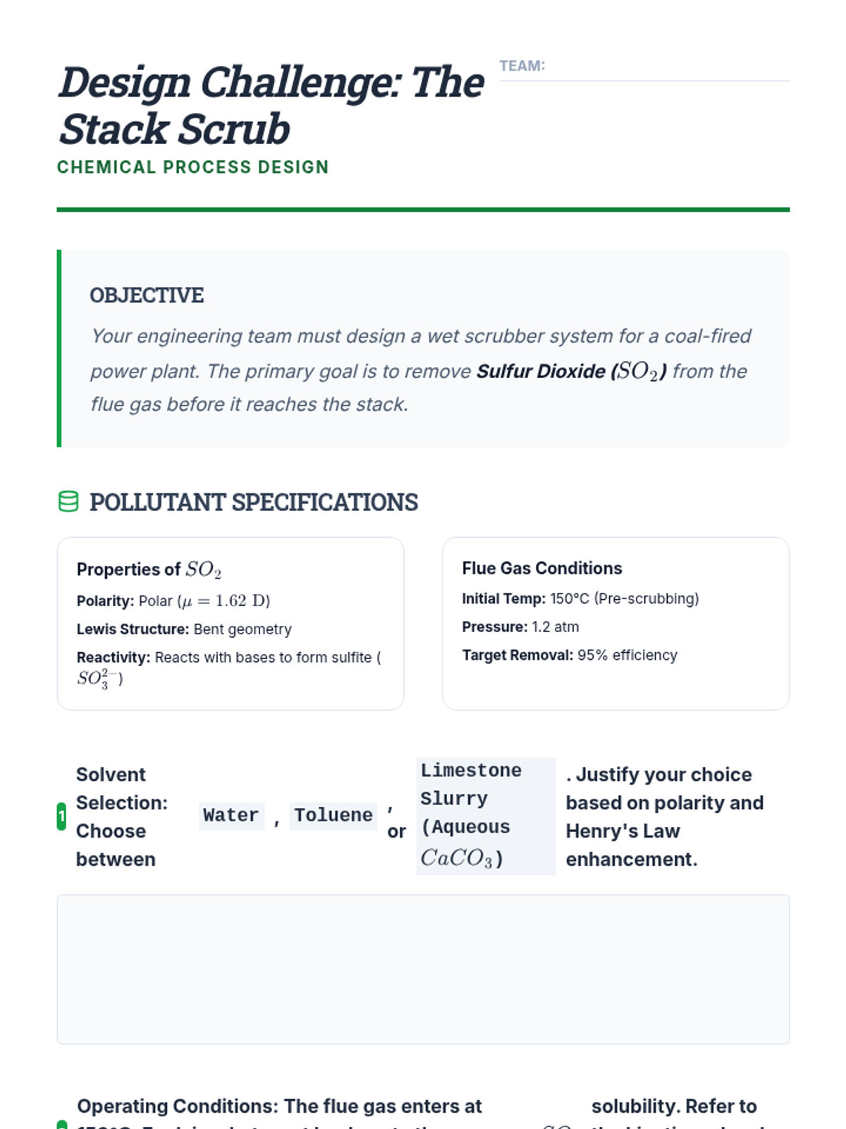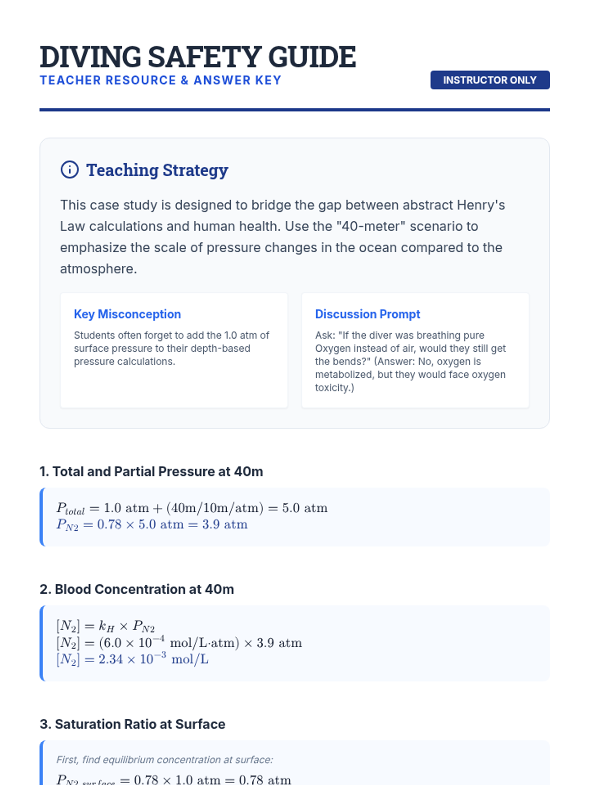 This undergraduate chemistry sequence explores the principles of gas solubility, specifically Henry's Law, and applies them to physiological, environmental, and industrial contexts. Students move from theoretical calculations to analyzing real-world systems like decompression sickness, thermal pollution, and ocean acidification.