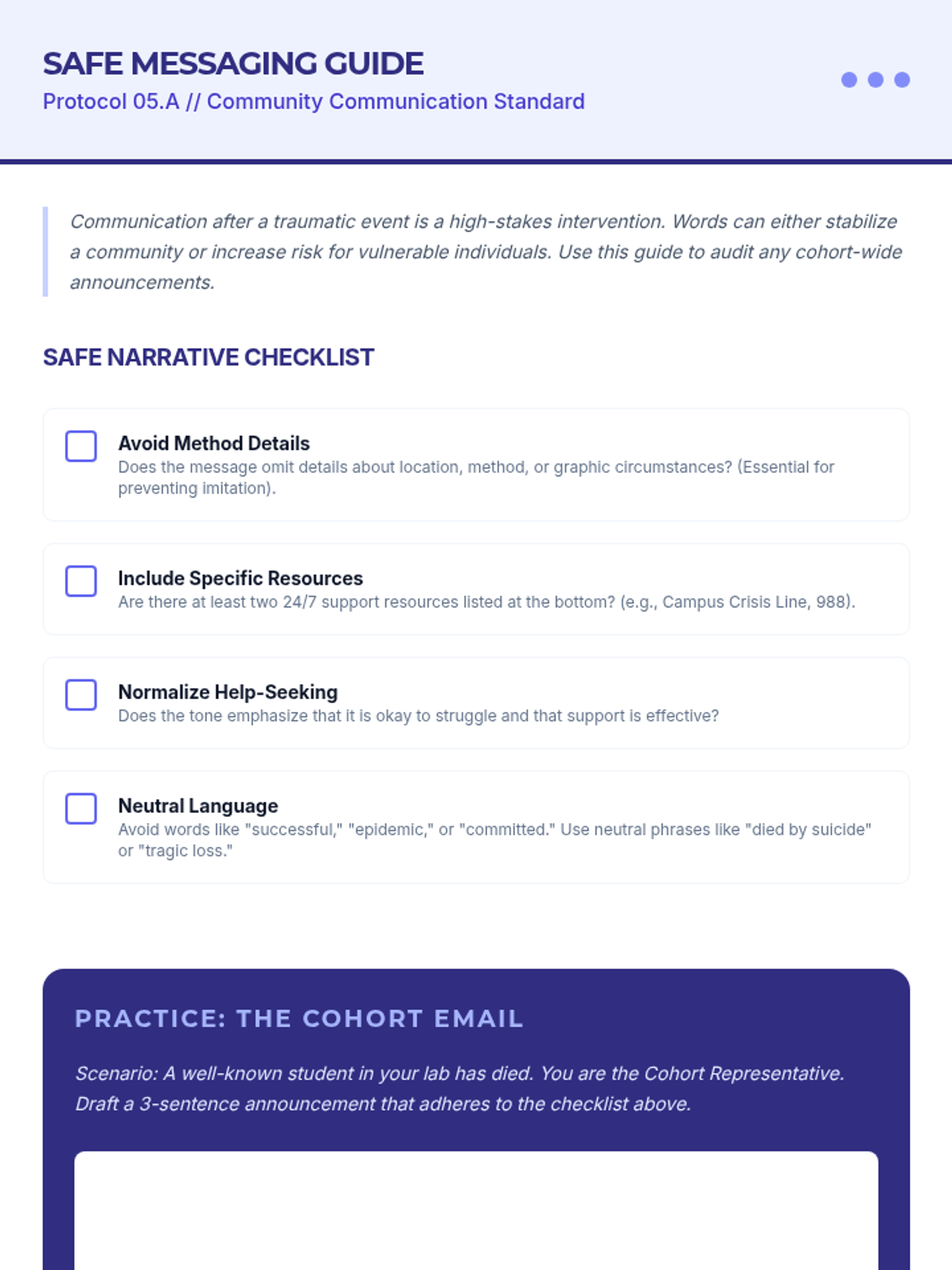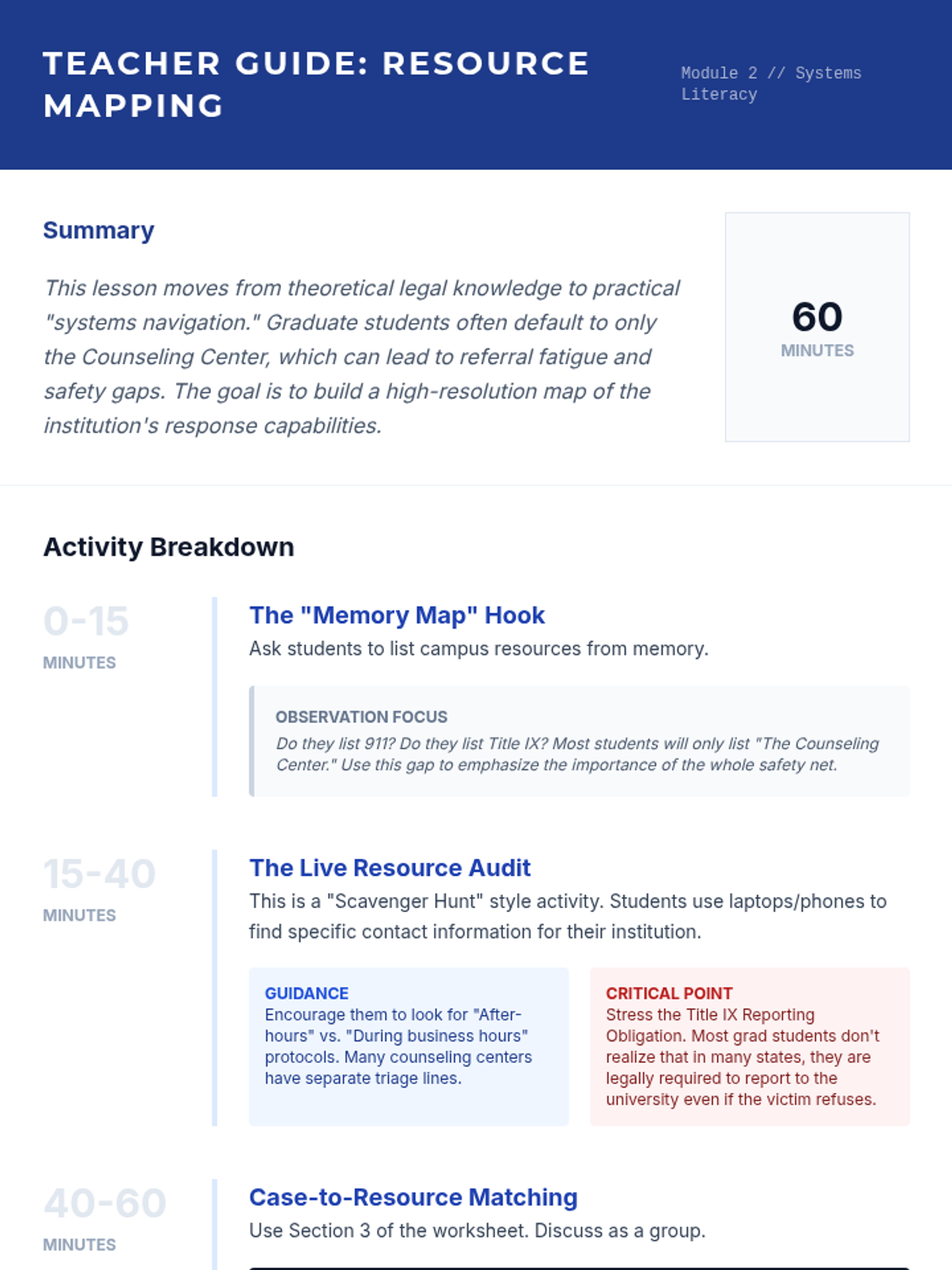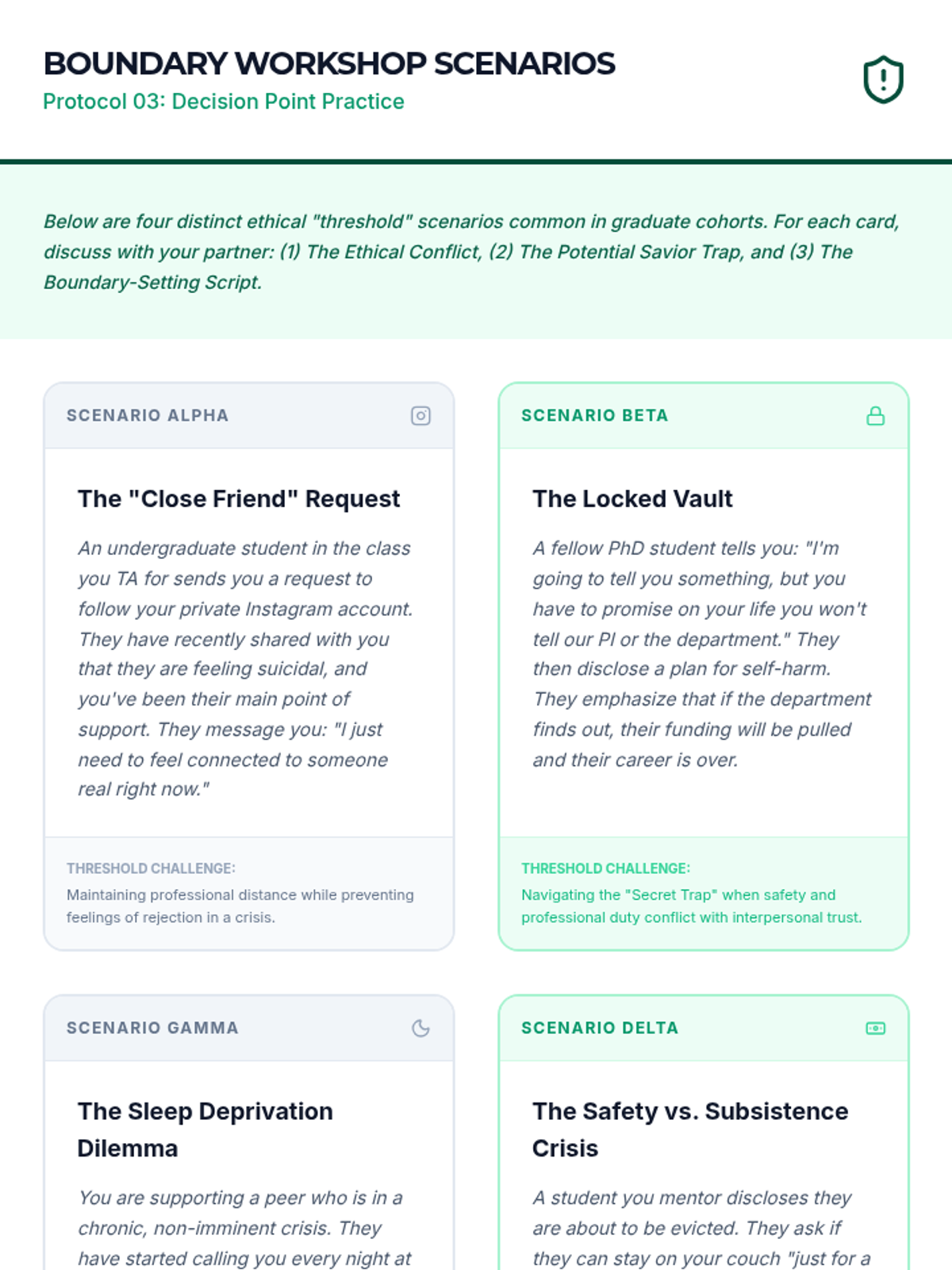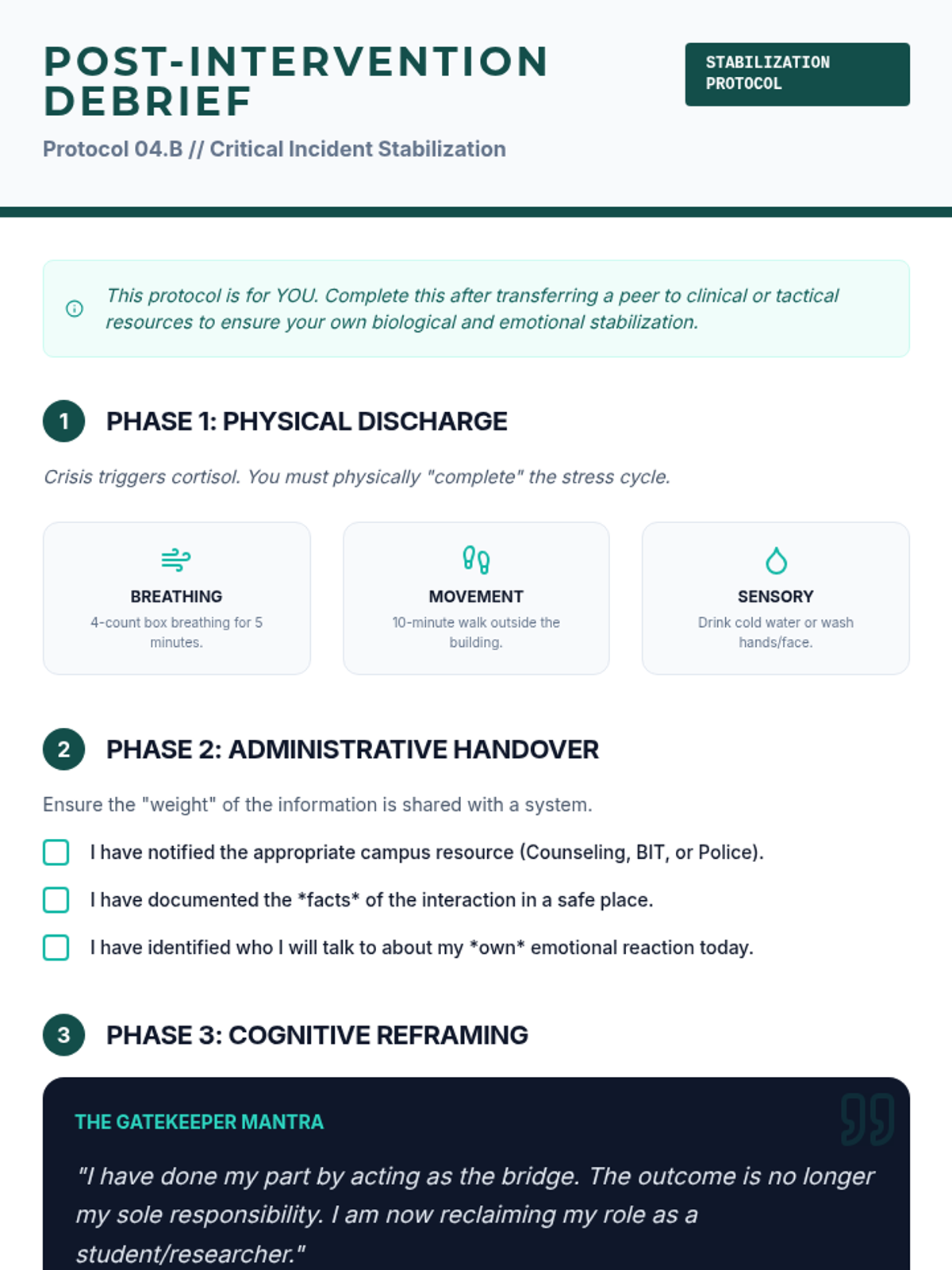 A comprehensive training for graduate student leaders on the legal, ethical, and systemic dimensions of peer gatekeeping in university settings. This sequence bridges the gap between supportive listening and institutional crisis intervention.