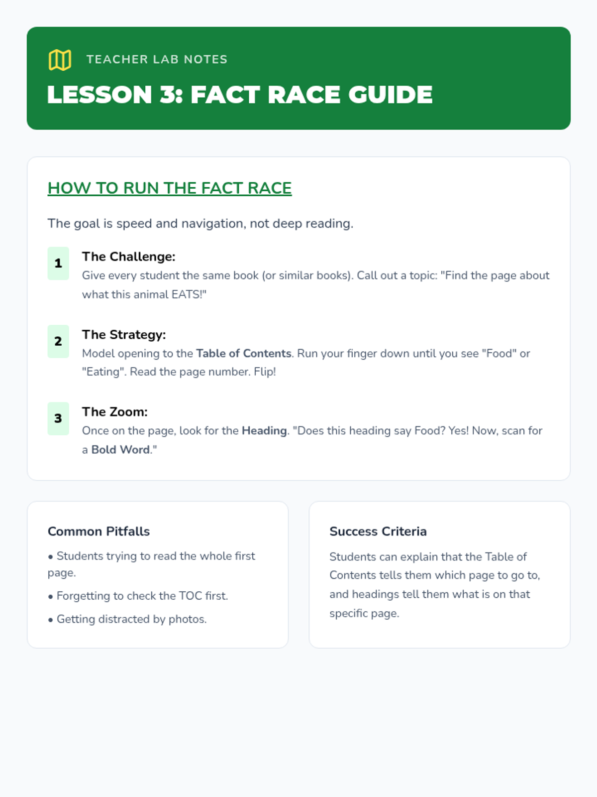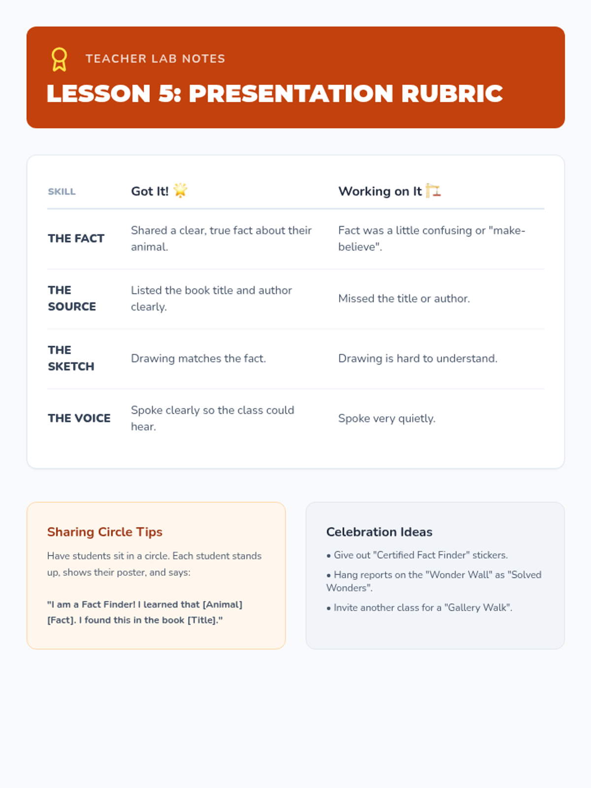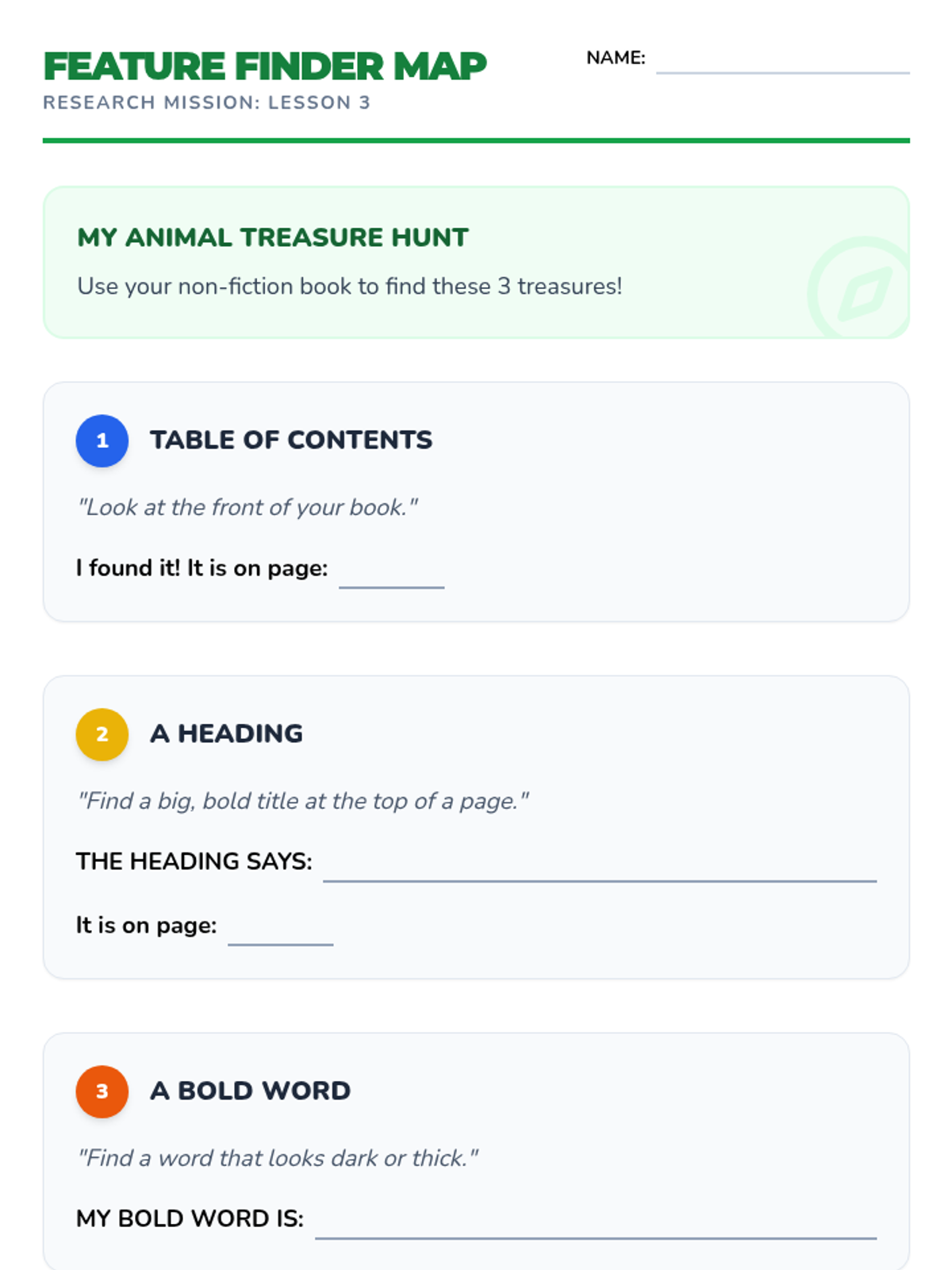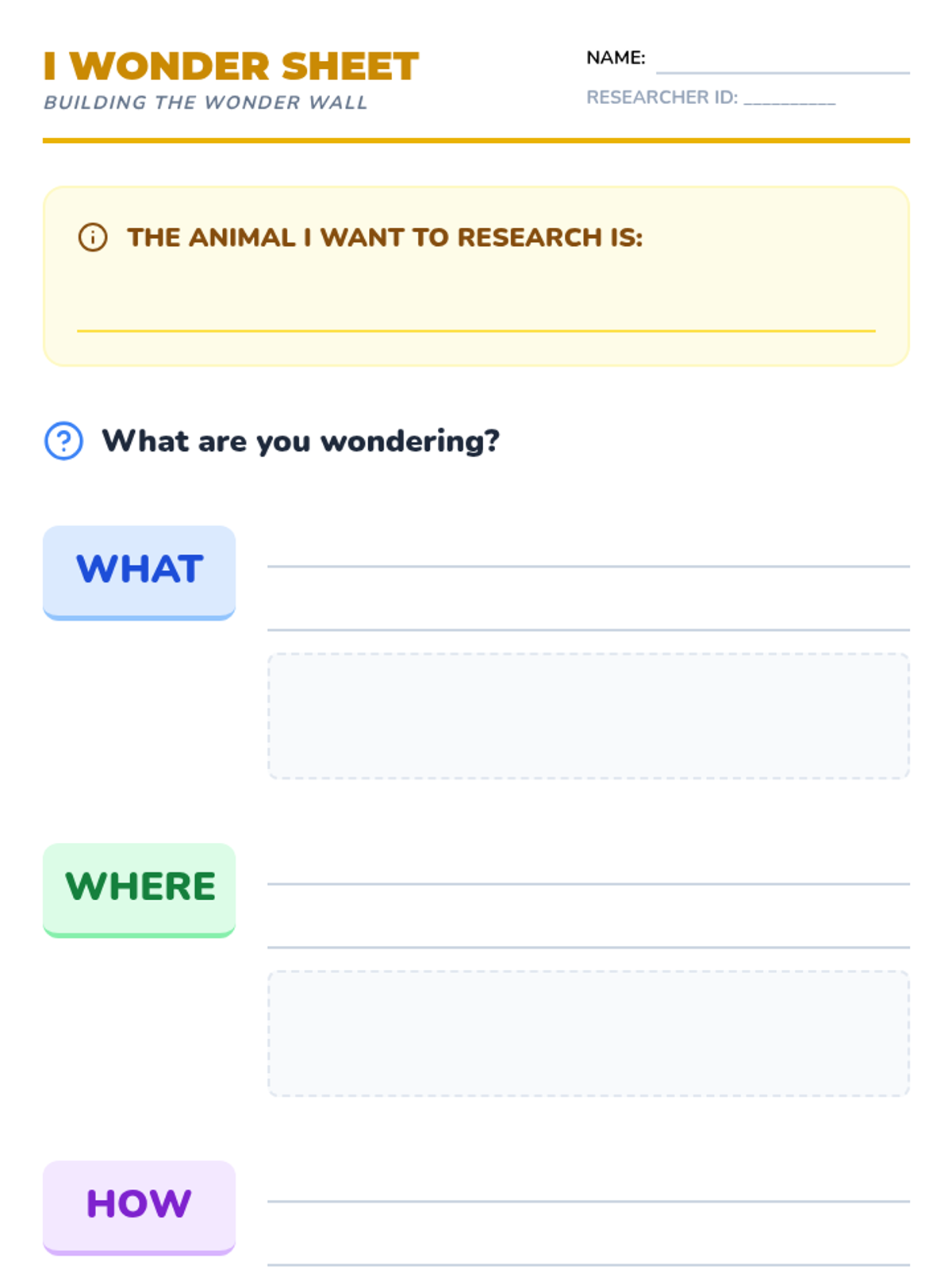 A first-grade sequence introduced students to the foundational steps of the research process through animal studies, focusing on source evaluation, inquiry questions, text features, and simple citation.