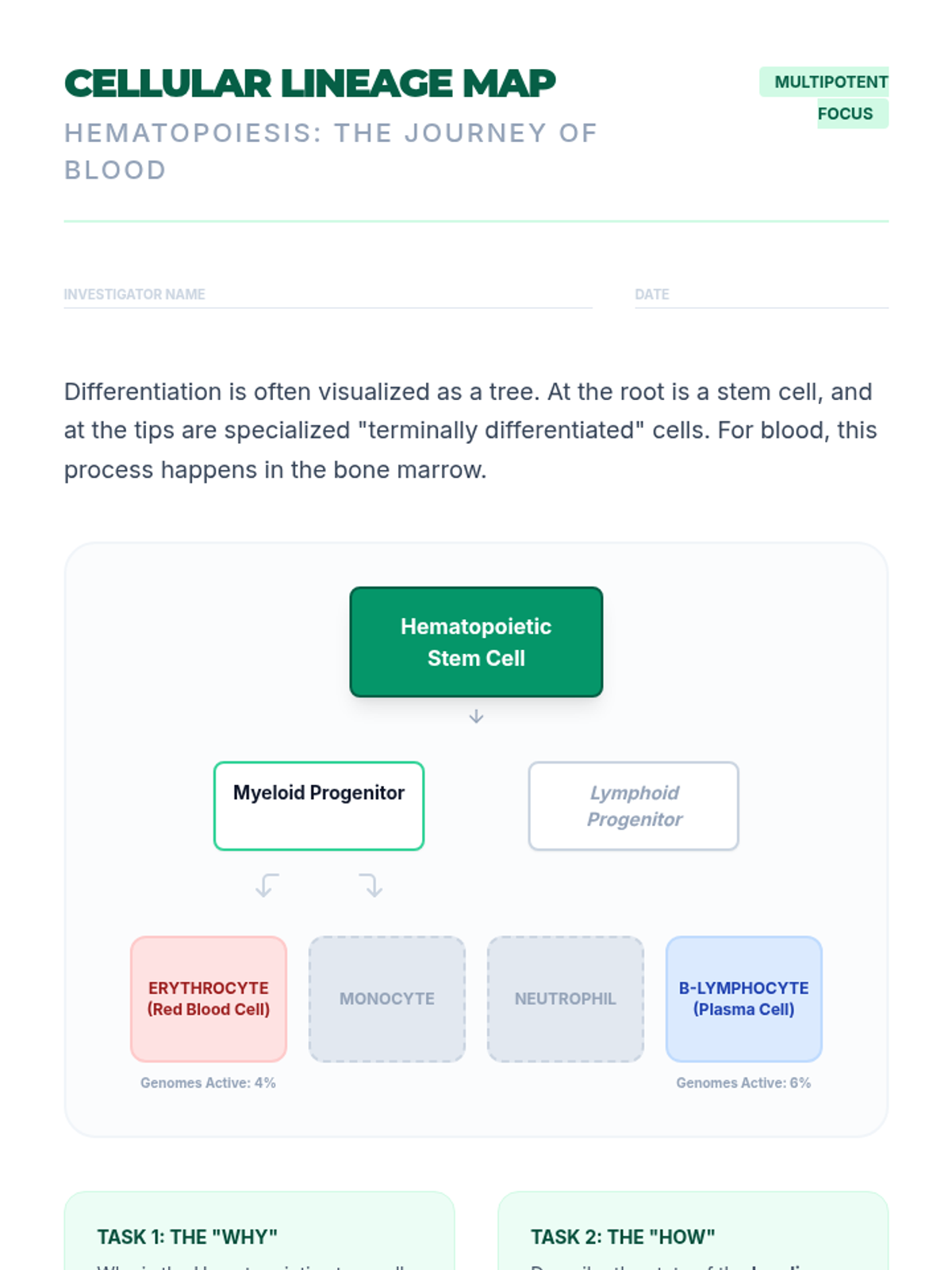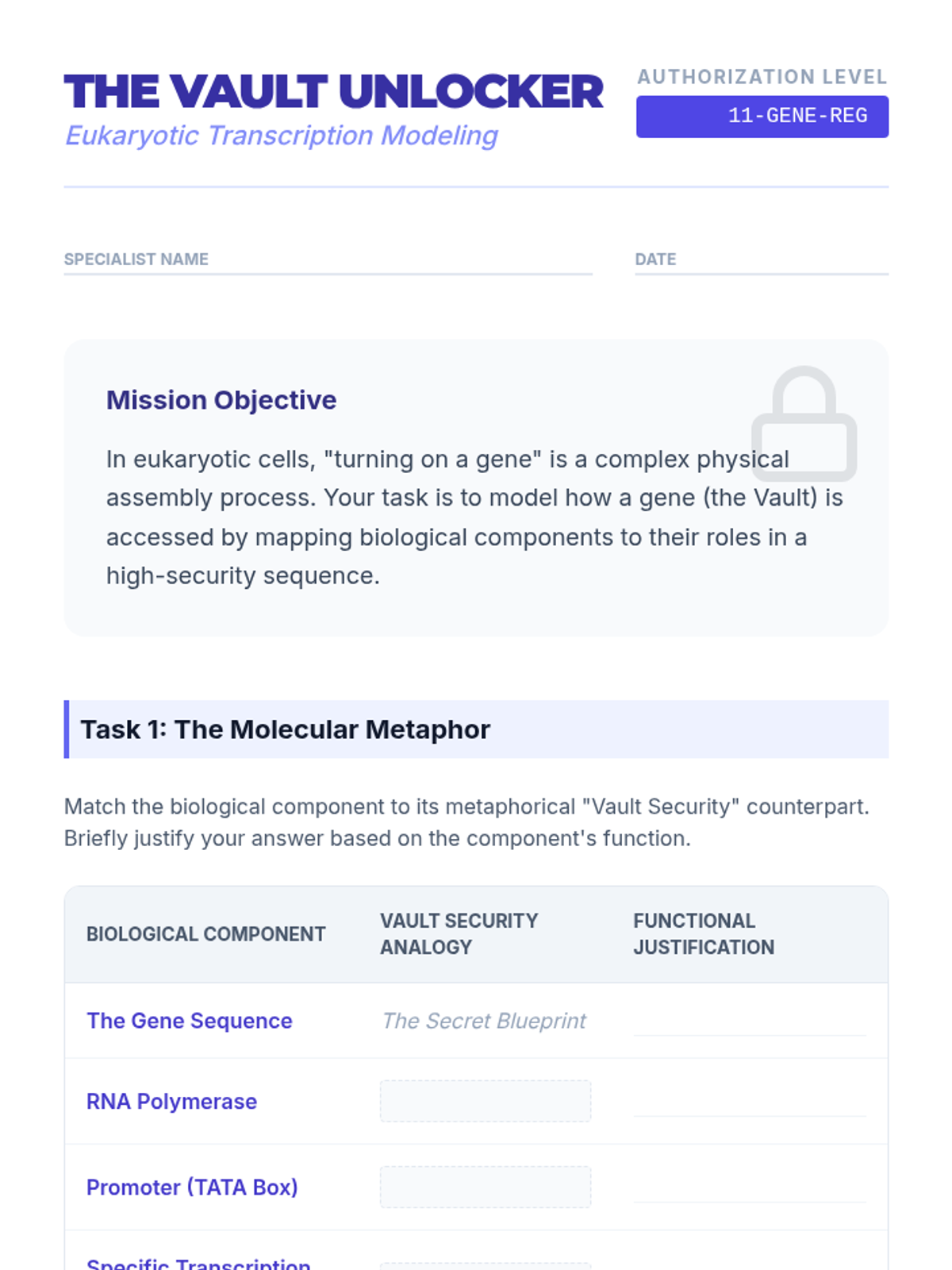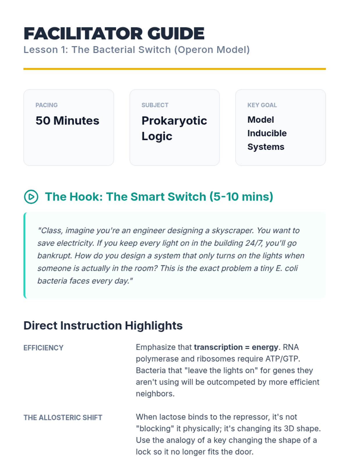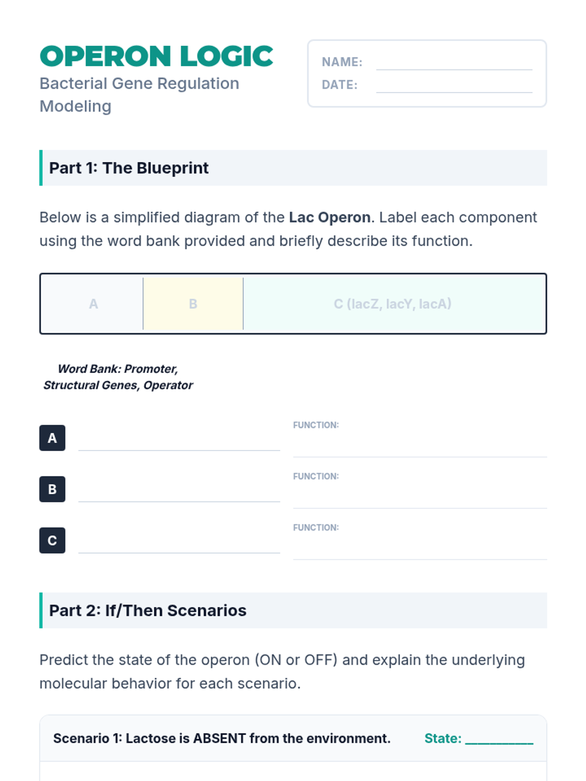 This 5-lesson sequence for 11th-grade biology explores the mechanisms of gene regulation and cellular differentiation. Students progress from simple prokaryotic operon models to complex eukaryotic control, epigenetics, and environmental influences, ultimately answering how cells with identical DNA develop unique identities.