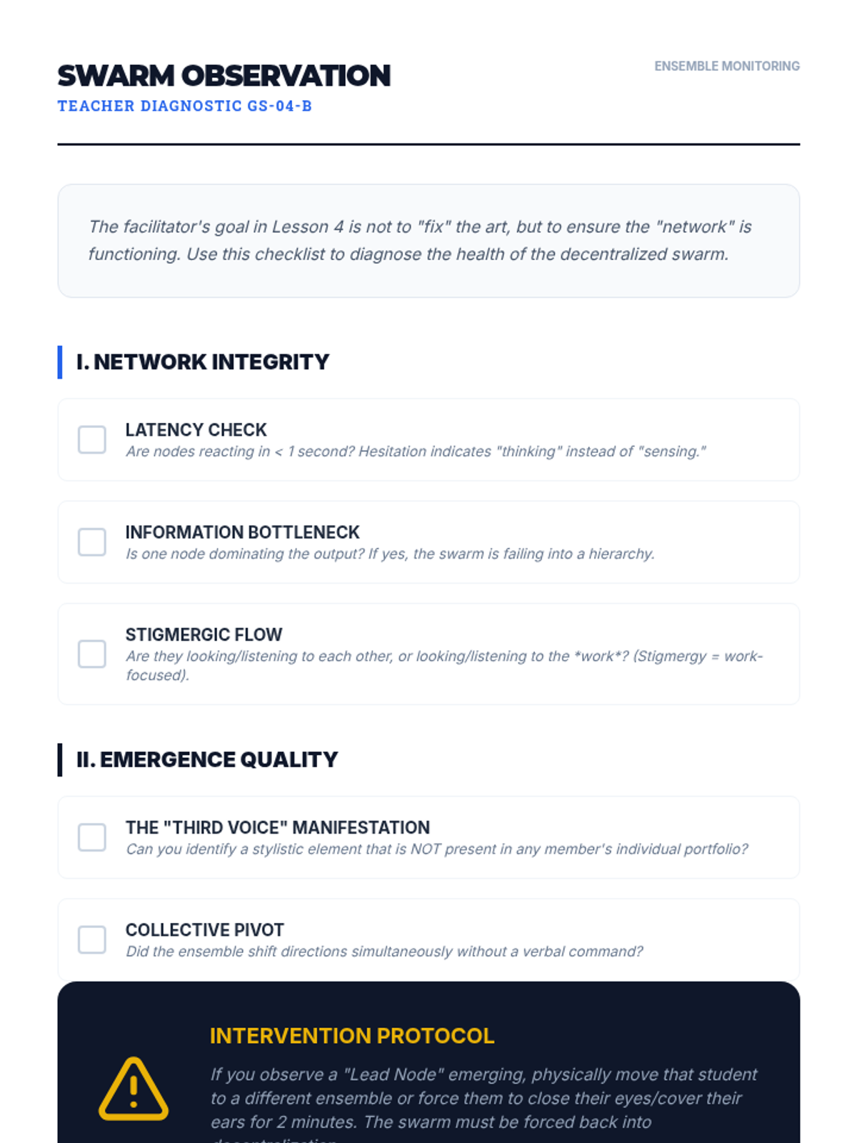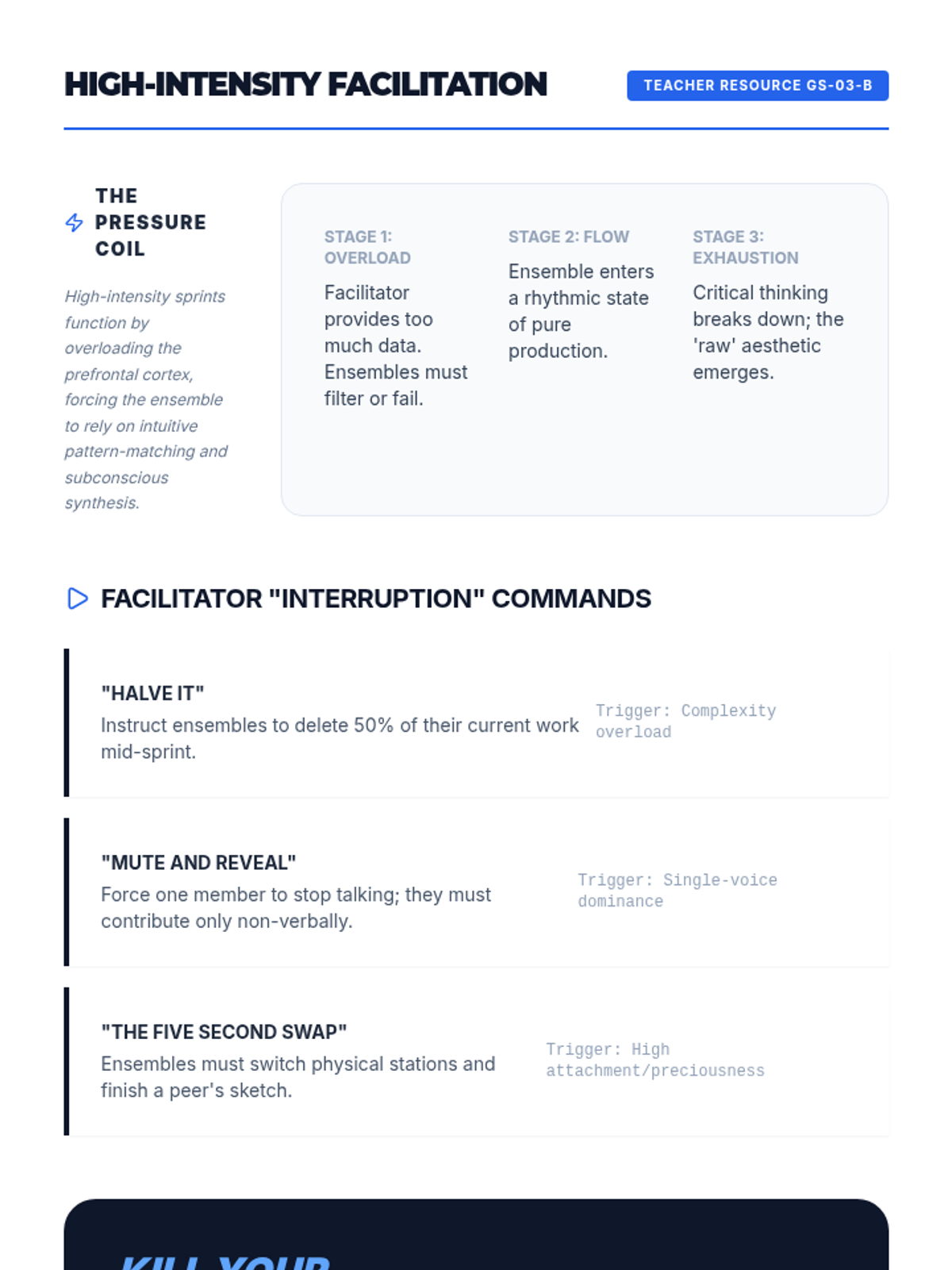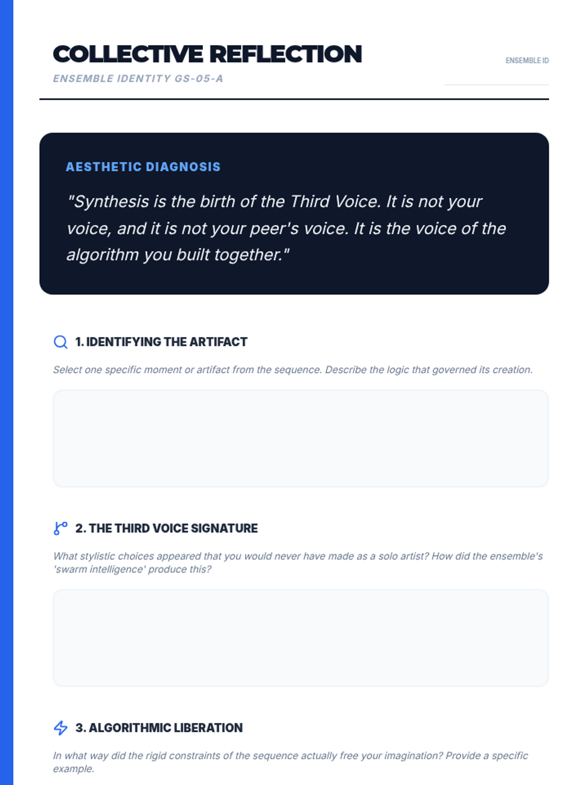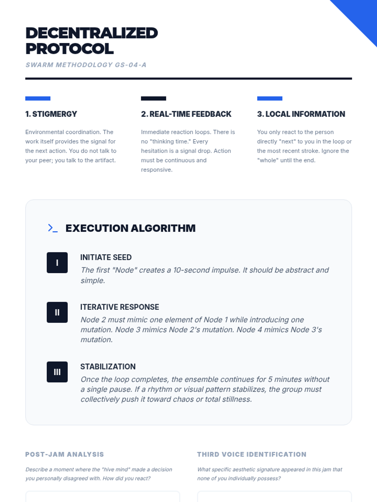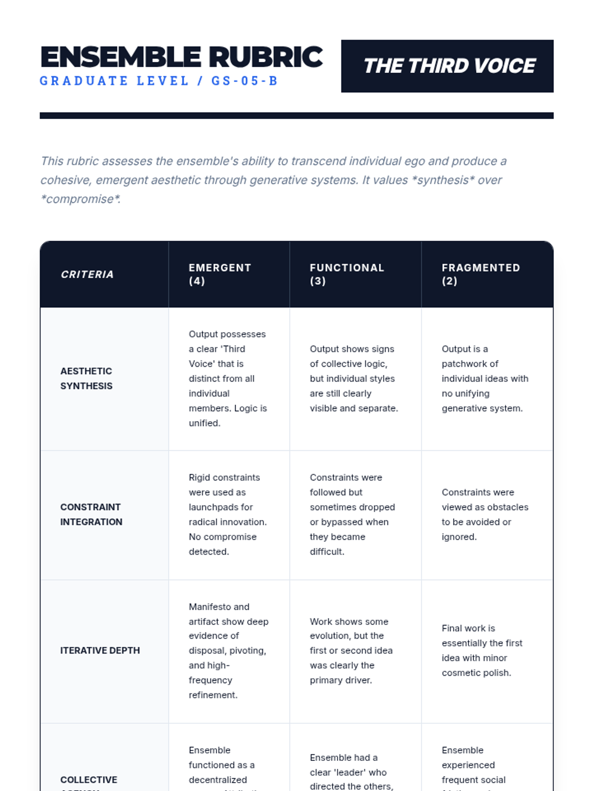 An advanced graduate-level exploration of collective invention in the arts. This sequence moves from the social foundations of psychological safety to algorithmic constraint-based ideation and swarm intelligence, culminating in the identification of a 'third voice'—the unique aesthetic signature of an ensemble.