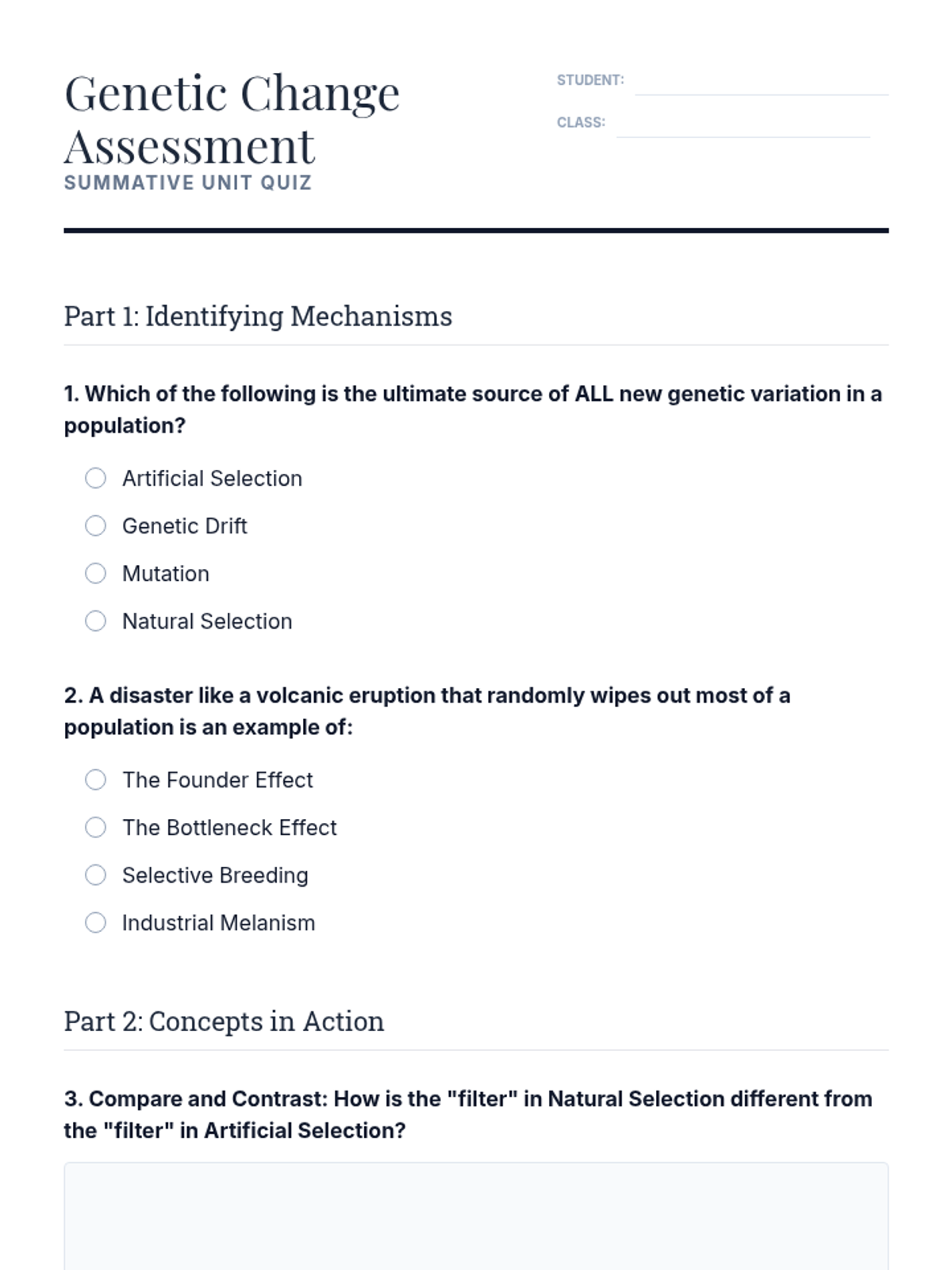 A comprehensive 7th-grade biology sequence exploring the diverse mechanisms of evolution. Students move beyond simple natural selection to investigate mutations, genetic drift, artificial selection, and real-world case studies like antibiotic resistance and the Peppered Moth.