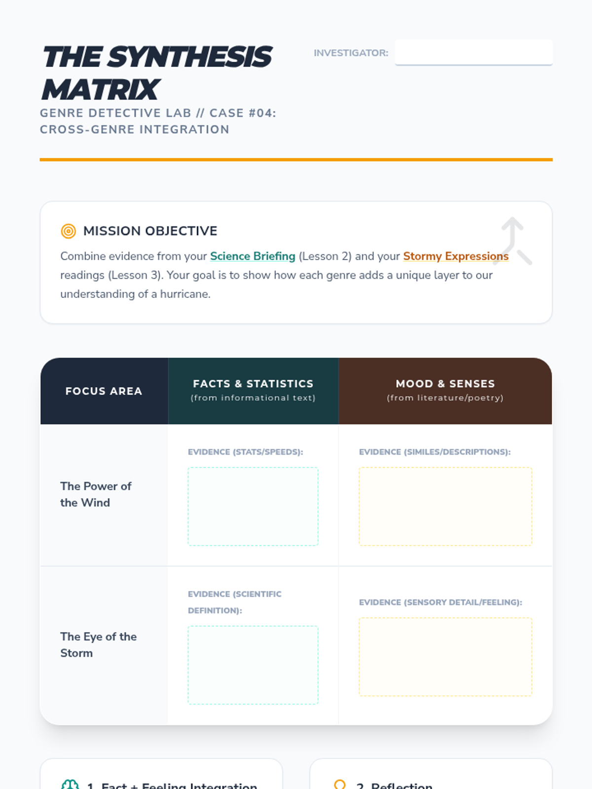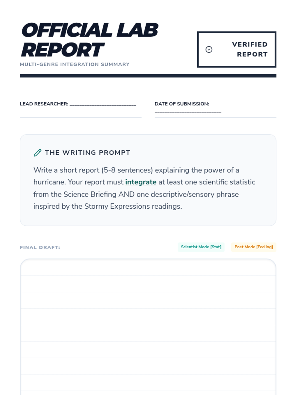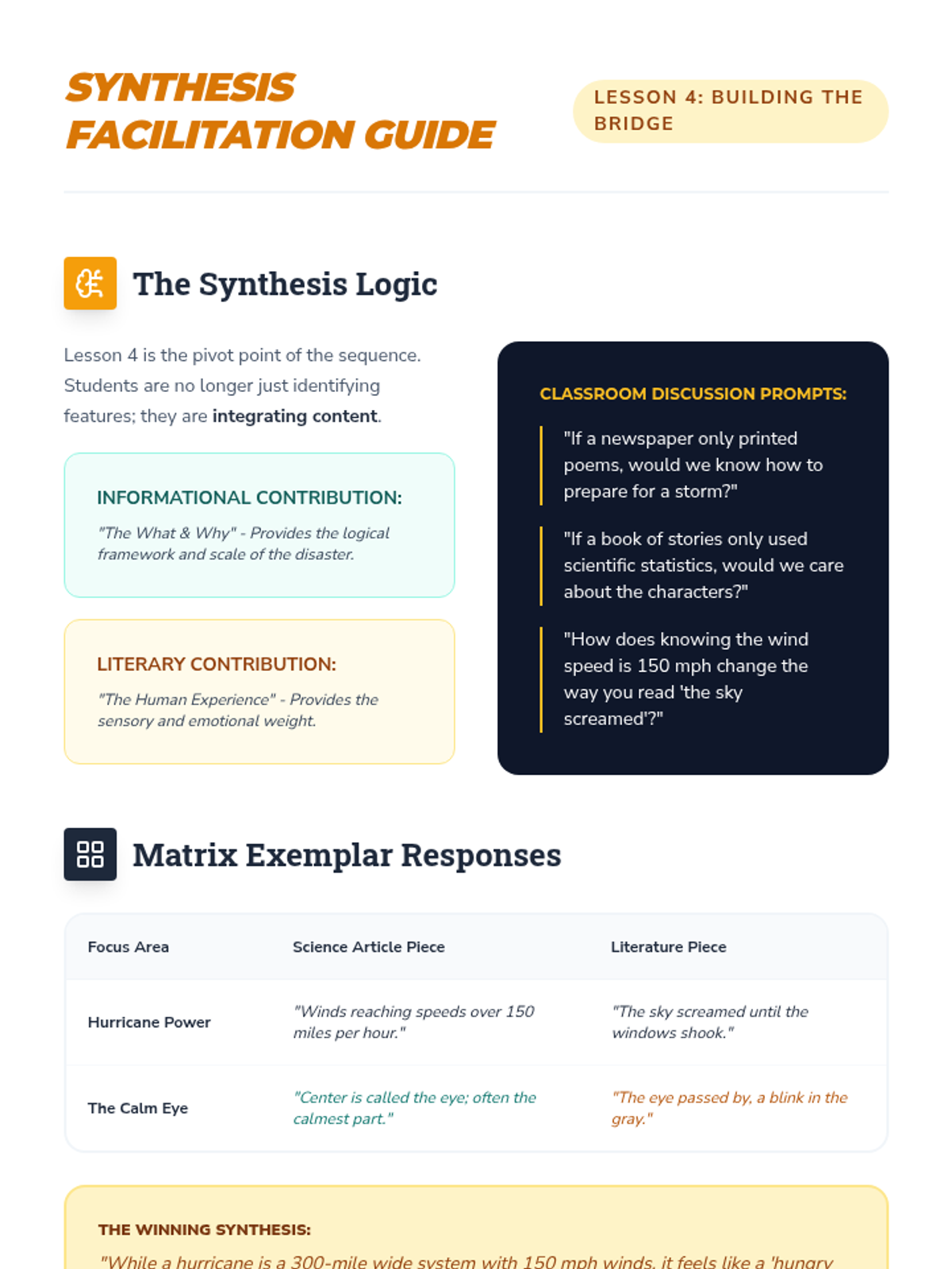 Students explore the structural differences between informational texts and literature through the topic of hurricanes. They move from identifying text features to synthesizing facts and emotions across genres to create an integrated report.