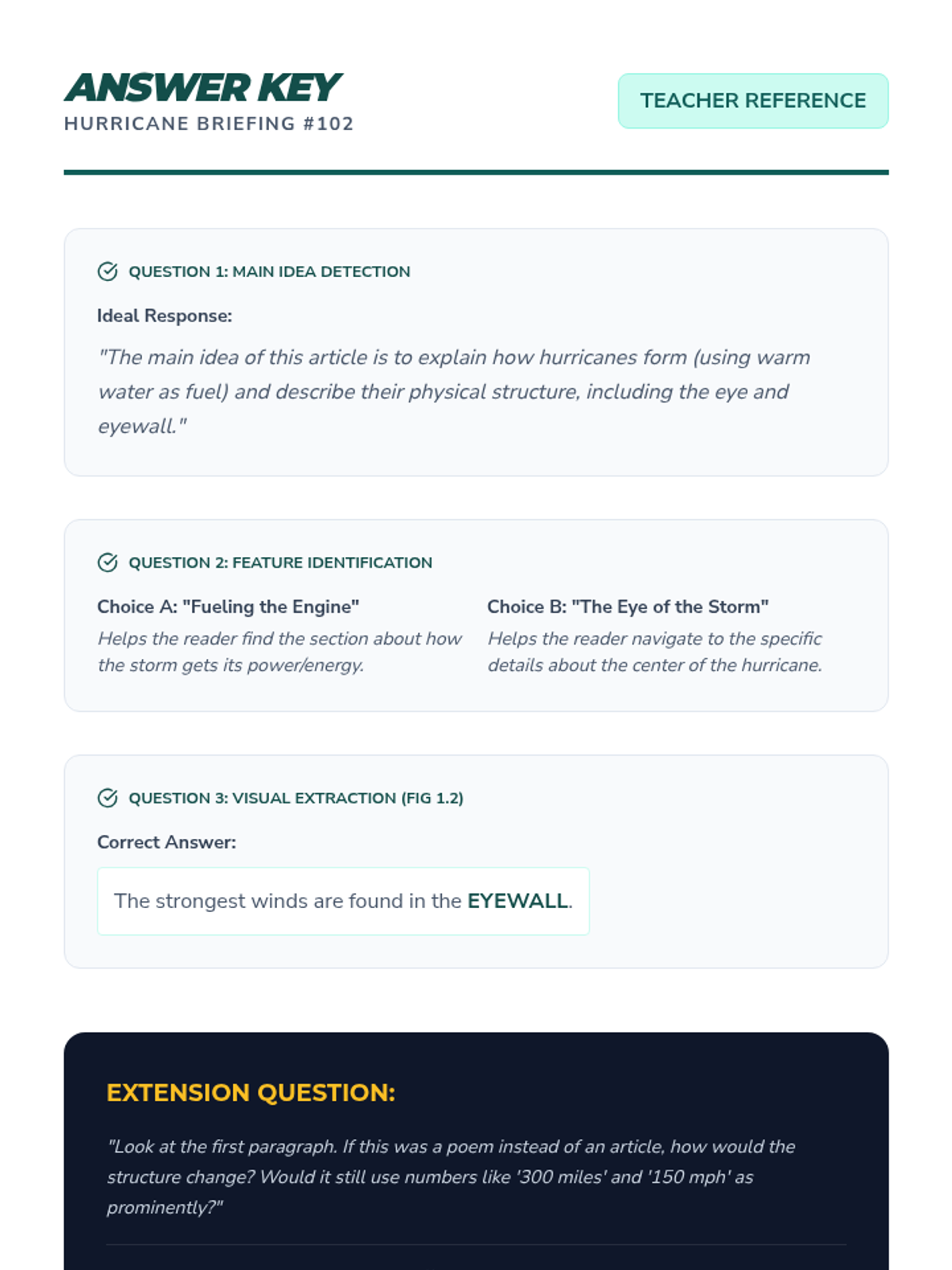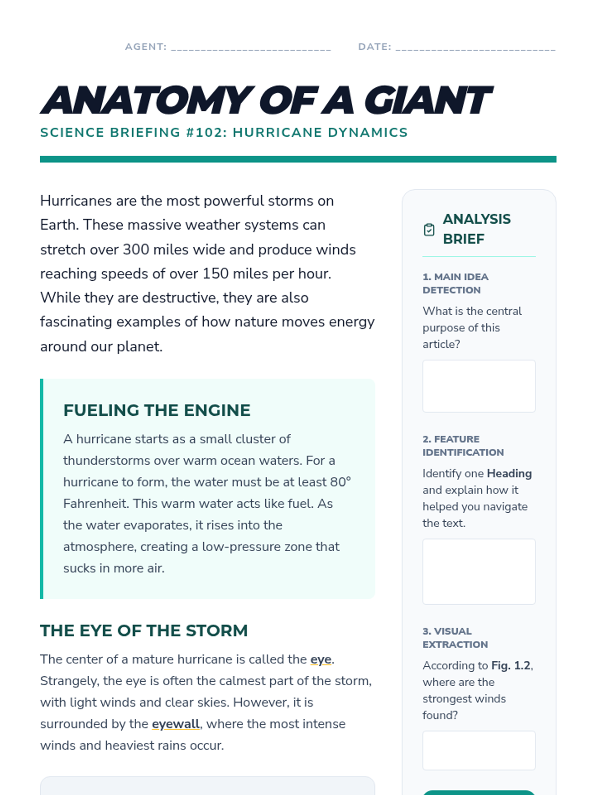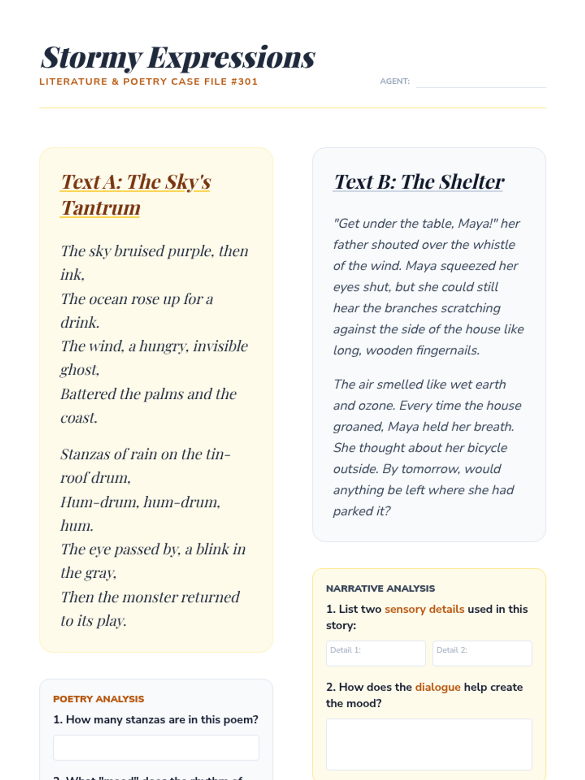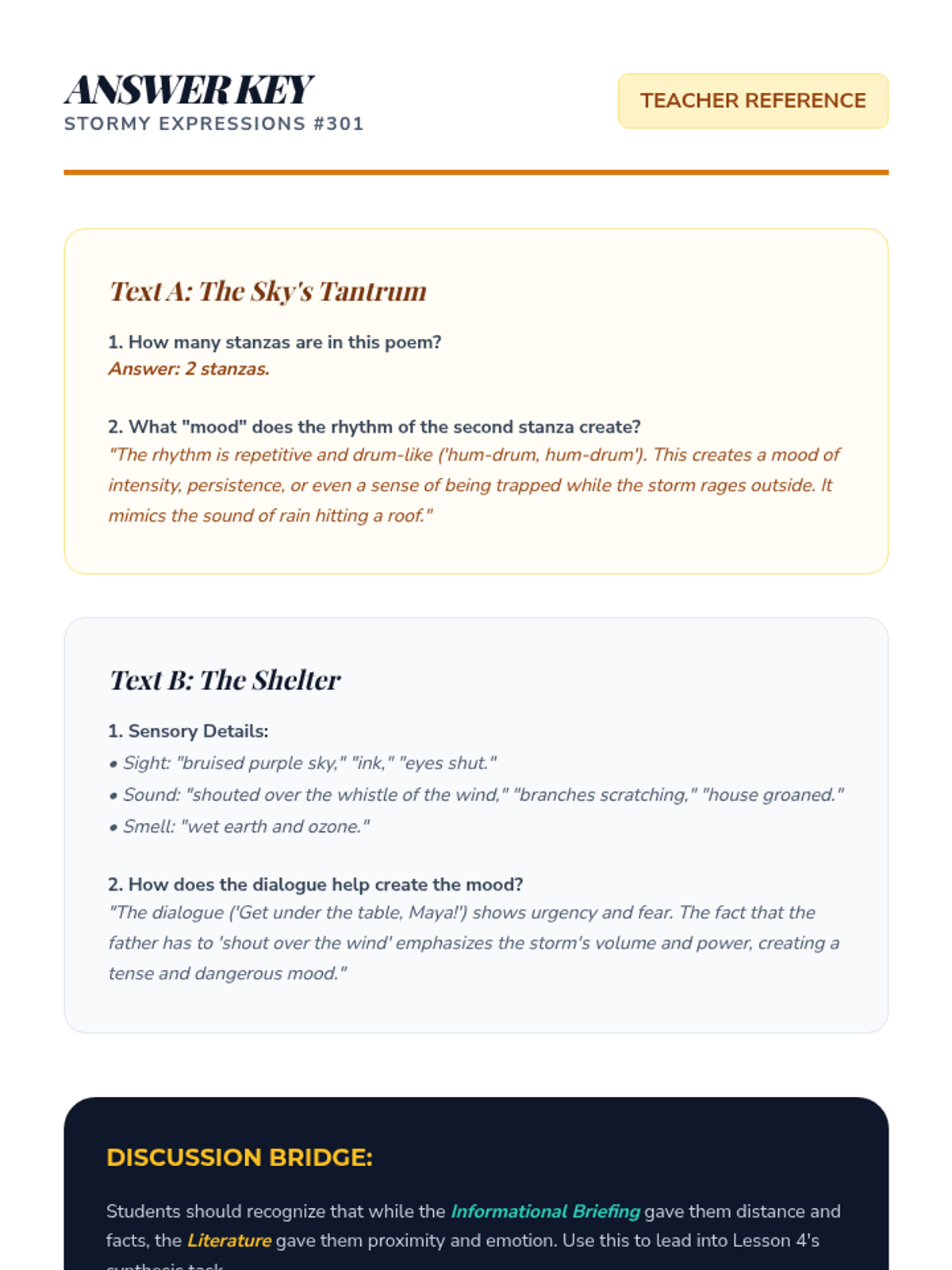 Students explore the structural differences between informational texts and literature through the topic of hurricanes. They move from identifying text features to synthesizing facts and emotions across genres to create an integrated report.