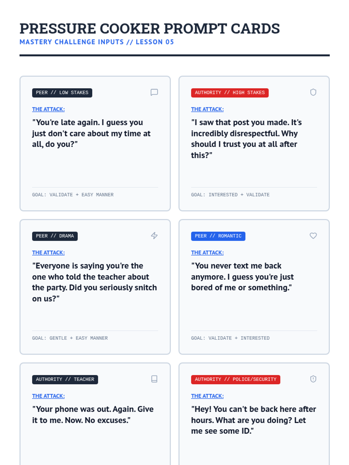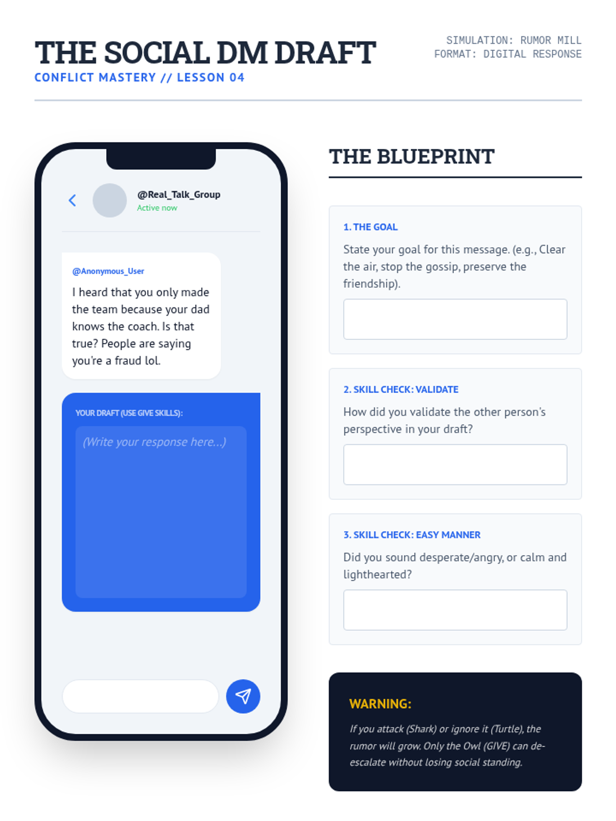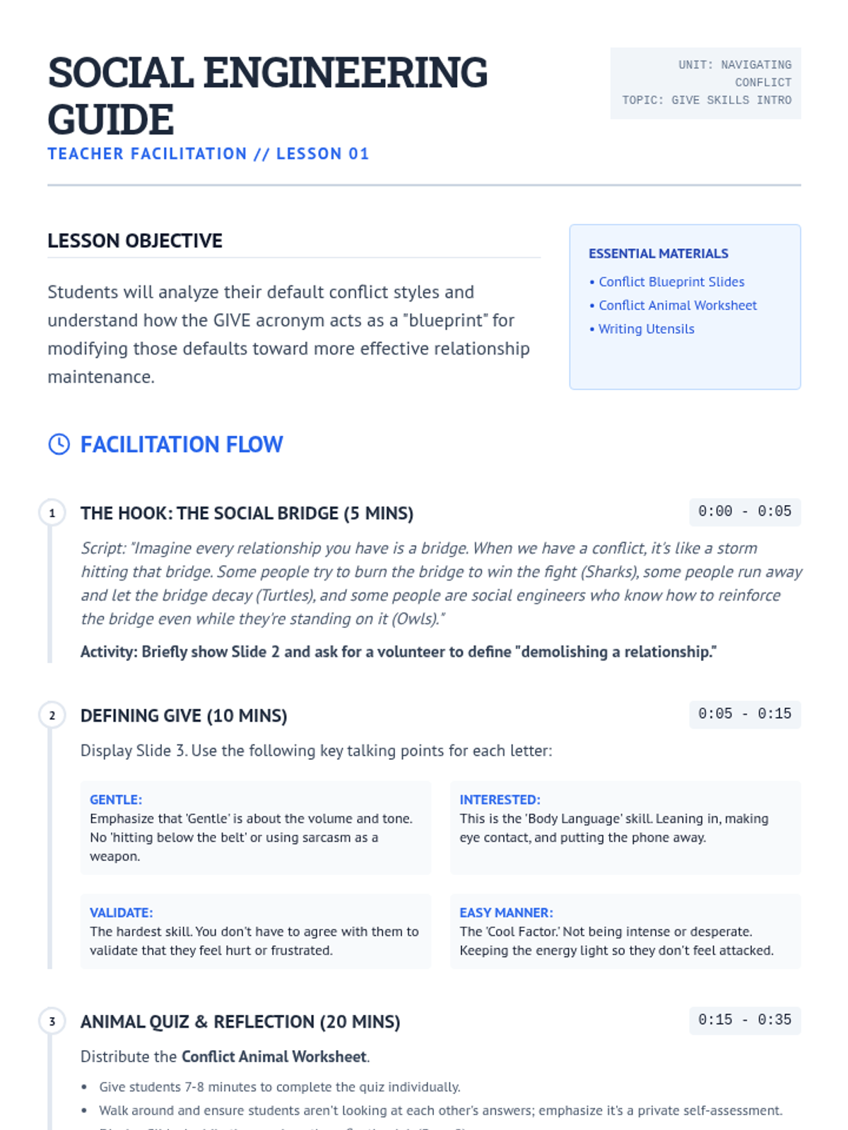 A 5-lesson unit for 9th graders focused on DBT 'GIVE' skills. Students move through increasingly difficult simulations to build muscle memory for maintaining relationships during high-pressure conflicts.