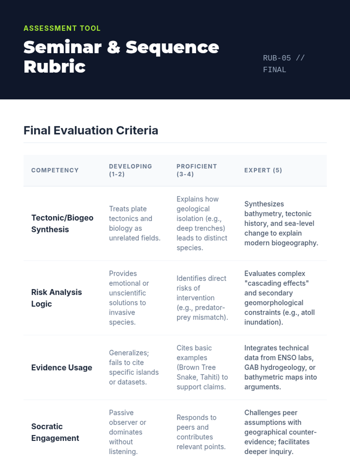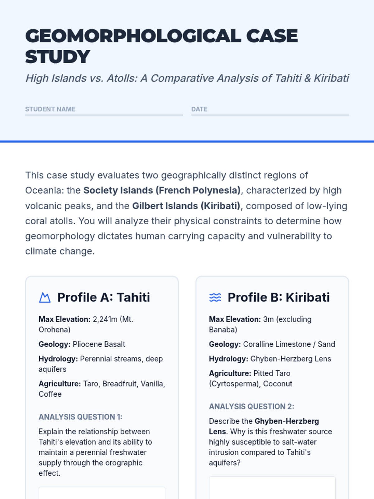 An advanced physical geography sequence for undergraduate students exploring the tectonic, geomorphological, and climatic systems of Oceania. The course covers plate tectonics, island lifecycles, Australian continental stability, the ENSO cycle, and biogeographic isolation.