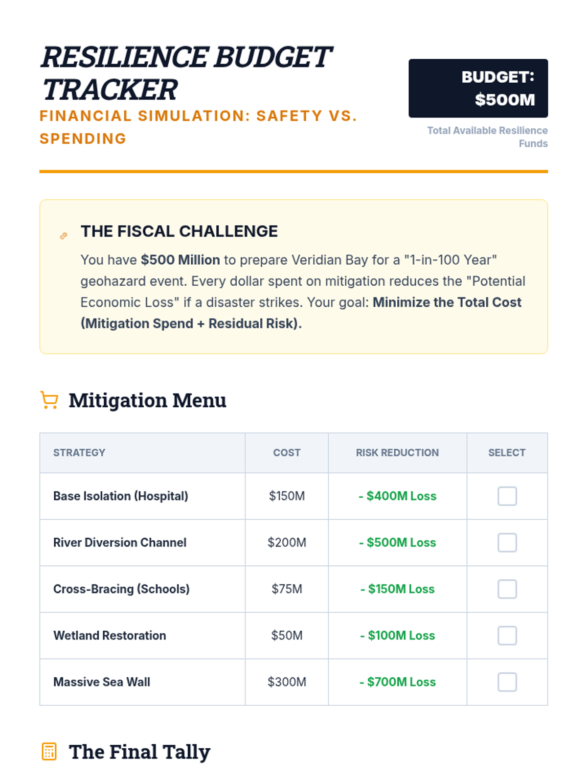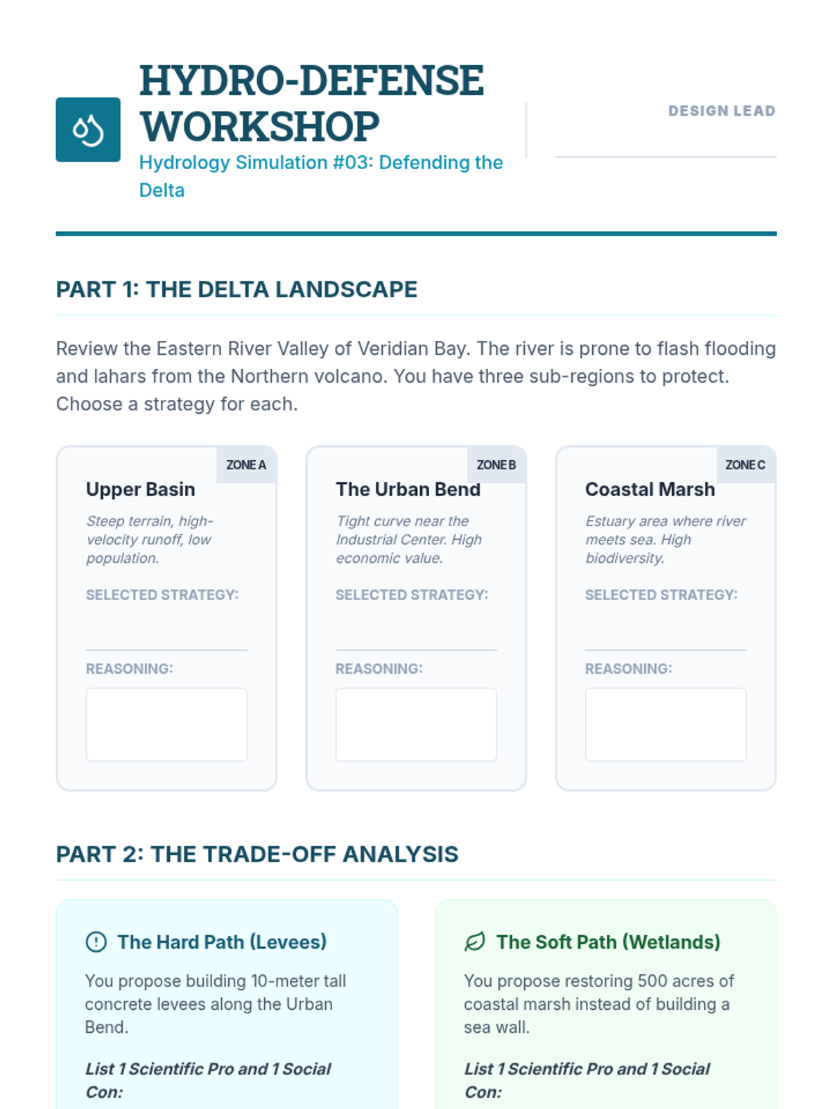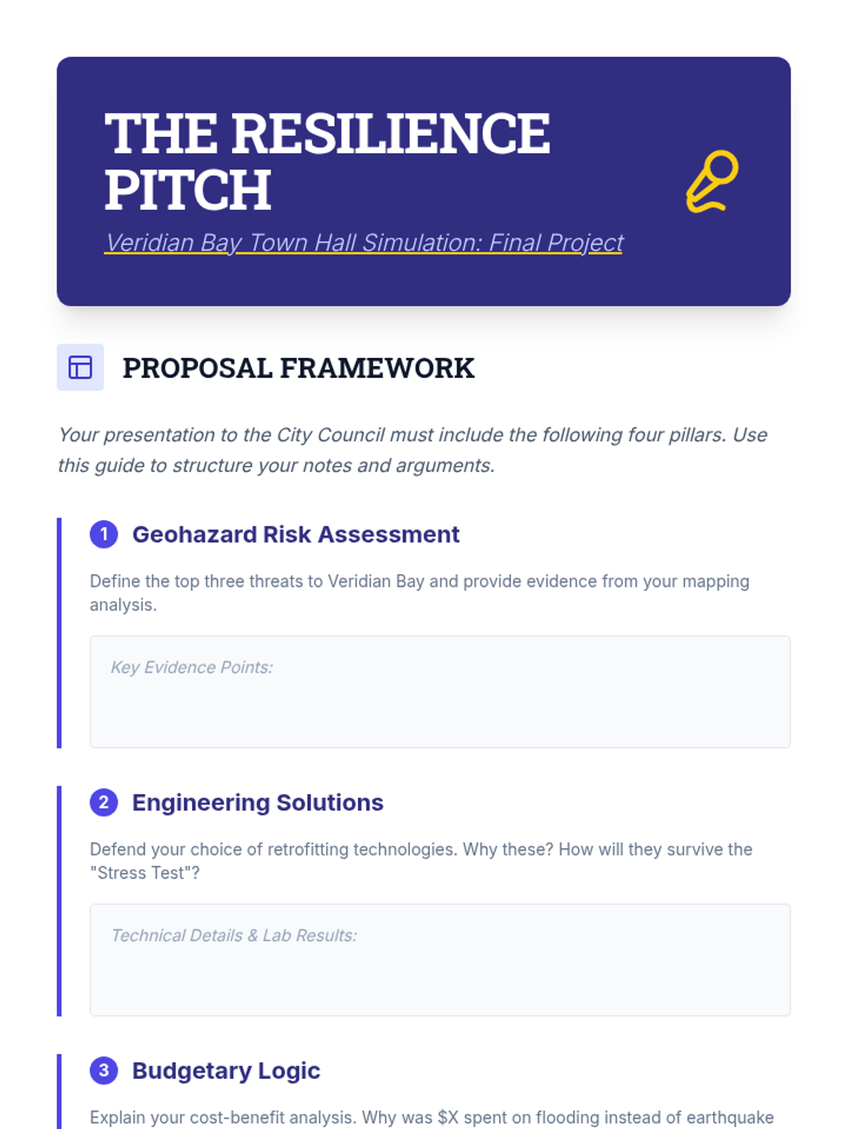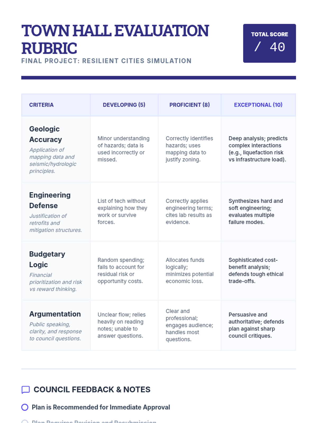 Students act as city planners, using geologic data to assess risks and design mitigation strategies for a fictional region. The unit covers zoning, building codes, and emergency response, culminating in a town hall simulation where students defend their resilience plans.