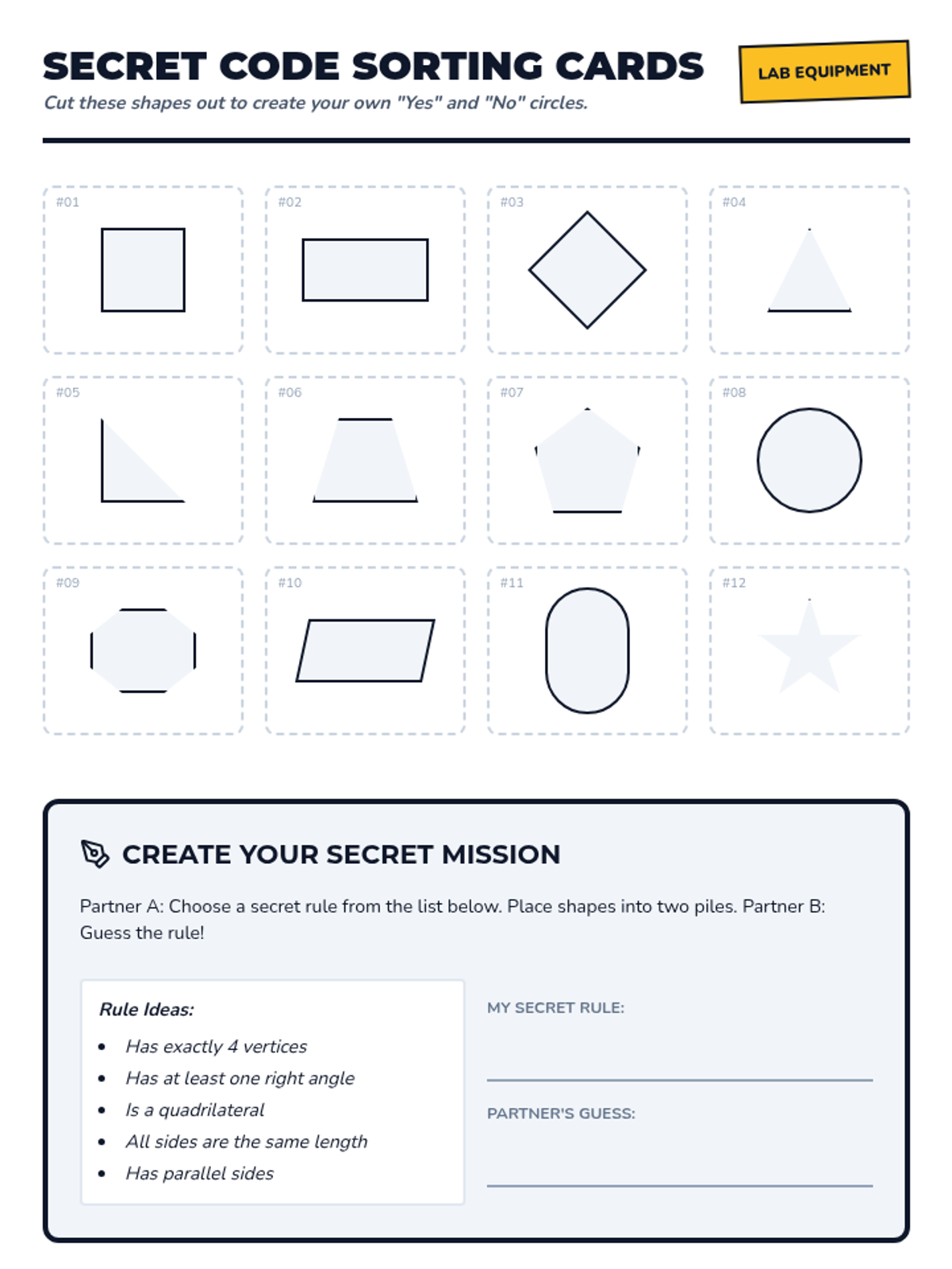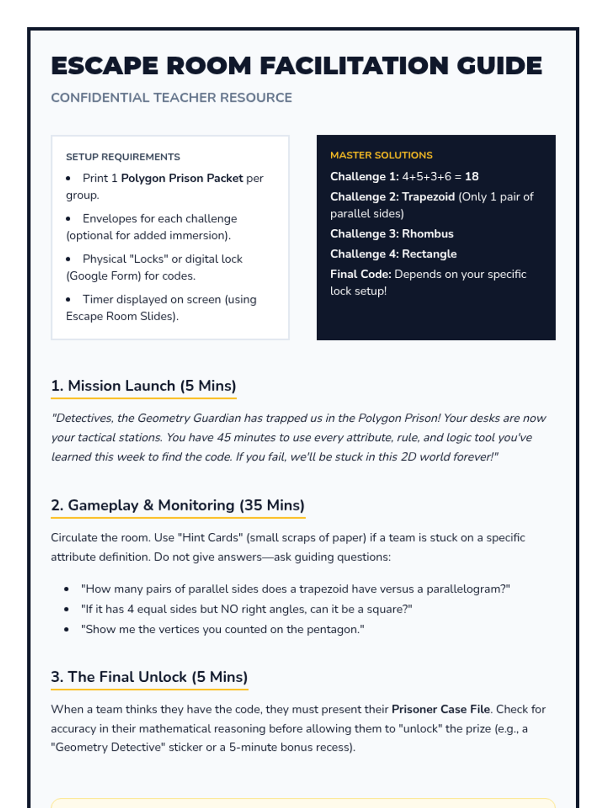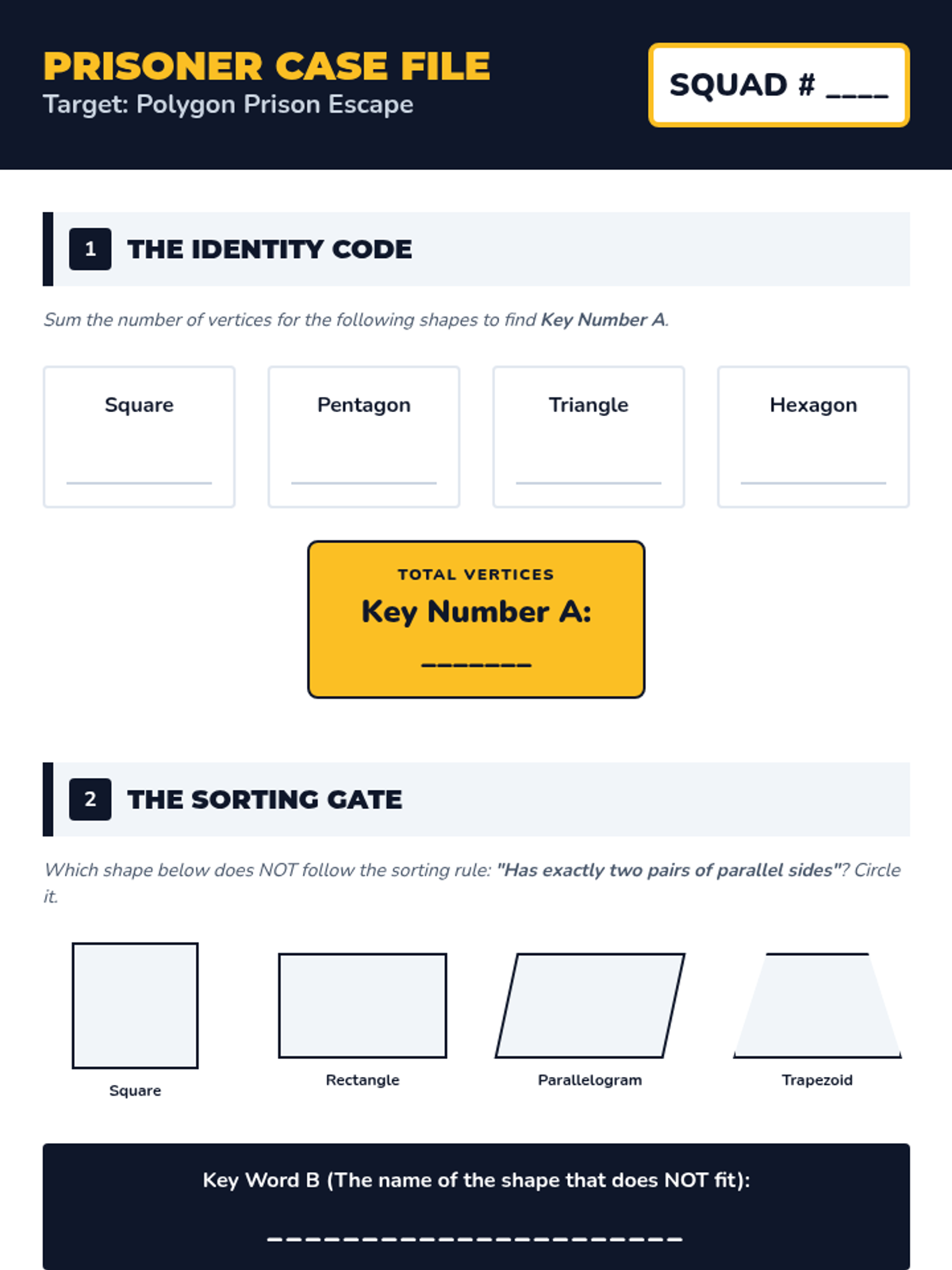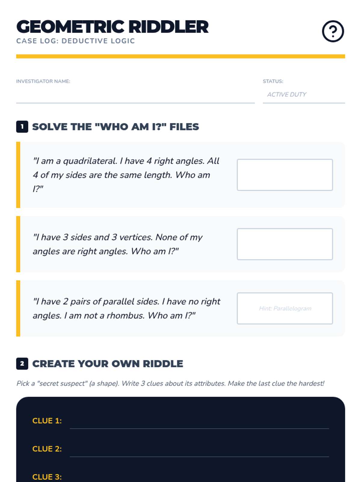 A gamified geometry unit for 3rd graders focused on identifying and classifying shapes based on attributes like sides, angles, and vertices. Students act as 'Geometry Detectives' solving mysteries, riddles, and logic puzzles.