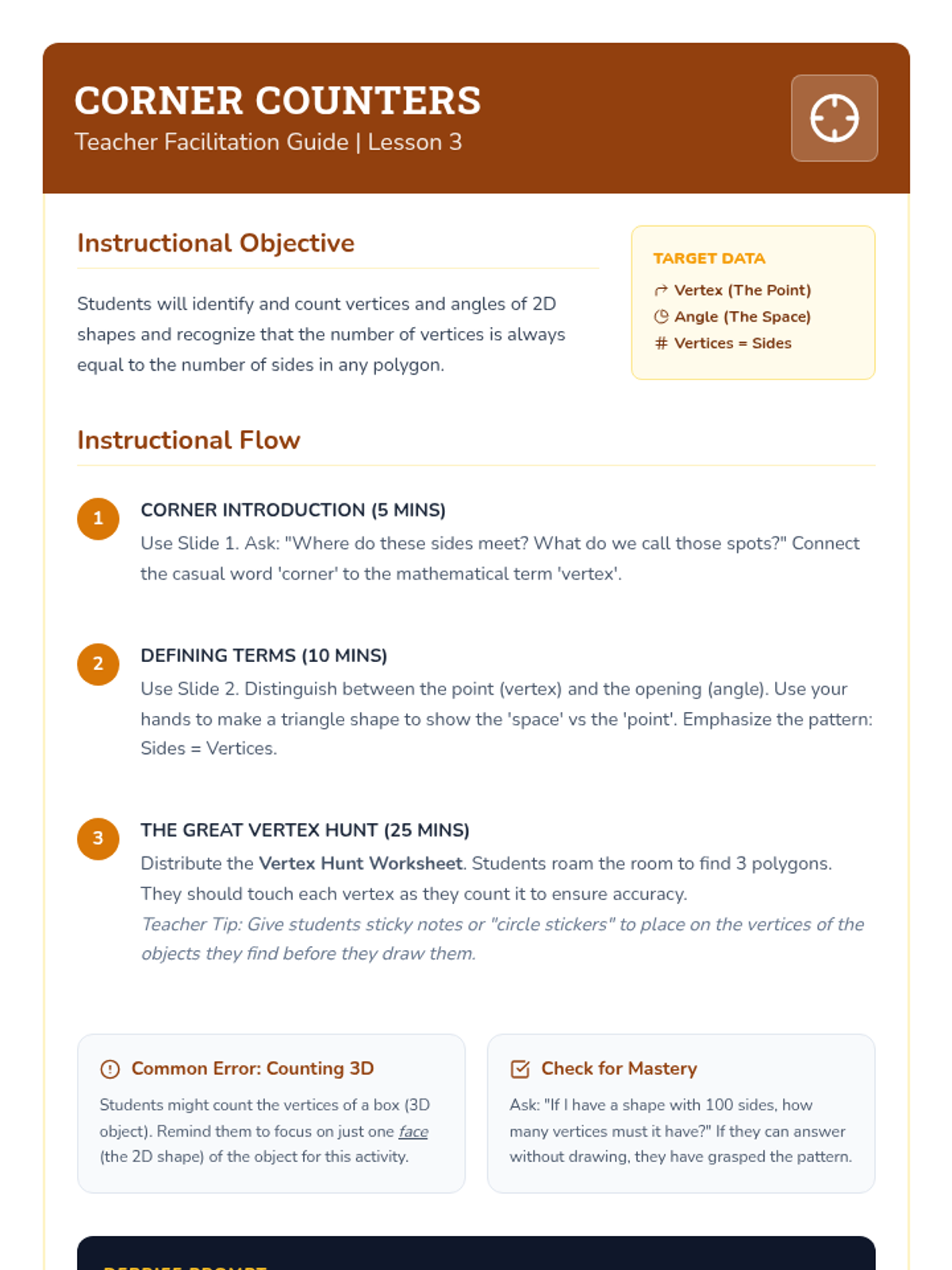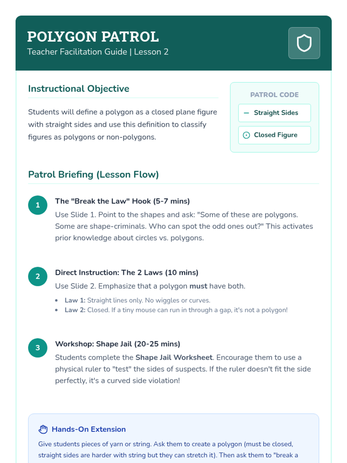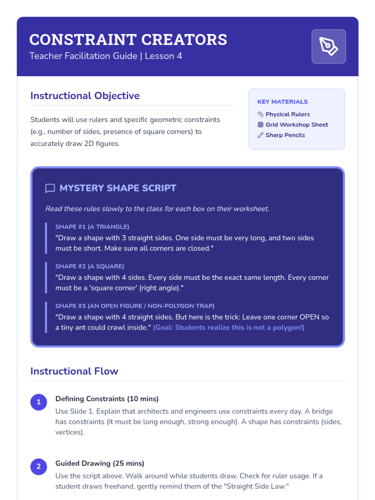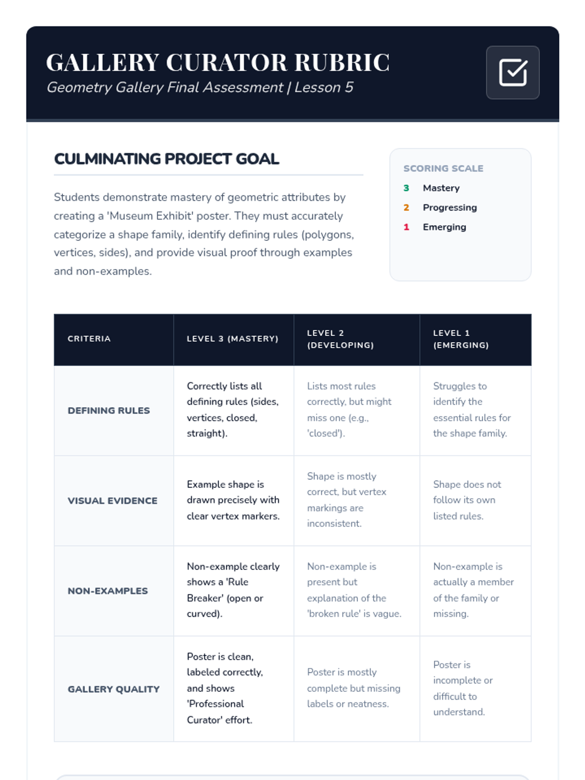 This 3rd-grade sequence guides students from recognizing basic shapes to analyzing their defining attributes, such as sides and vertices. Students explore polygons, distinguish between defining and non-defining attributes, and culminate their learning in a 'Geometry Gallery' project.