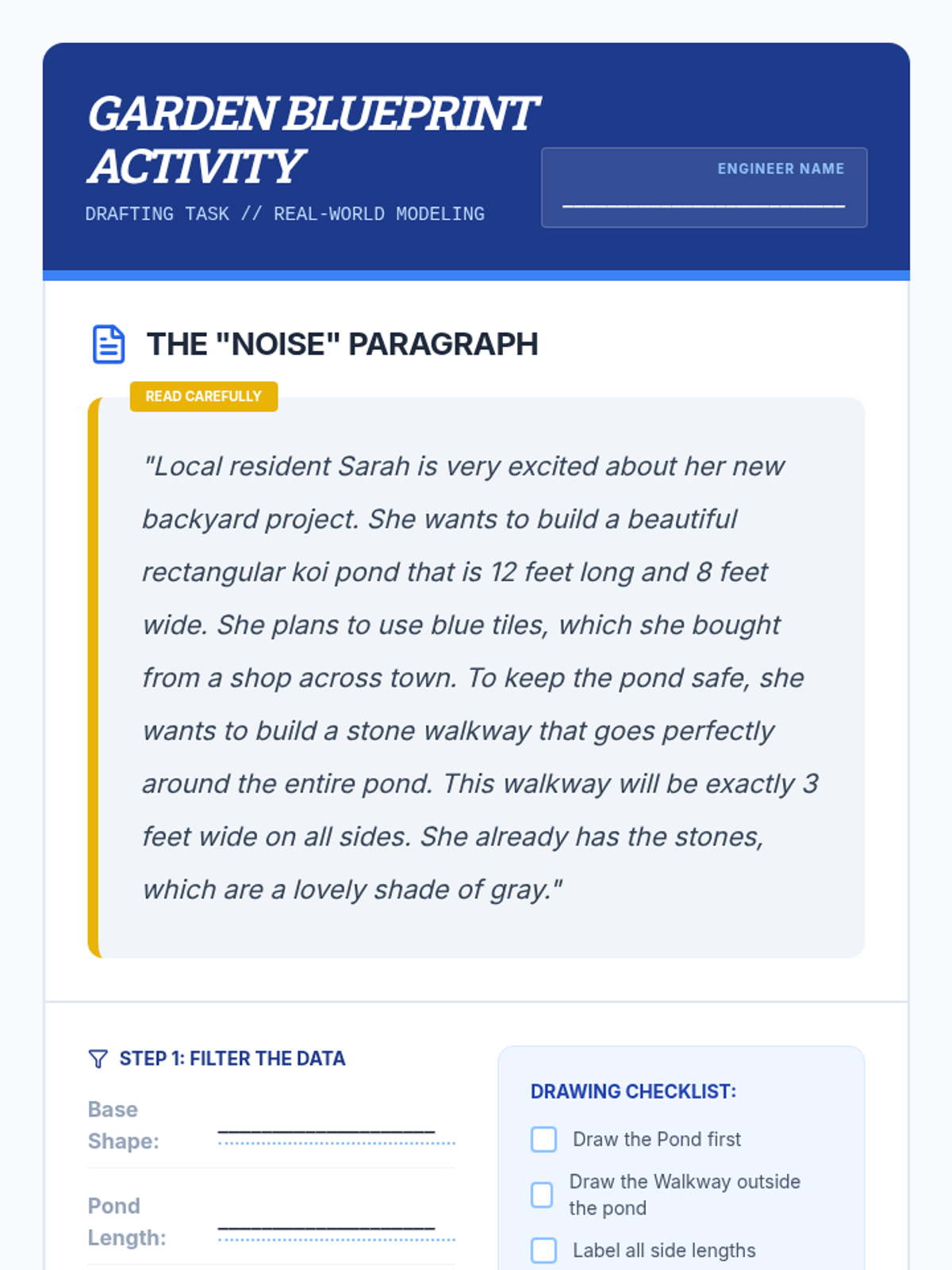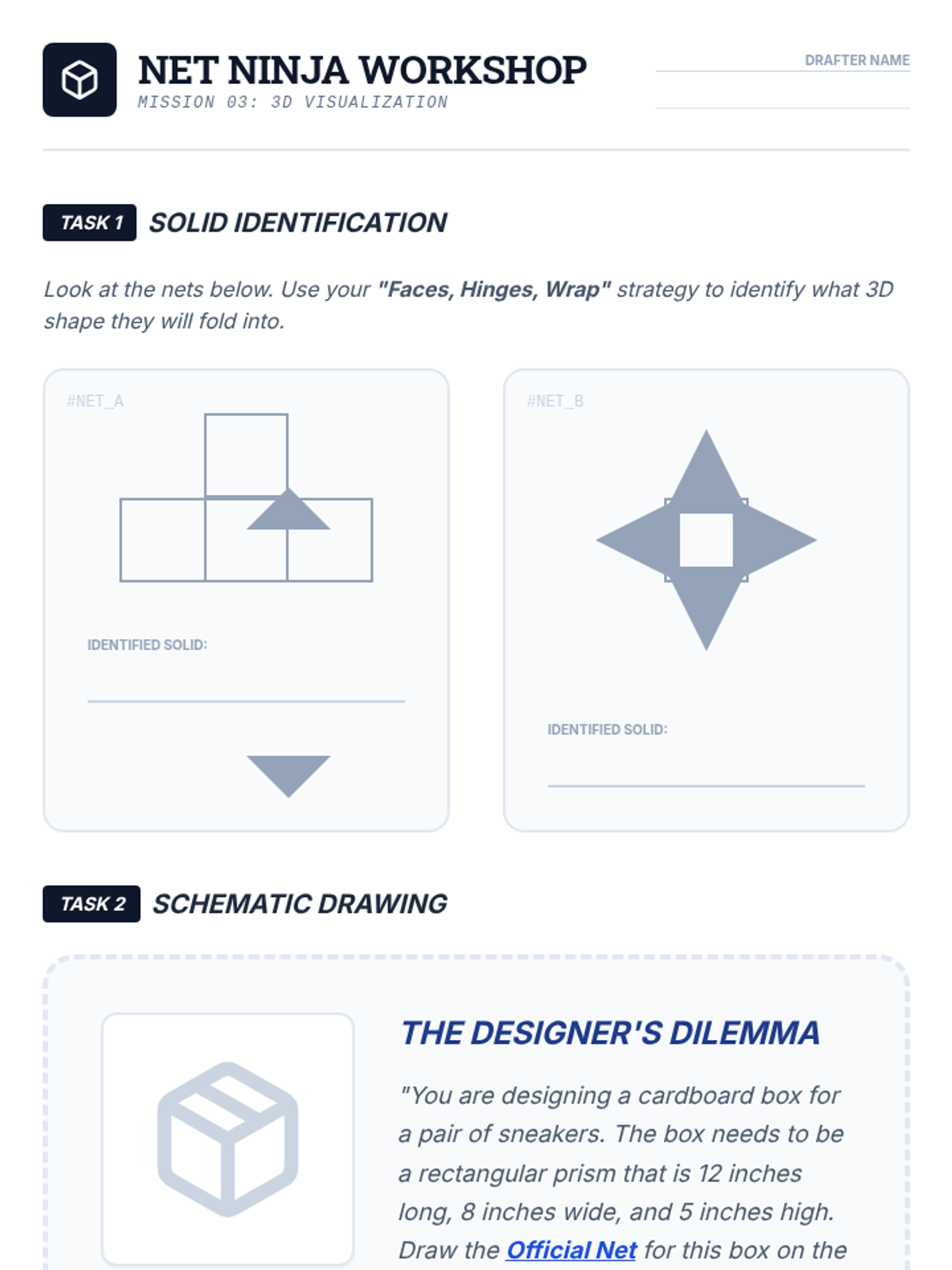 This sequence teaches 10th-grade students with academic support needs how to translate complex geometric text descriptions into accurate, solvable visual representations. It covers geometric vocabulary, 2D blueprints from word problems, 3D nets/transformations, and similarity modeling, culminating in a synthesis project.