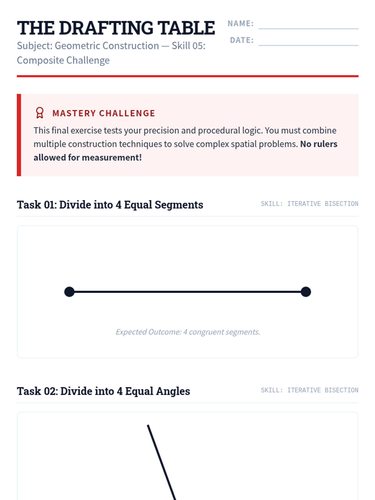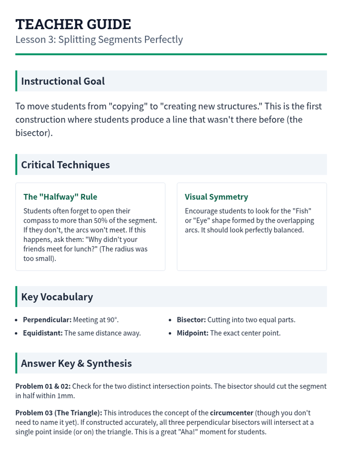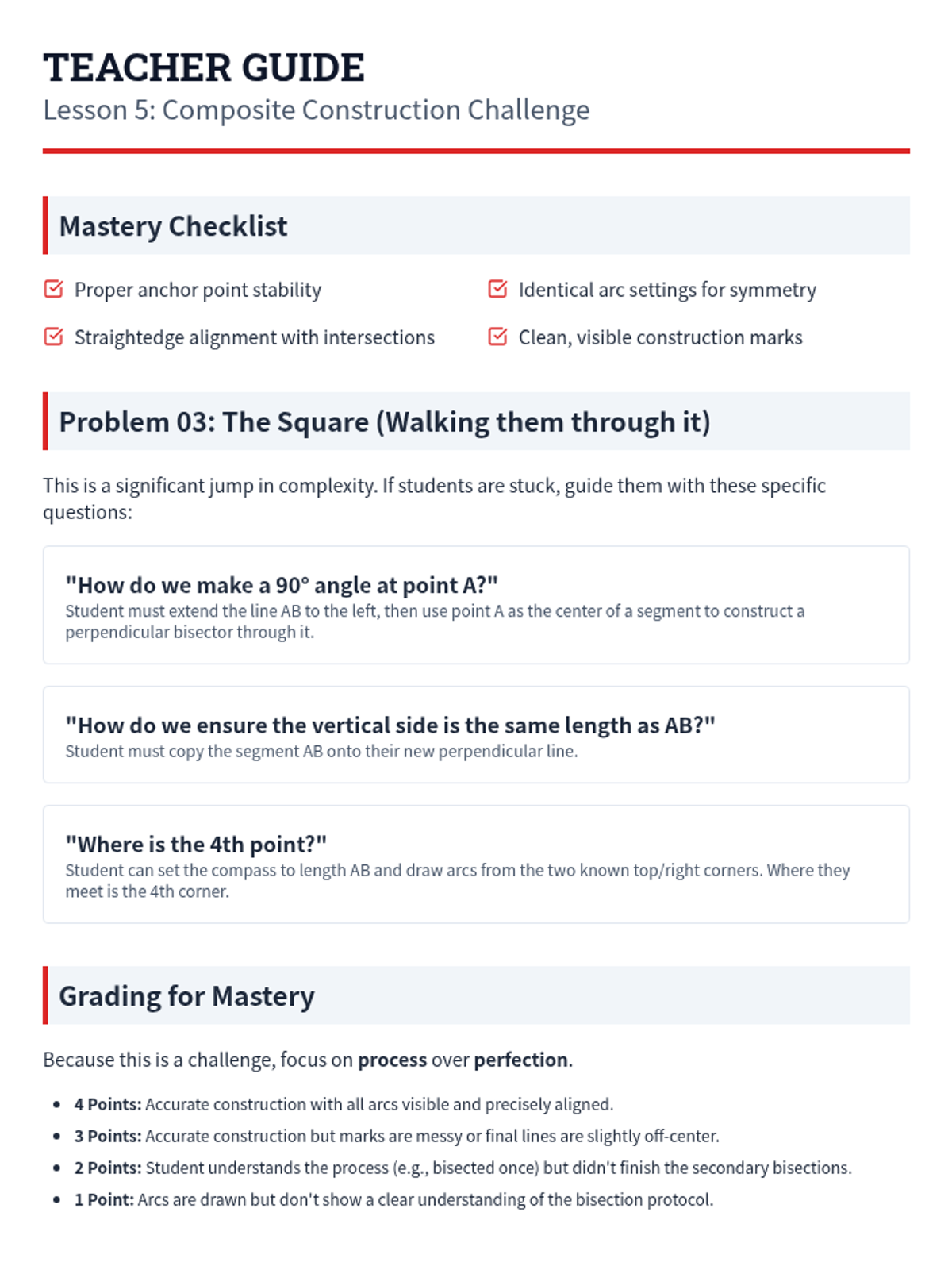 A foundational geometry sequence for 7th-grade students focusing on the art and logic of compass and straightedge constructions. Students master the skills of copying segments and angles, and constructing perpendicular and angle bisectors to solve geometric puzzles.