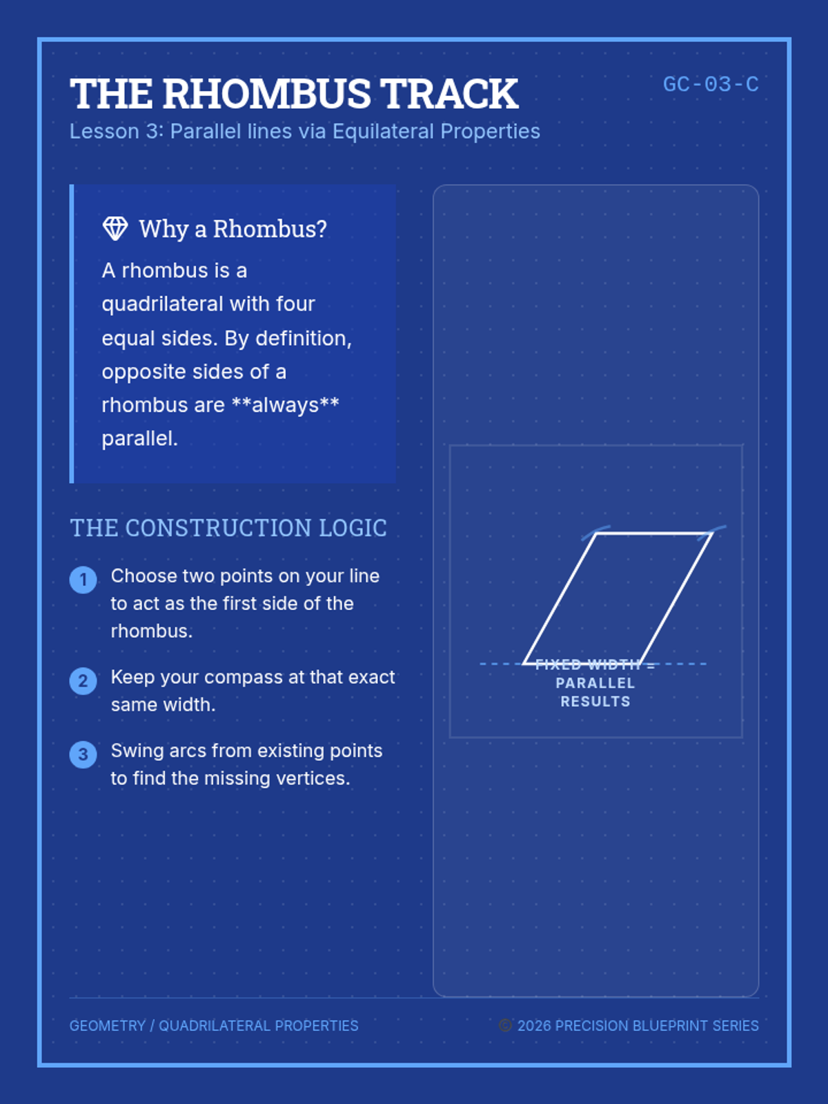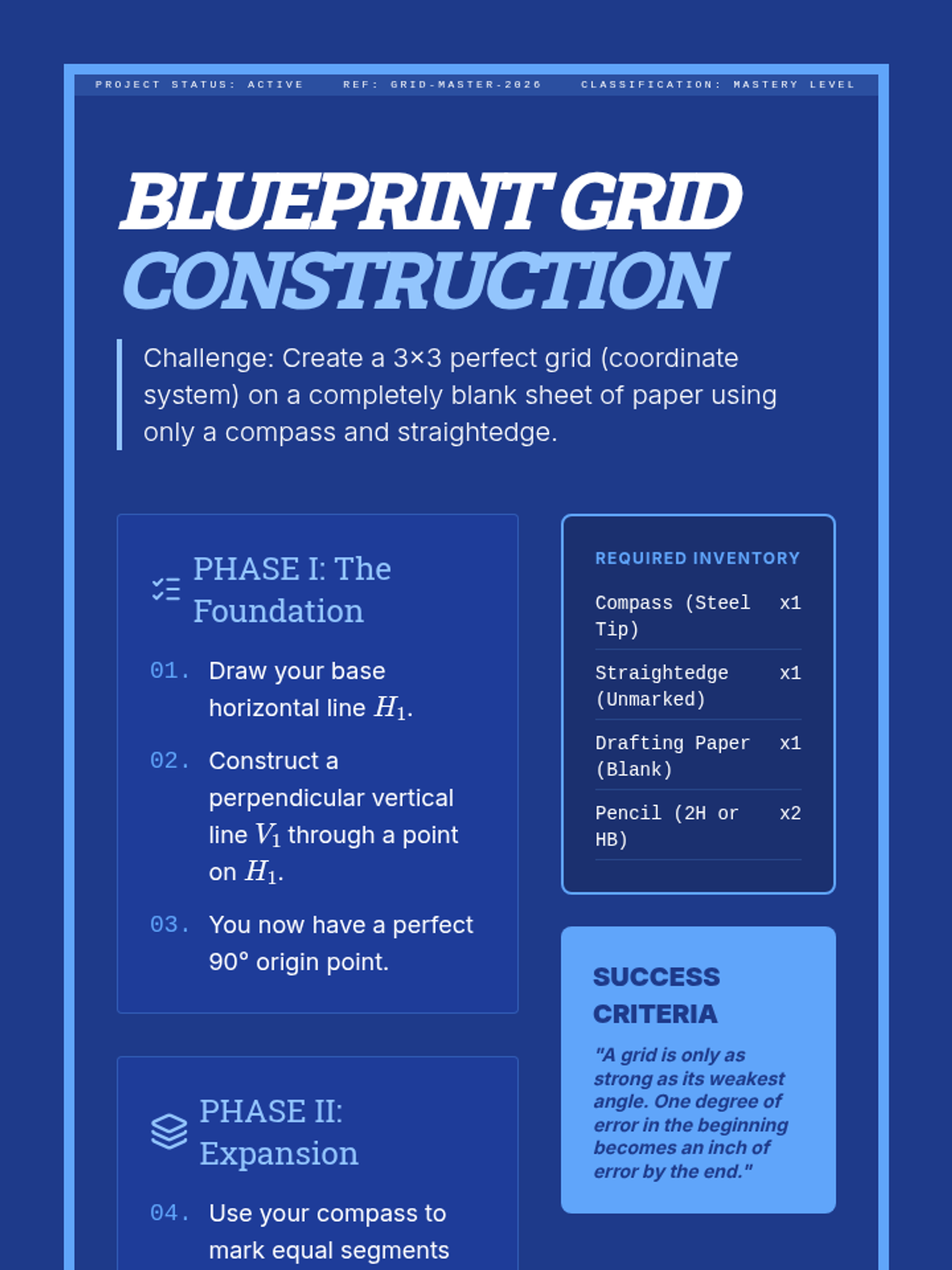 This geometry sequence guides 10th-grade students through the precision and logic of geometric constructions. Focusing on perpendicular and parallel relationships, students move from basic line interactions to complex grid systems using only a compass and straightedge.