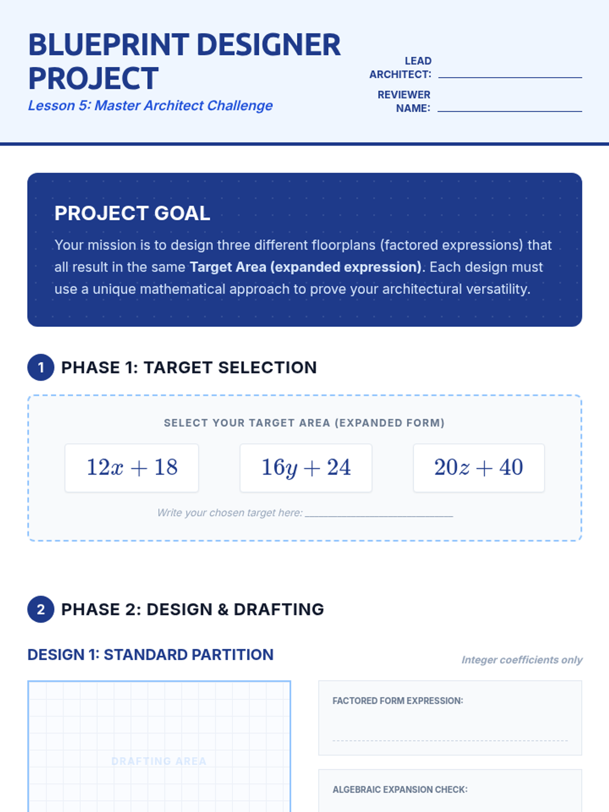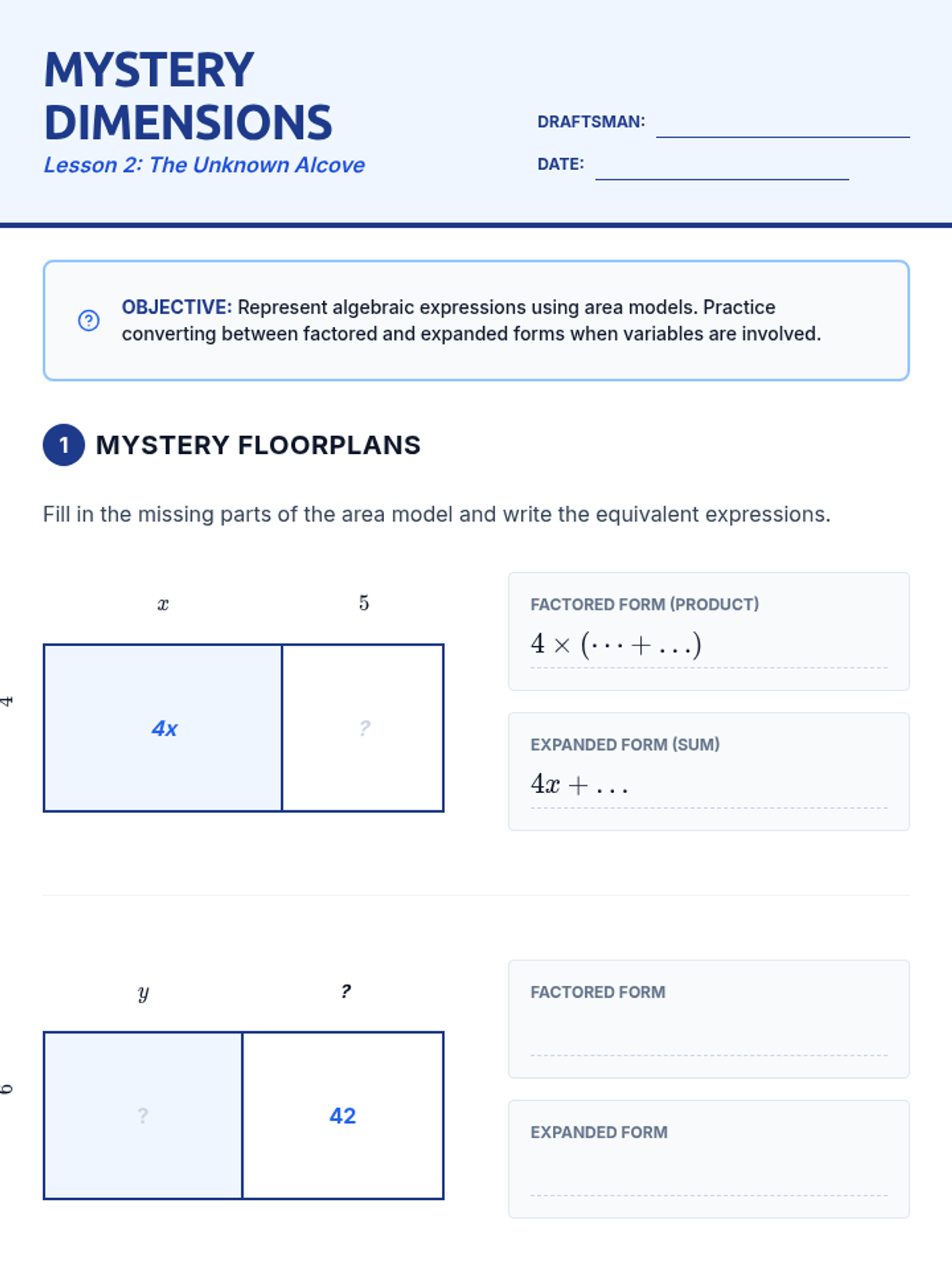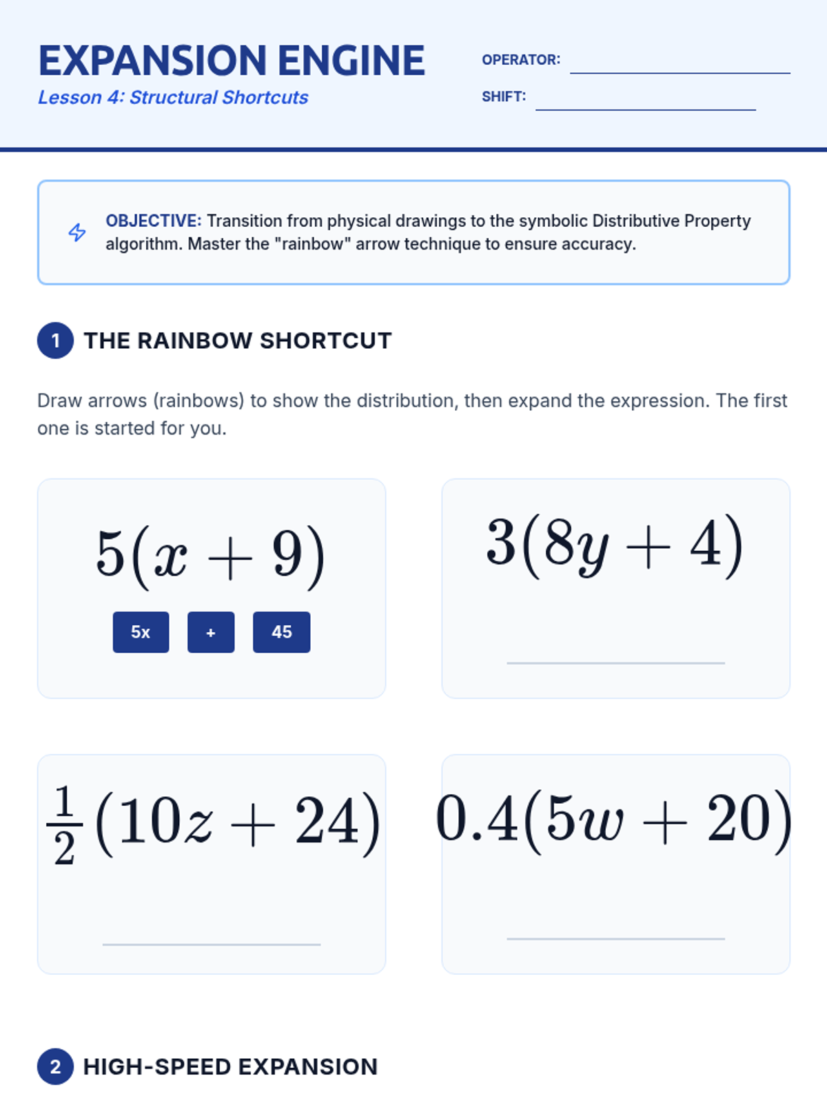 This inquiry-based sequence utilizes geometric area models to conceptualize the distributive property. Students move from concrete arithmetic to abstract algebraic manipulation, eventually fluently expanding linear expressions with rational coefficients.