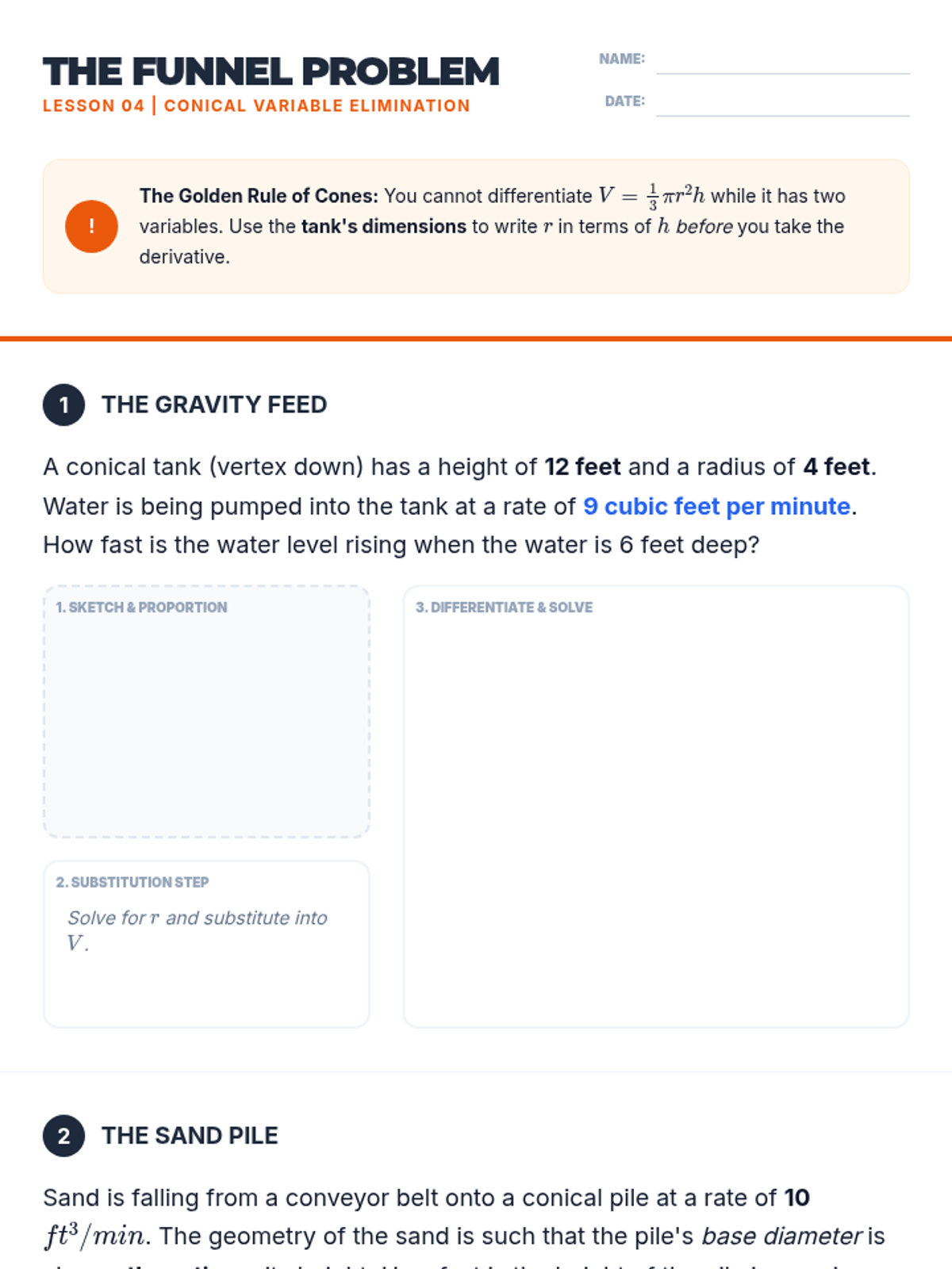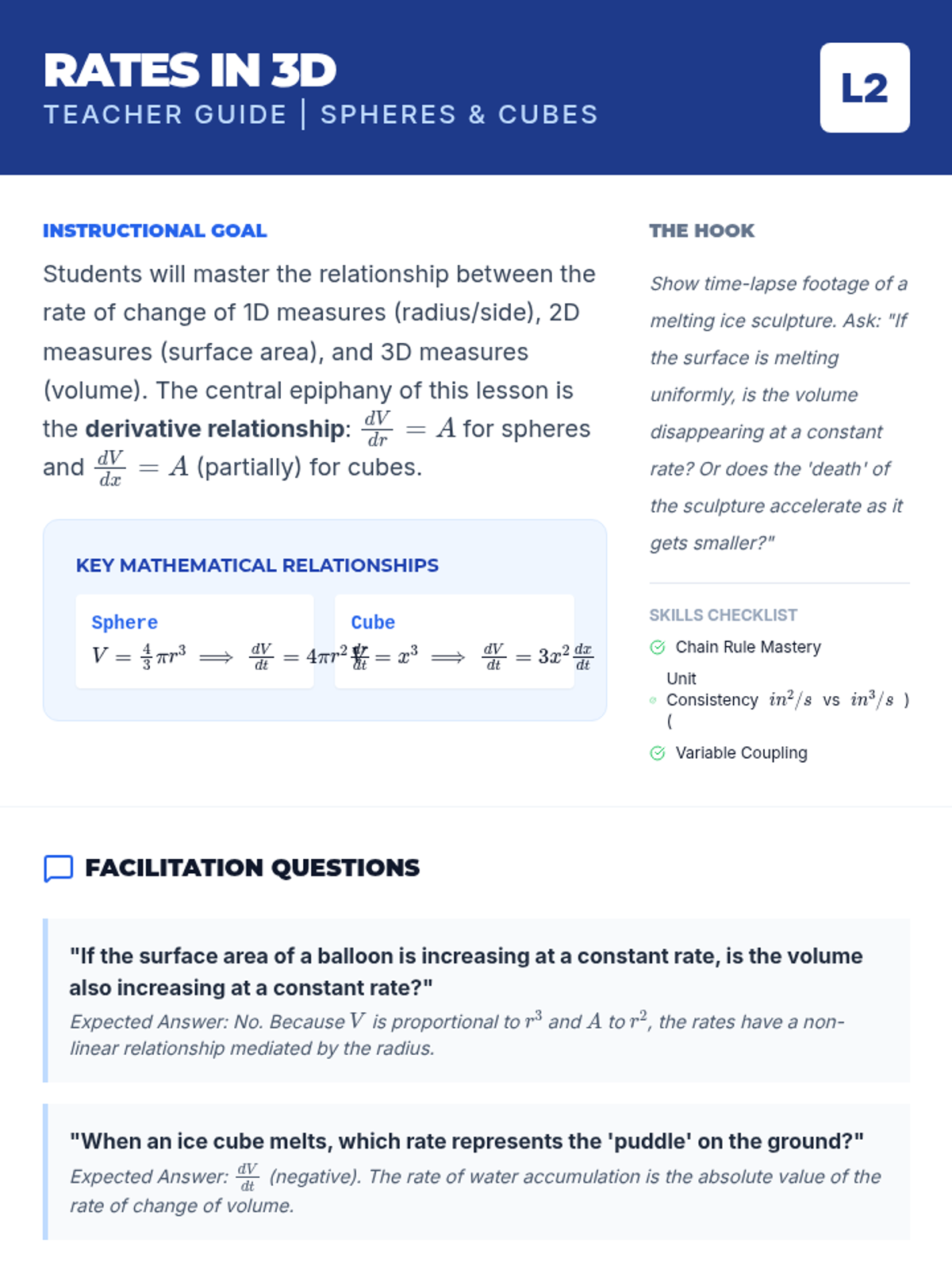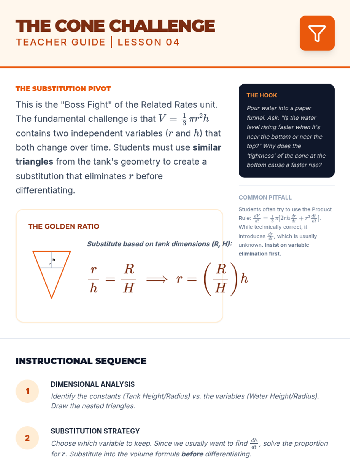 This sequence explores related rates in calculus through geometric modeling of 3D systems, including fluid dynamics and shadow propagation. Students progress from 2D similar triangle models to complex 3D variable elimination in conical tanks.