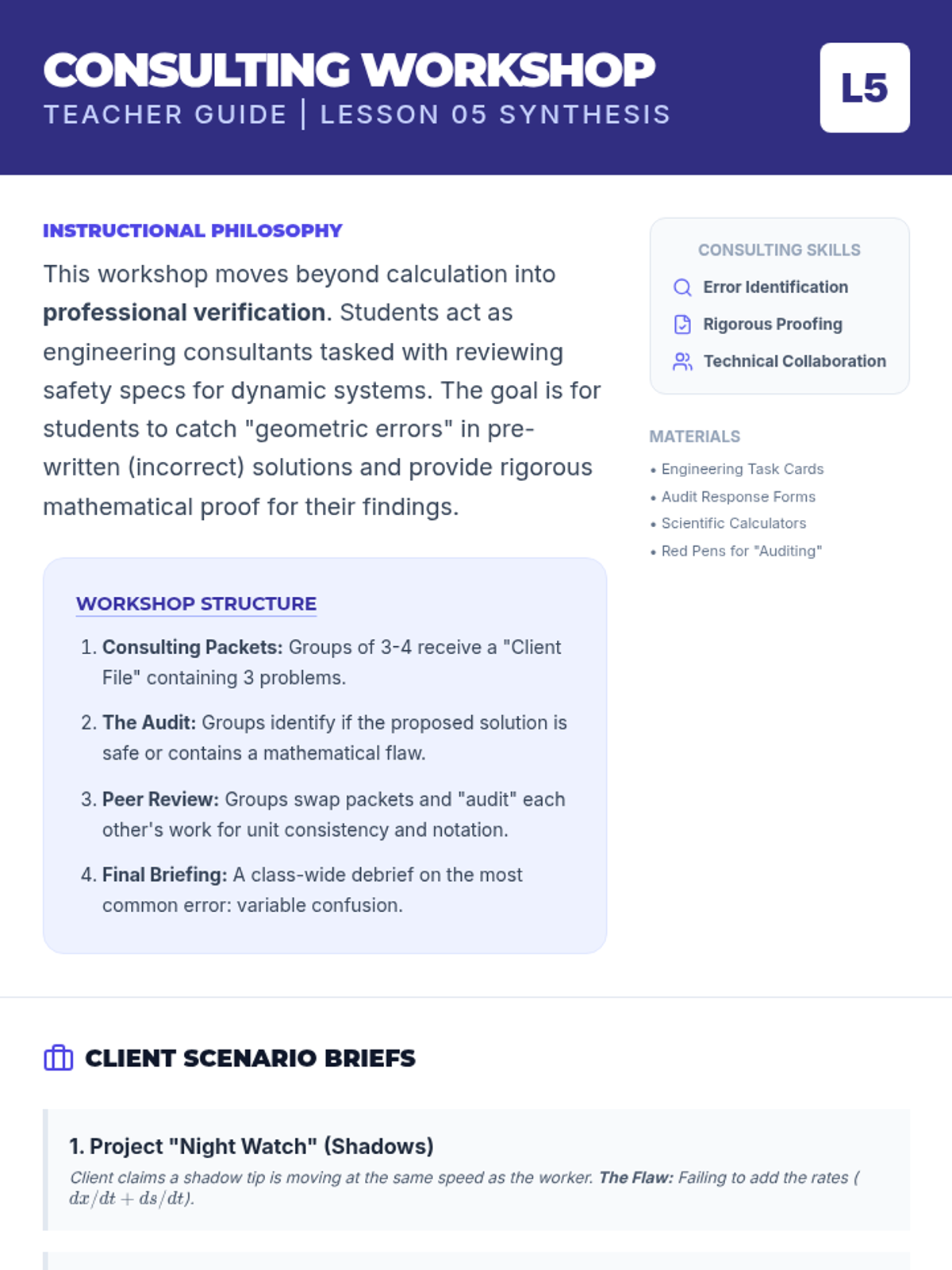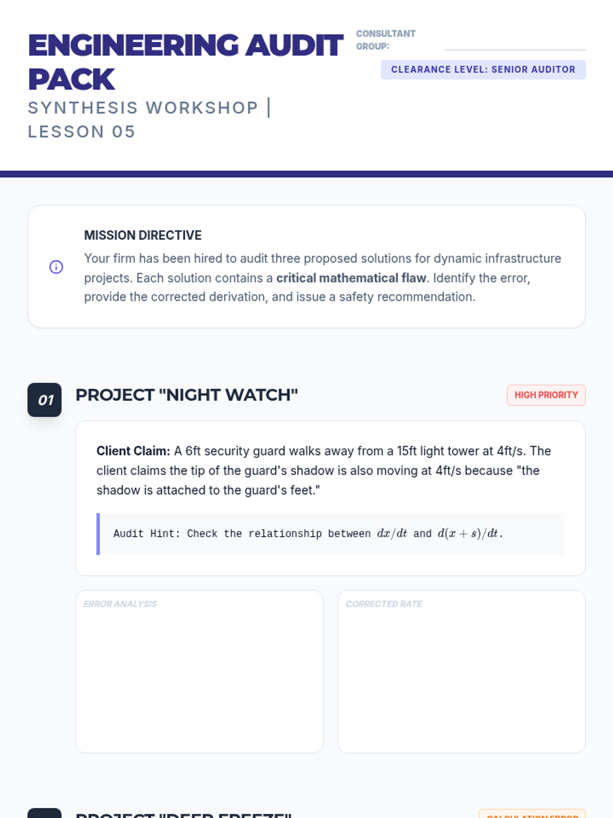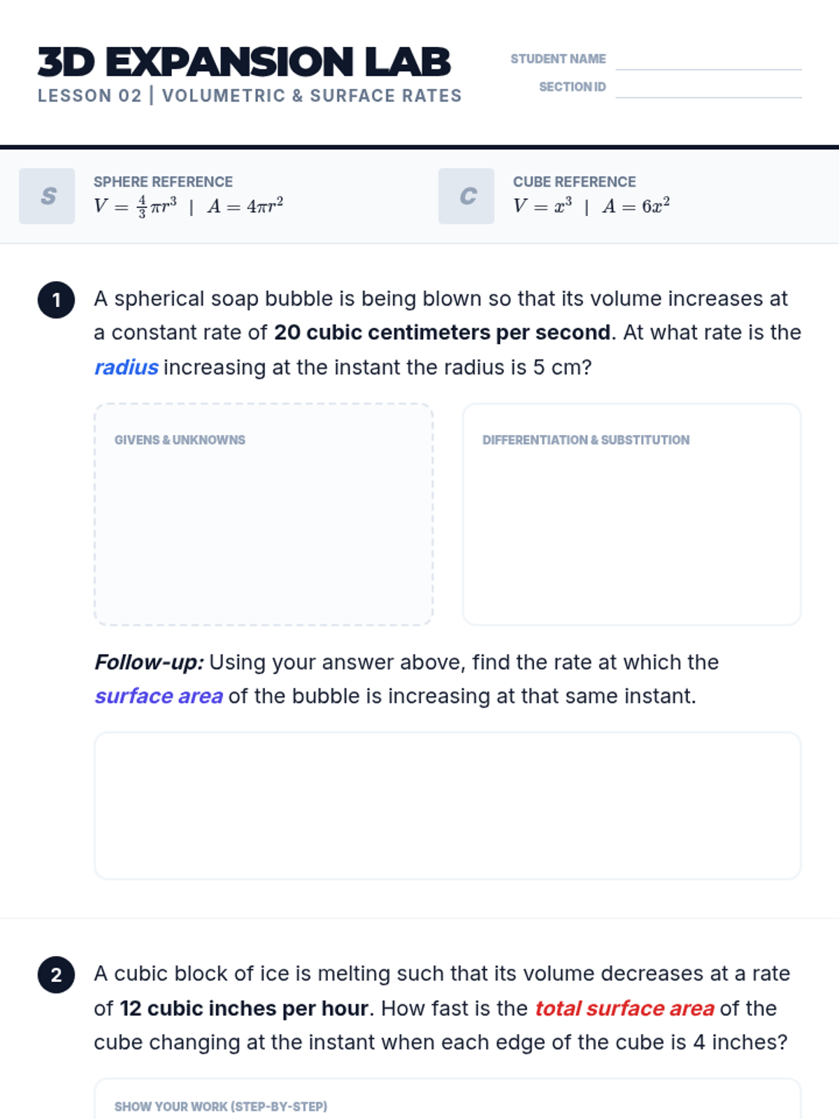 This sequence explores related rates in calculus through geometric modeling of 3D systems, including fluid dynamics and shadow propagation. Students progress from 2D similar triangle models to complex 3D variable elimination in conical tanks.
