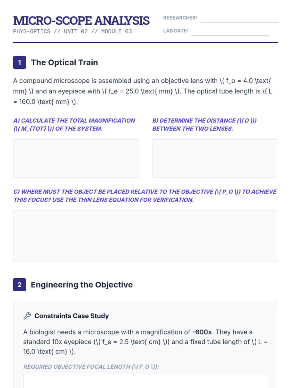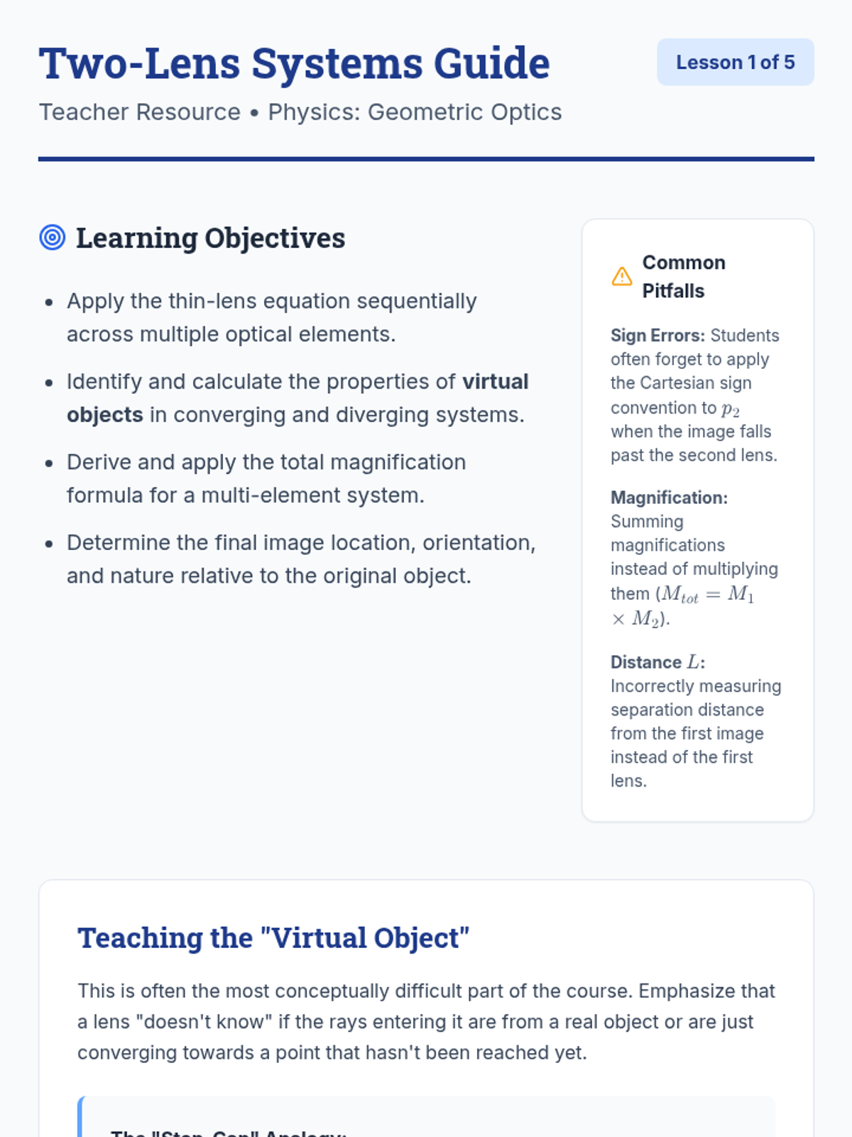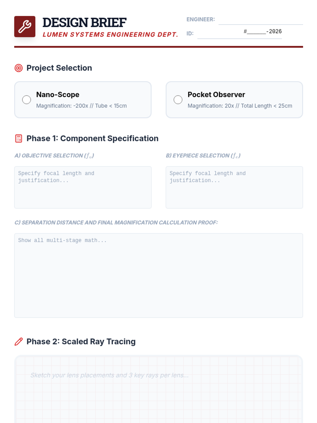 This undergraduate-level physics sequence explores the design and analysis of multi-element optical instruments, moving from simple two-lens systems to complex microscopes, telescopes, and the human eye. Students apply geometric optics principles to solve engineering-style design challenges.