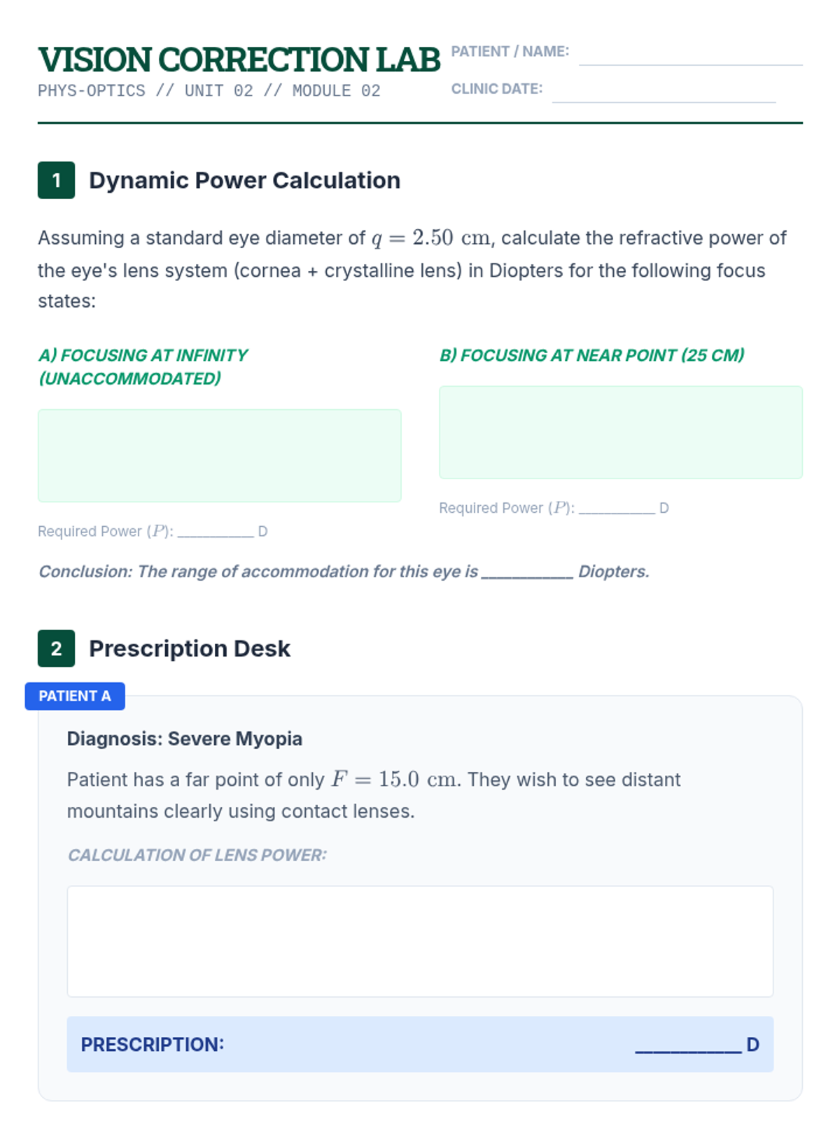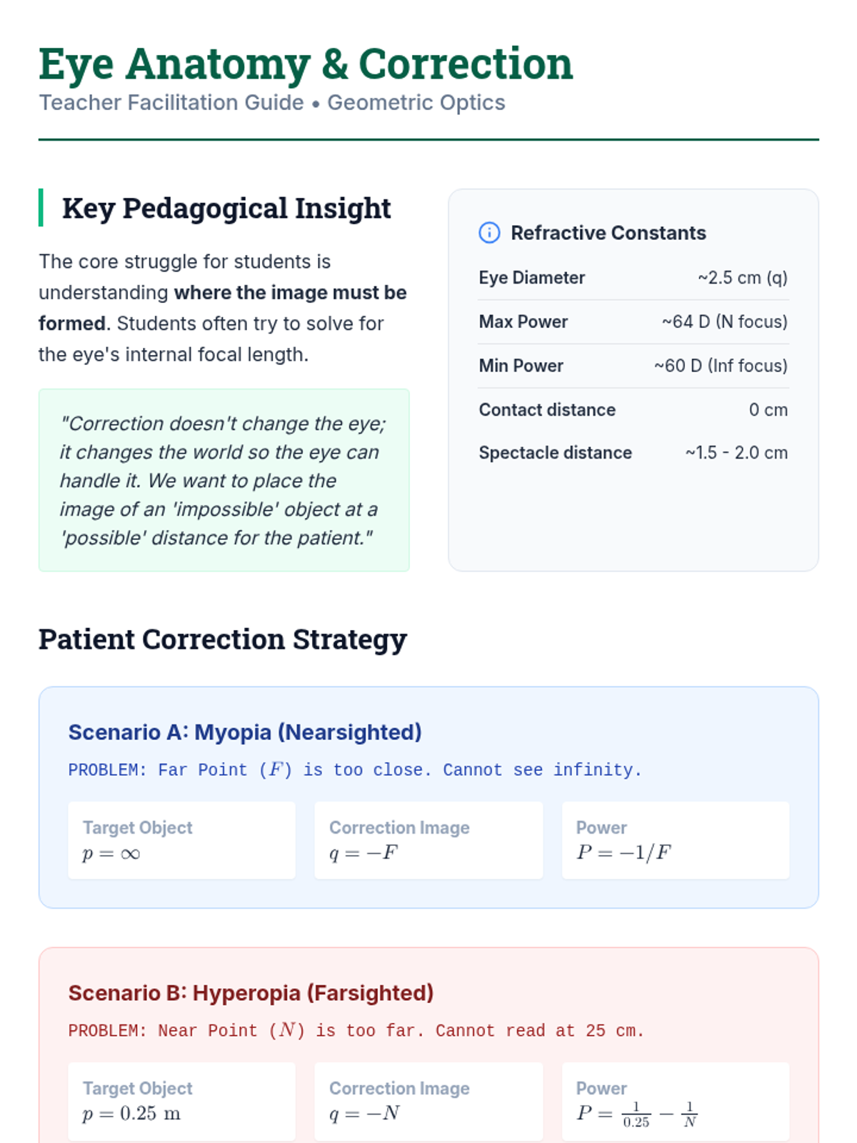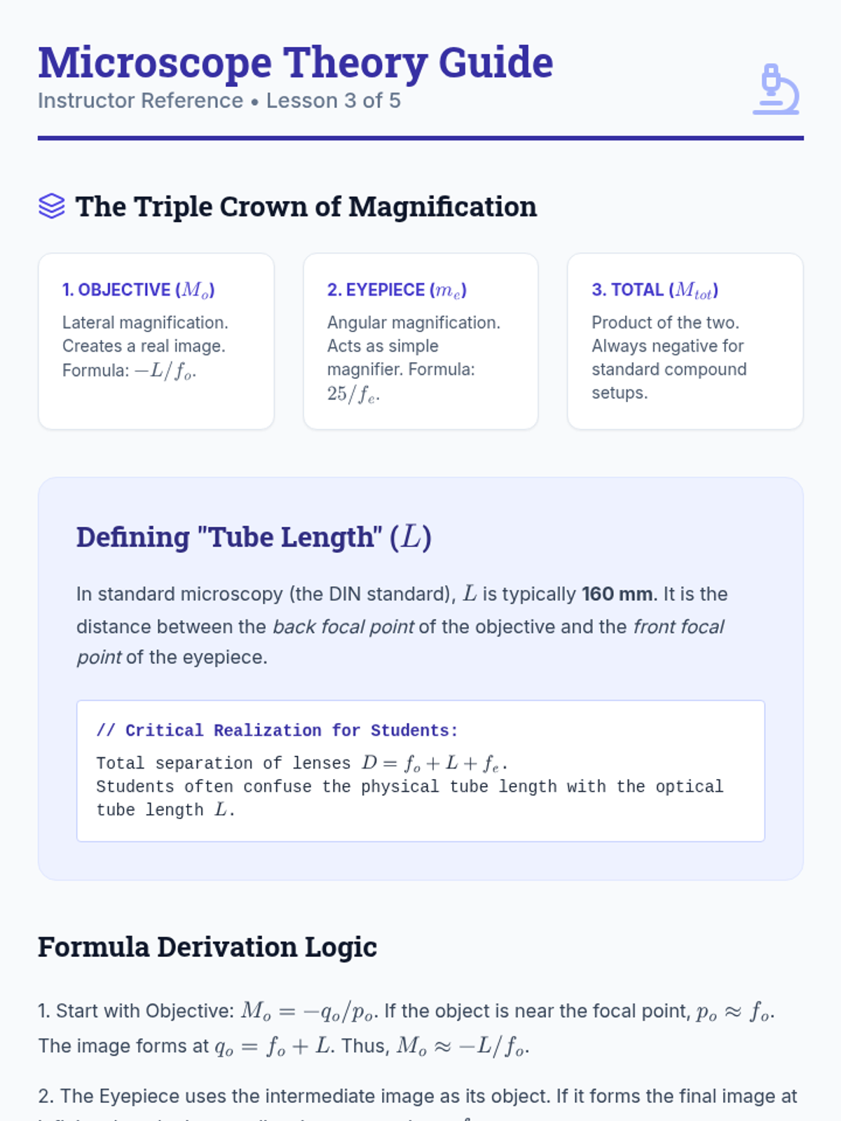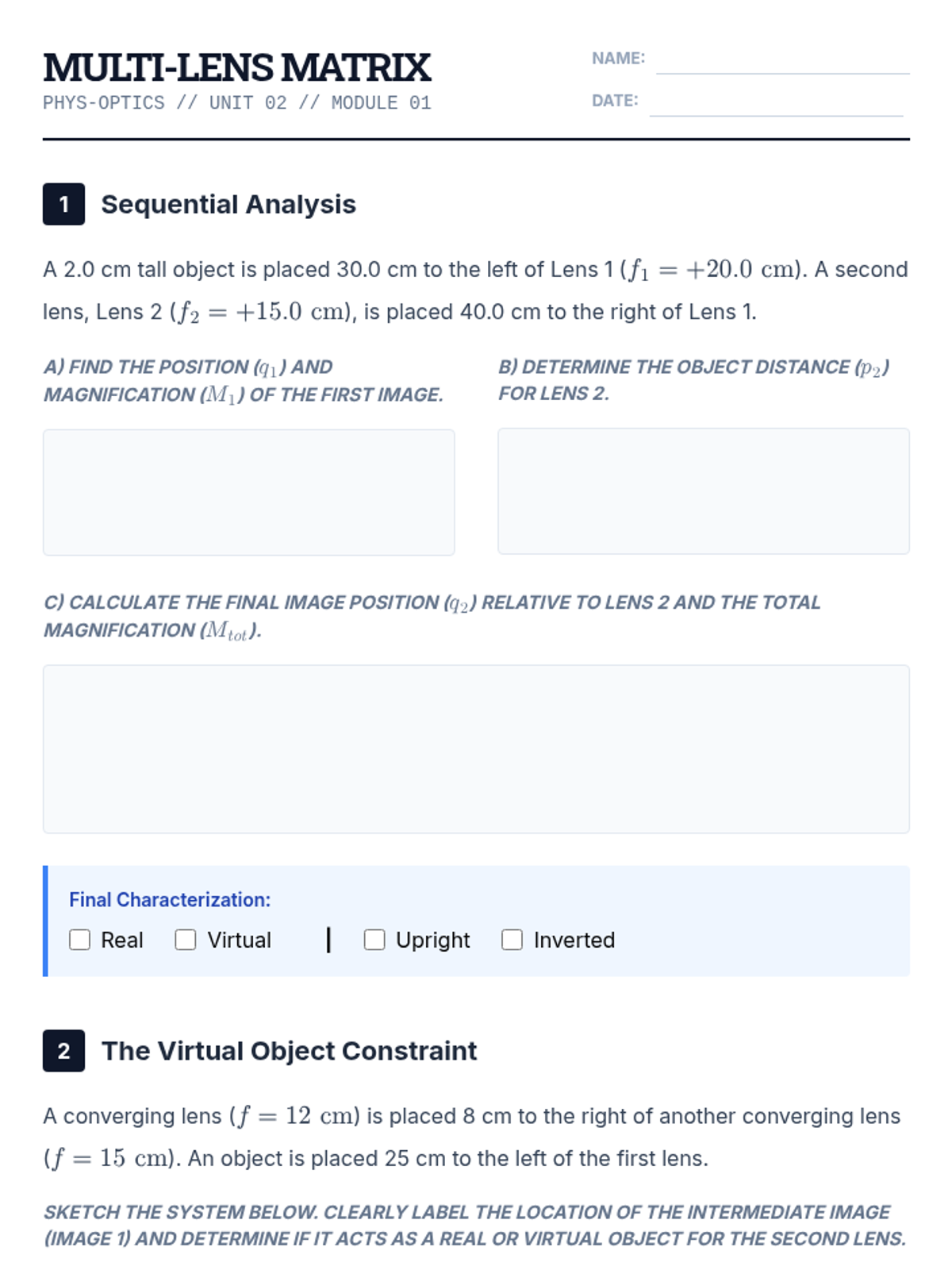 This undergraduate-level physics sequence explores the design and analysis of multi-element optical instruments, moving from simple two-lens systems to complex microscopes, telescopes, and the human eye. Students apply geometric optics principles to solve engineering-style design challenges.