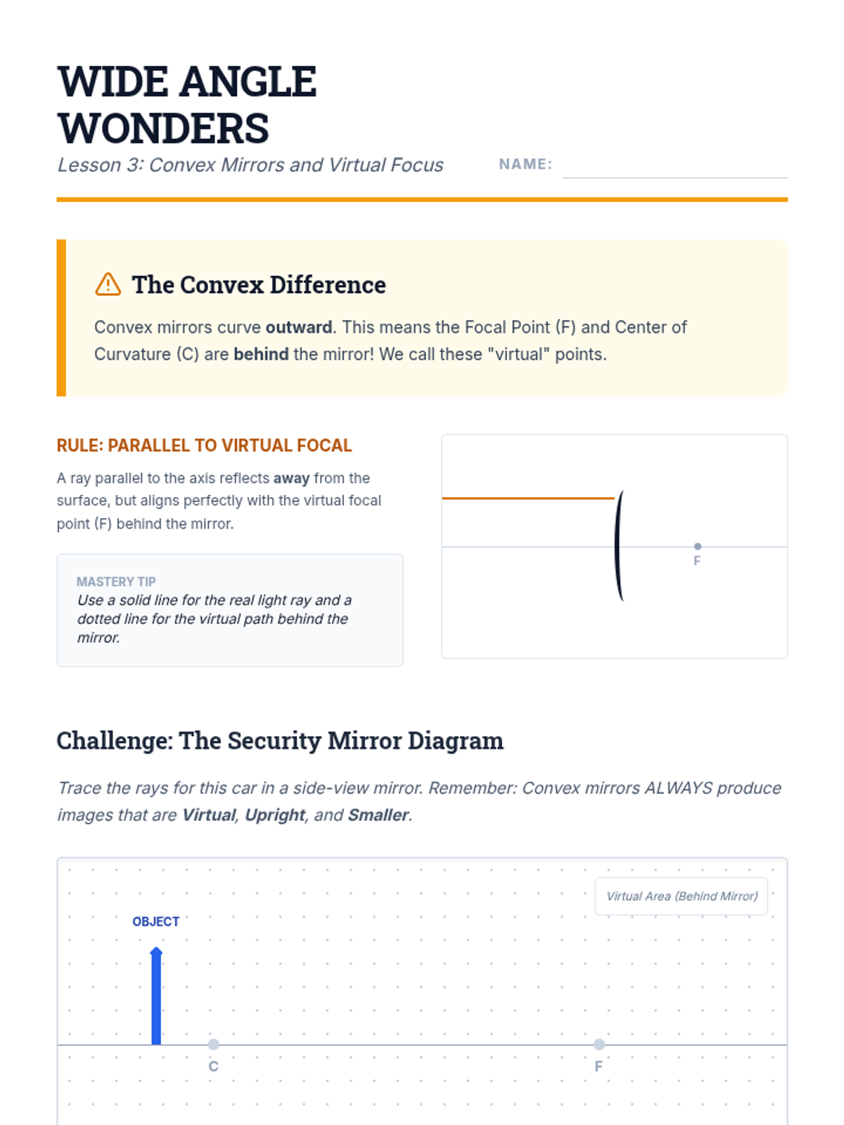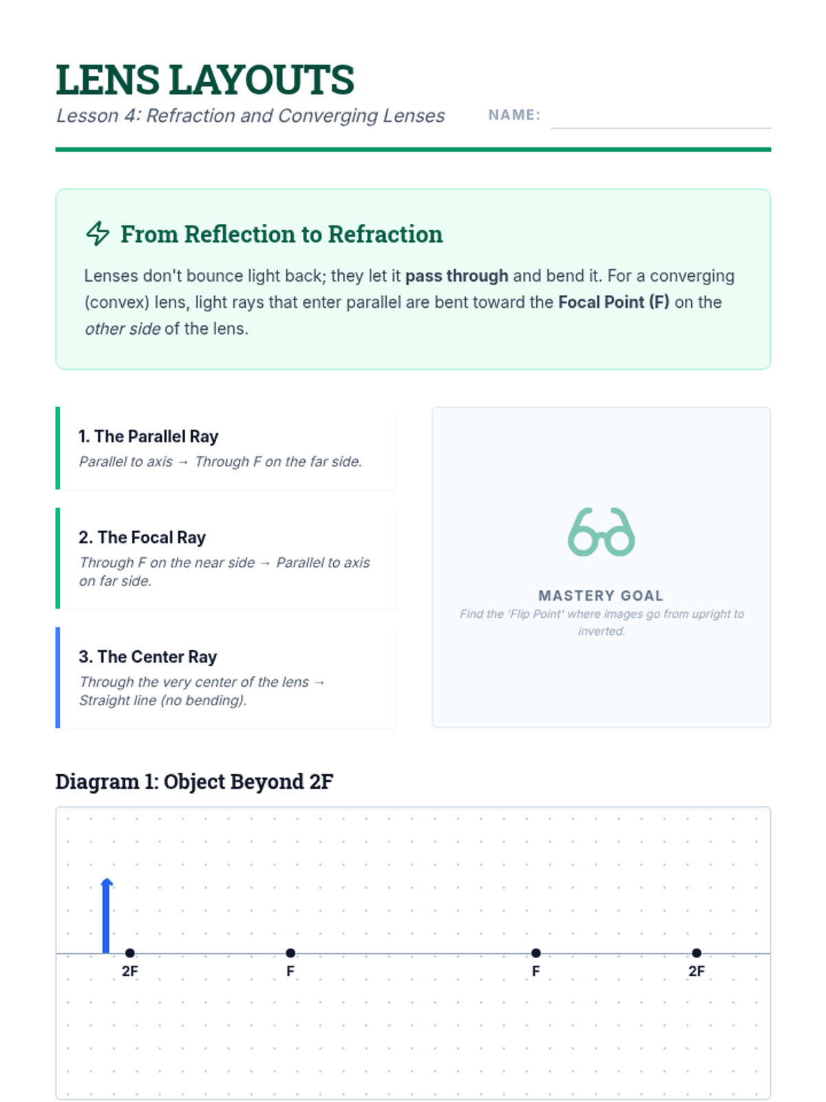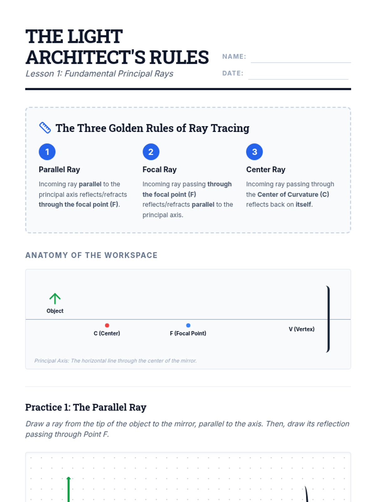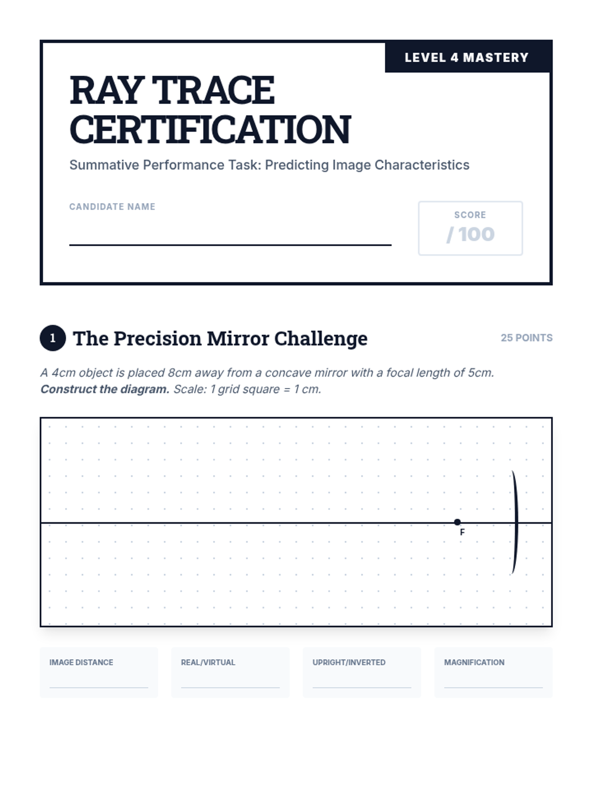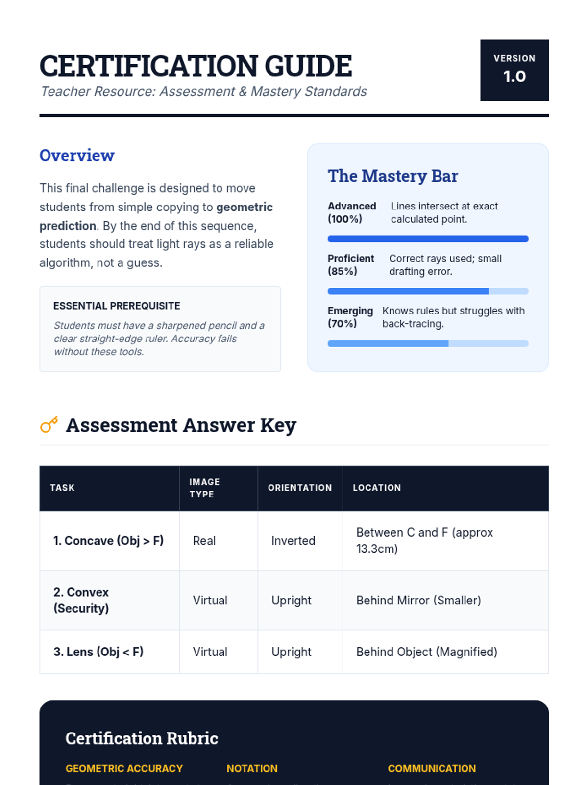 A mastery-based sequence for 8th-grade students focusing on the geometric construction of ray diagrams for mirrors and lenses. Students move from learning the fundamental rules of principal rays to independently predicting image location, orientation, and size through precise technical drawing.