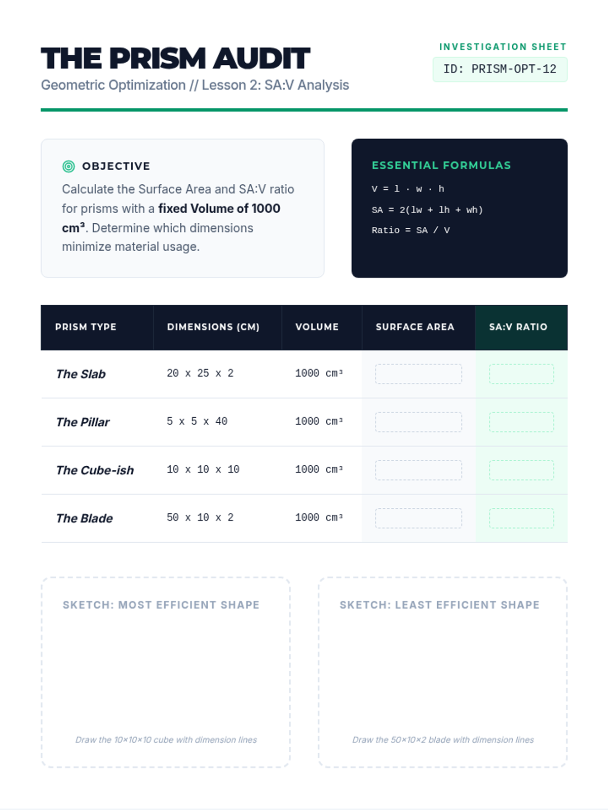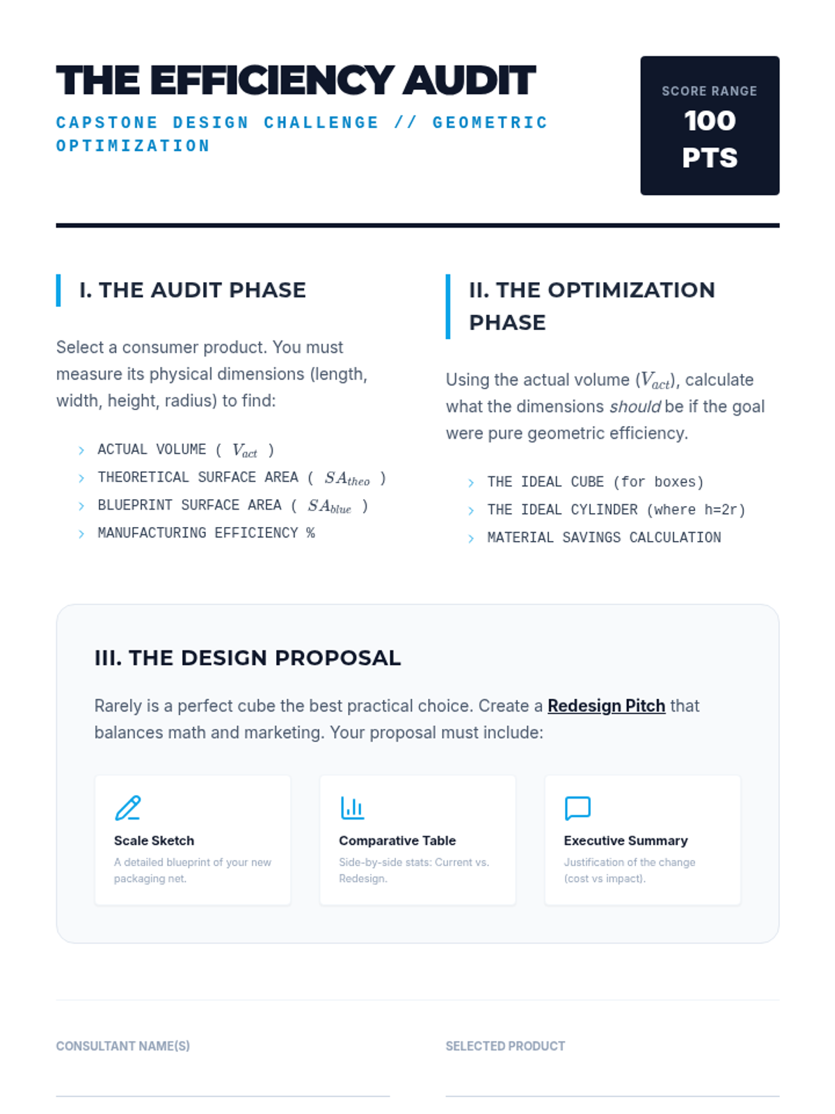 A high-school geometry sequence focusing on the mathematical relationship between surface area and volume to solve optimization problems in manufacturing and design. Students progress from 2D isoperimetric problems to 3D packaging efficiency analysis.