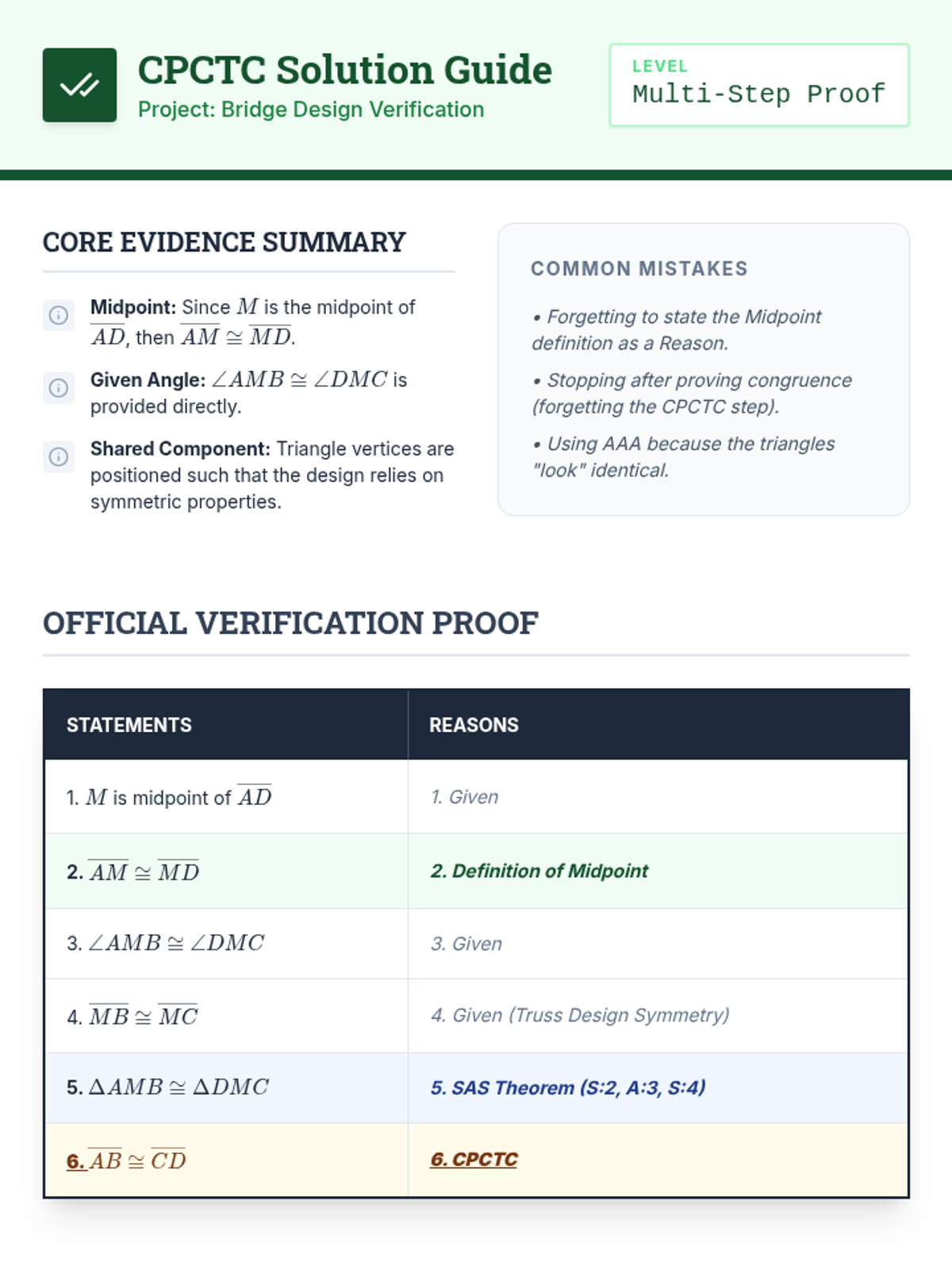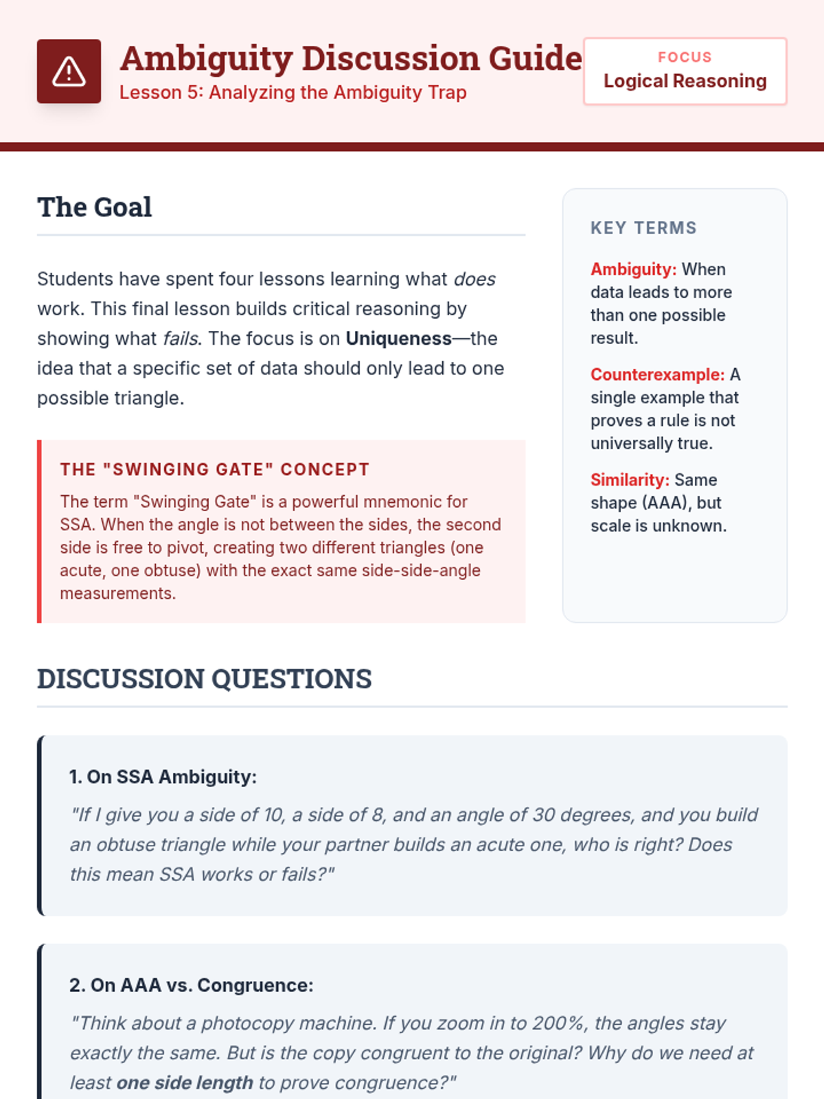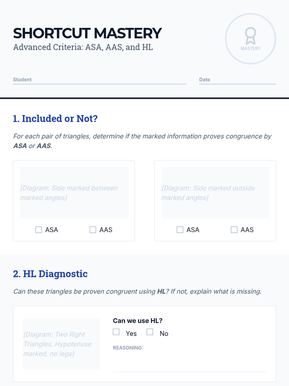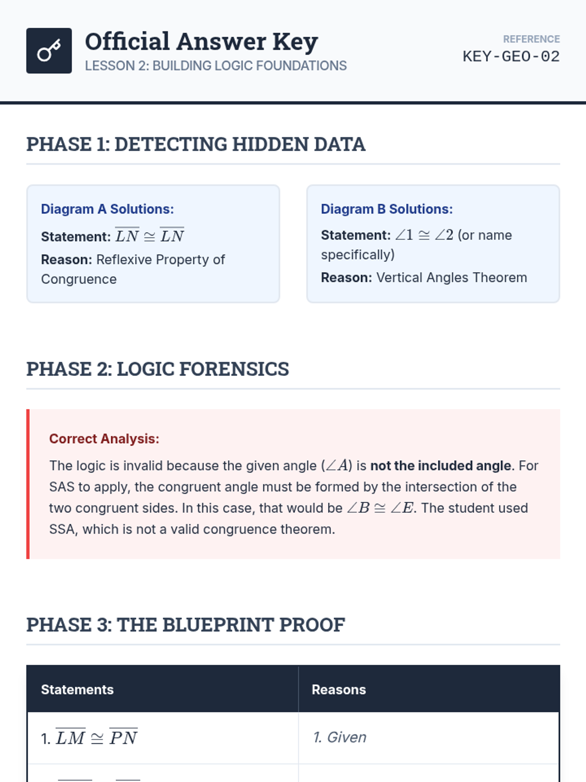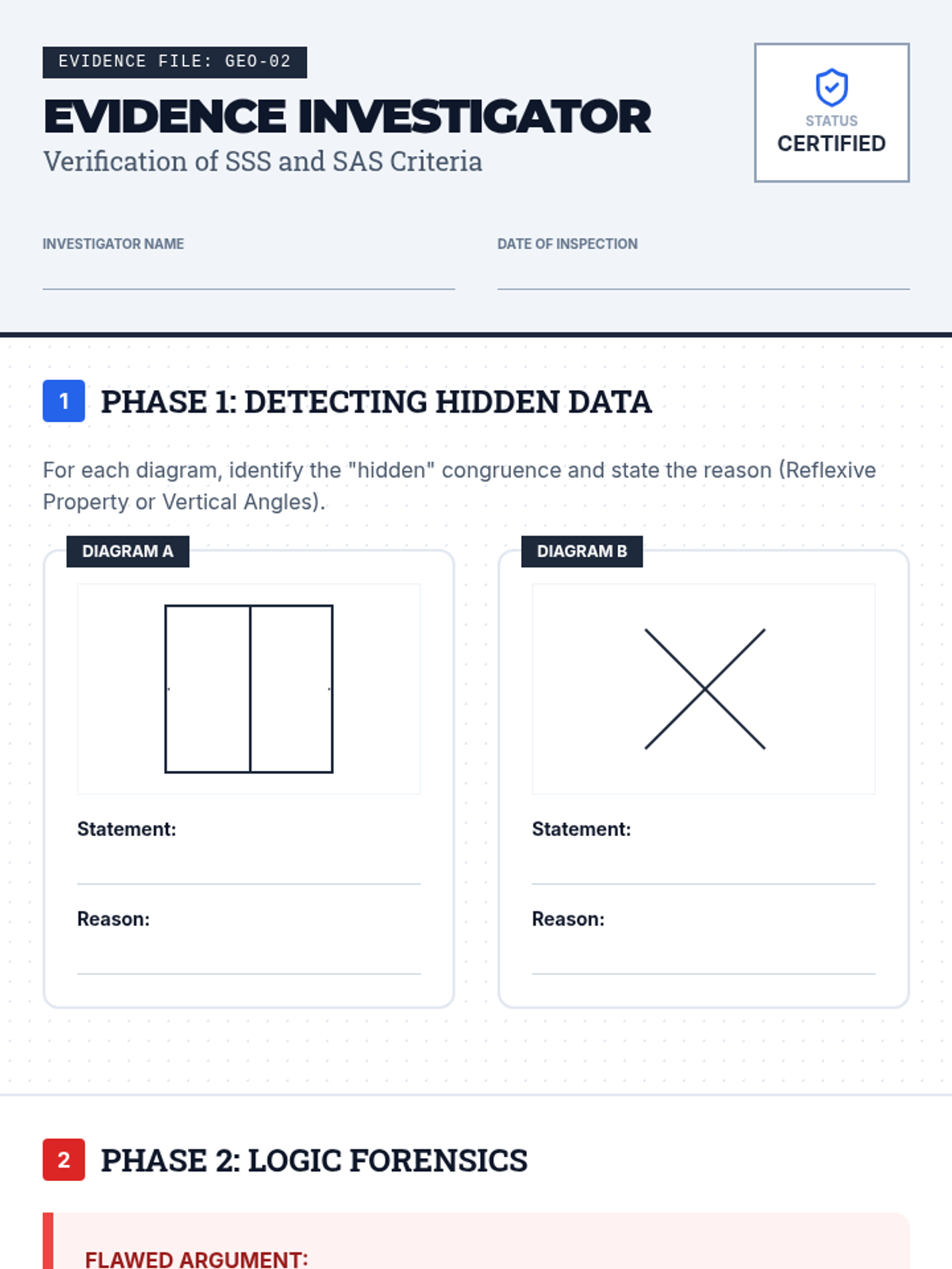 This geometry sequence guides 9th-grade students through the transition from intuitive triangle congruence to formal logical proofs. Students explore SSS, SAS, ASA, AAS, and HL criteria, learn to identify 'hidden' information in diagrams, and apply CPCTC to solve complex geometric problems.