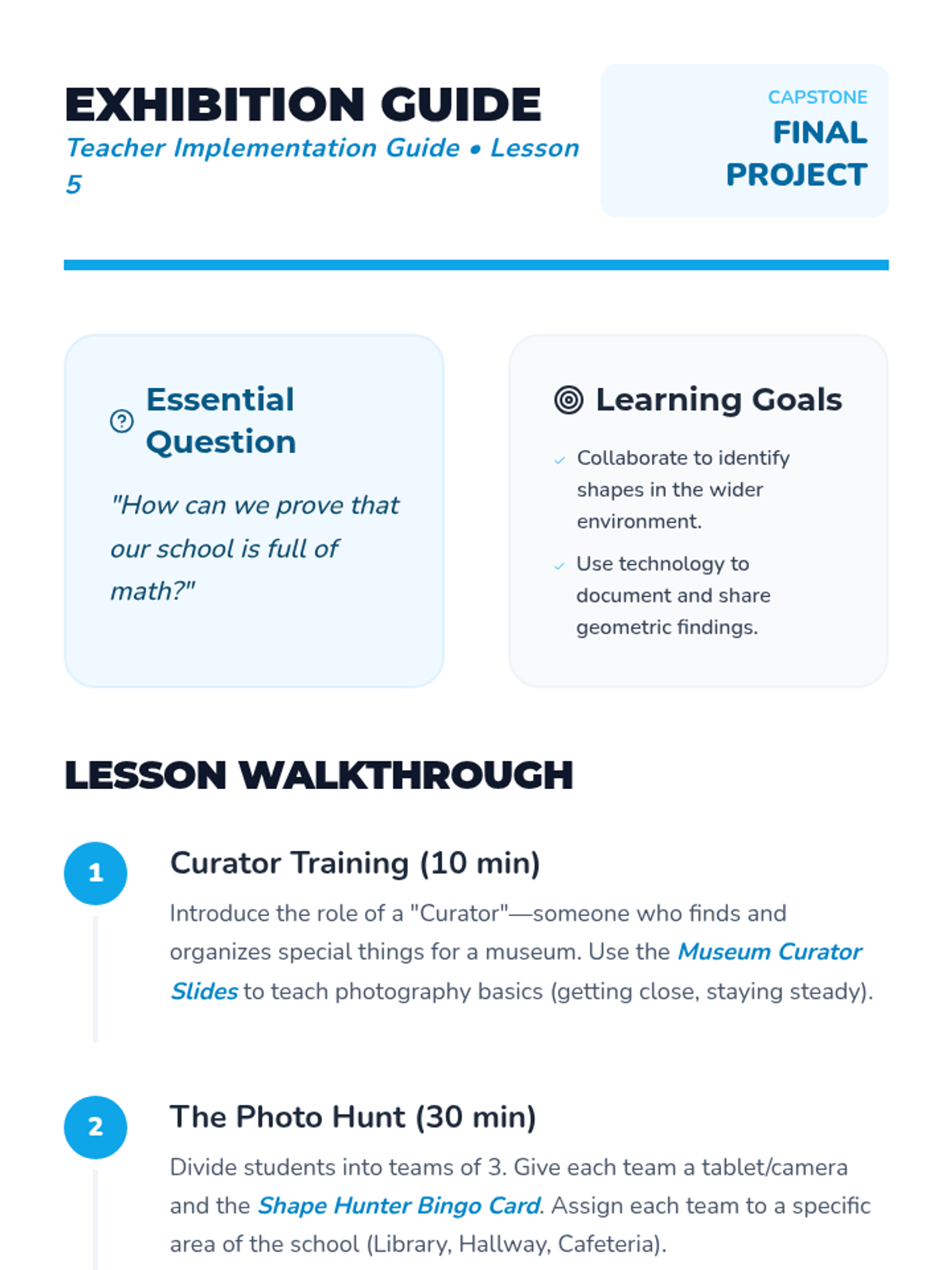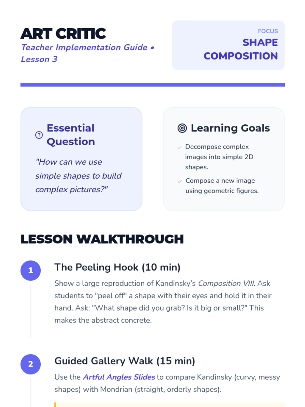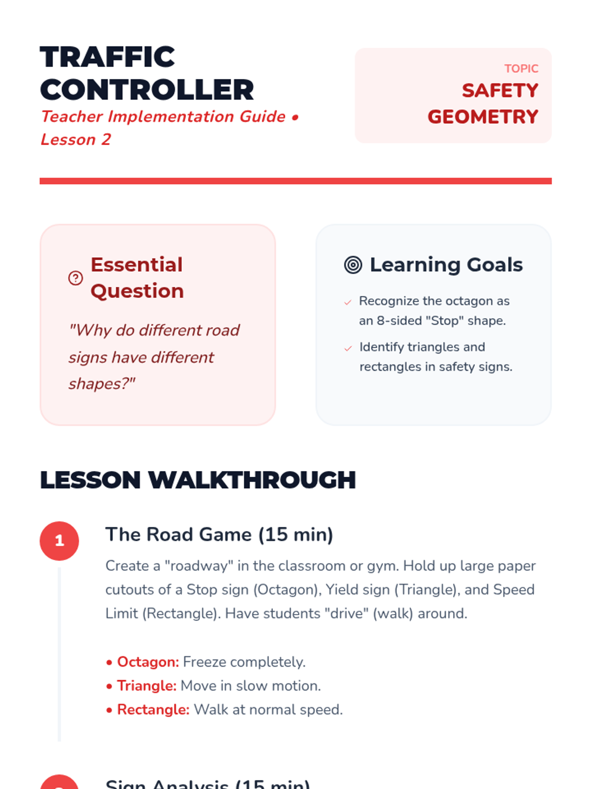 This sequence bridges abstract geometry with the physical world, encouraging Kindergarten students to recognize 2D shapes in their everyday environment. Through classroom hunts, traffic sign analysis, art exploration, and nature walks, students learn to identify and categorize circles, squares, triangles, rectangles, and more in real-life contexts.